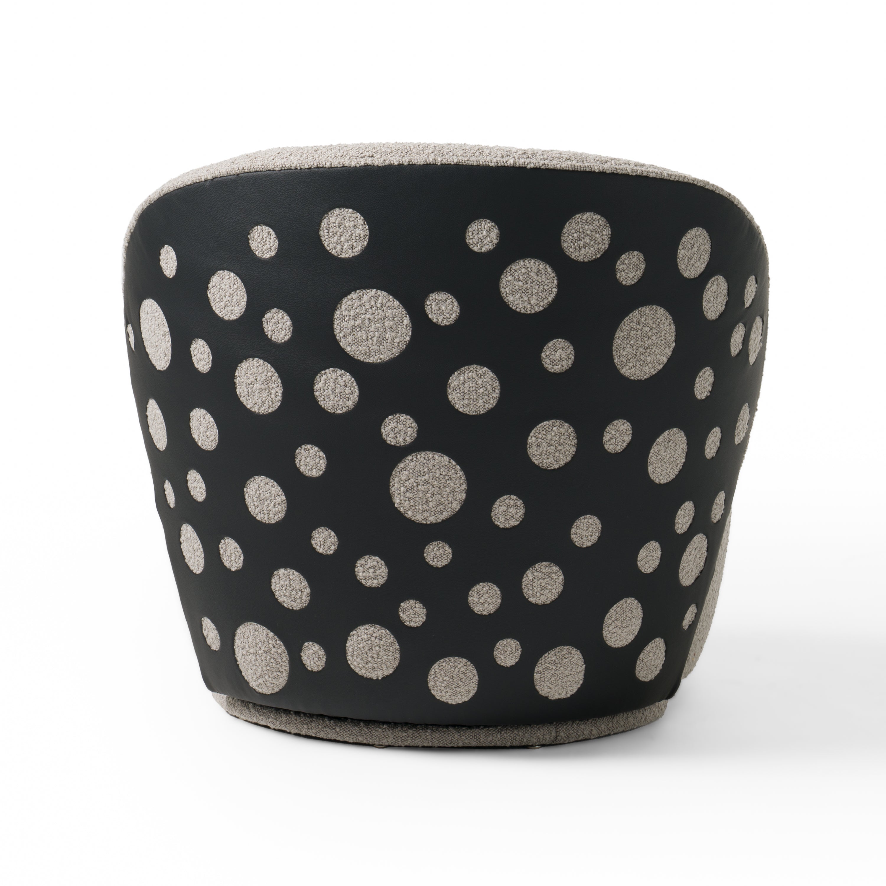 This sophisticated Curved shape Swivel Chair has Glam apperance and elegant style. The back has contrasting fabric that makes this chair an absolutely perfect accent for our Allis Sofa.