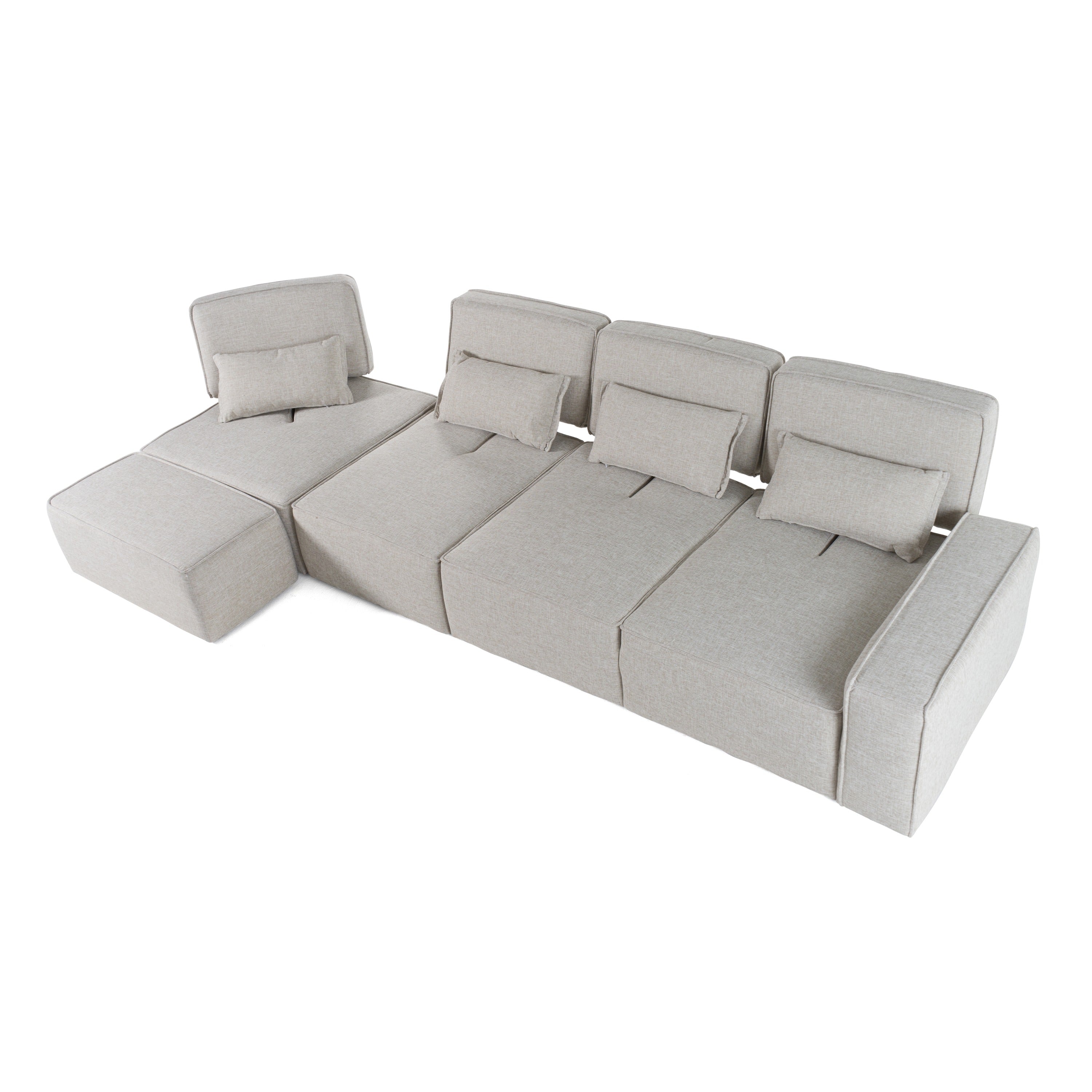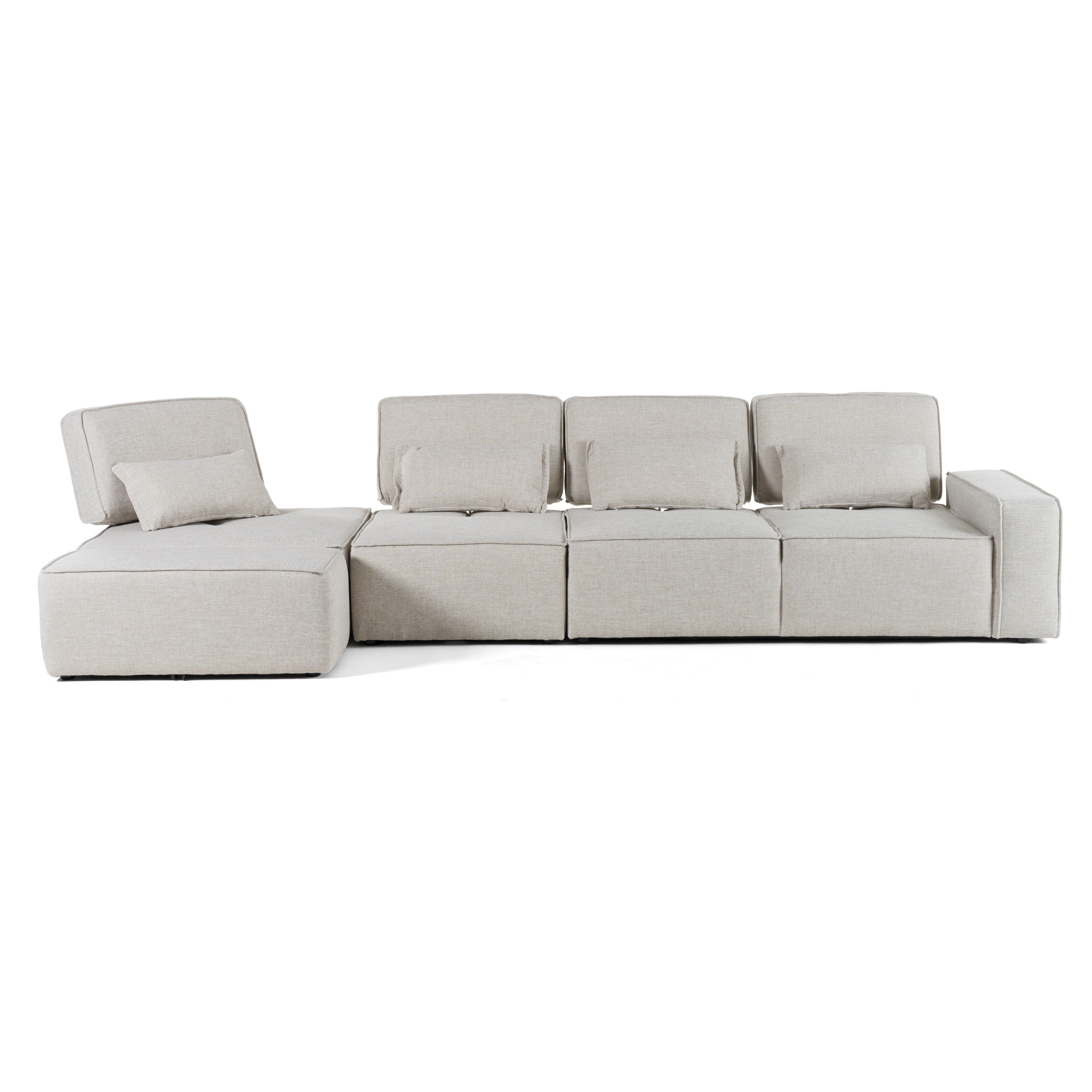 Ingenious artistry makes the Divani Casa Chapel Modern Light Grey Fabric Sectional Sofa w/ Ottoman an eye-catching piece. Designed with move-back backrests that allow you to sit in comfort depending on your whims, it is upholstered in smooth light grey 100% polyester. It includes a right-facing 2-seater comes with a track armrest, an armless chair, a corner seat and an ottoman. The stitched edges indicate durability, while the padded seats, arms, and backrests make seating comfortable that is made cozier with the accompanying rectangular throw pillows. With a compact design, this modern fabric sectional sofa w/ ottoman suits a small space and gives it a new, fresher look.