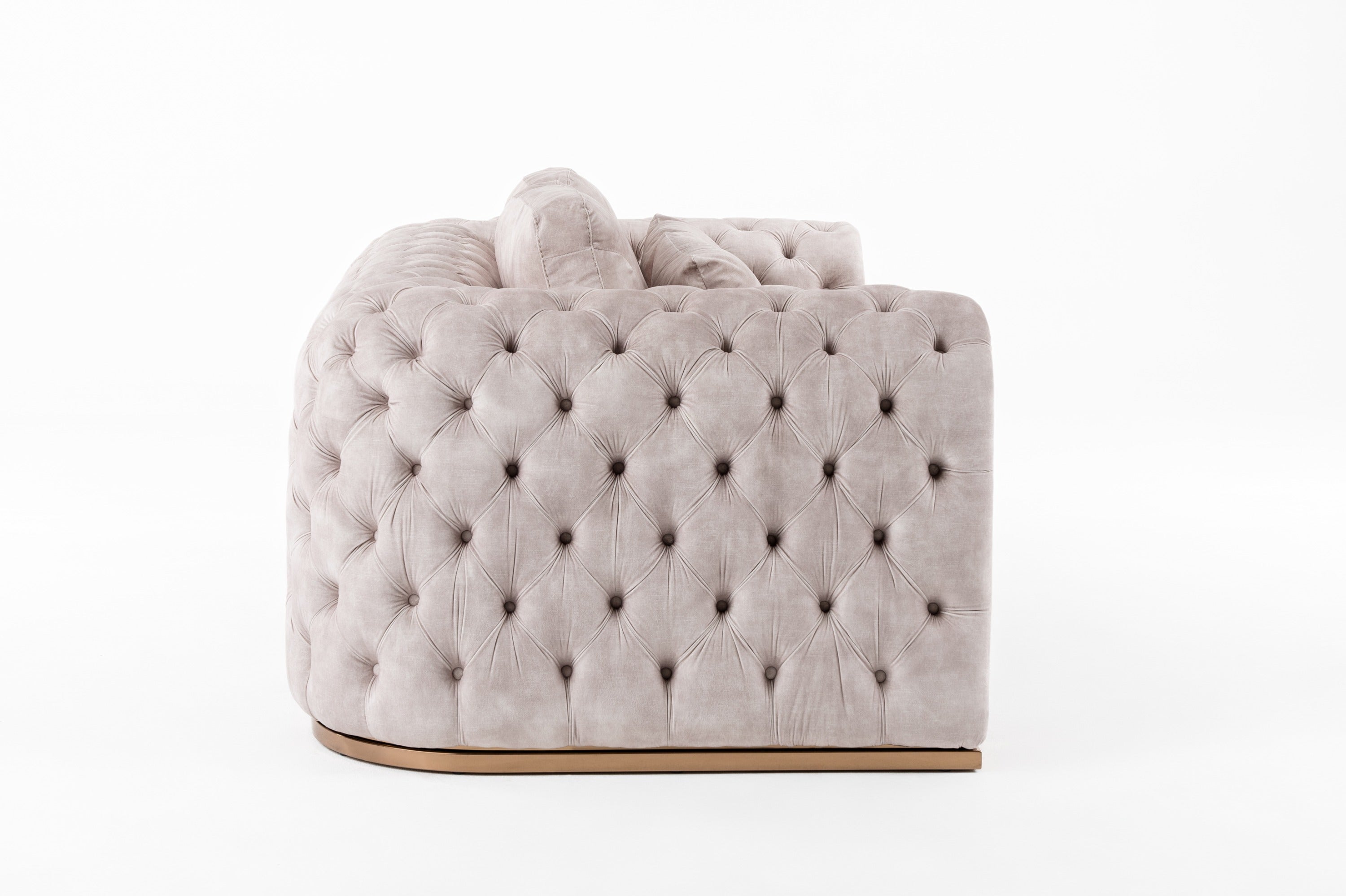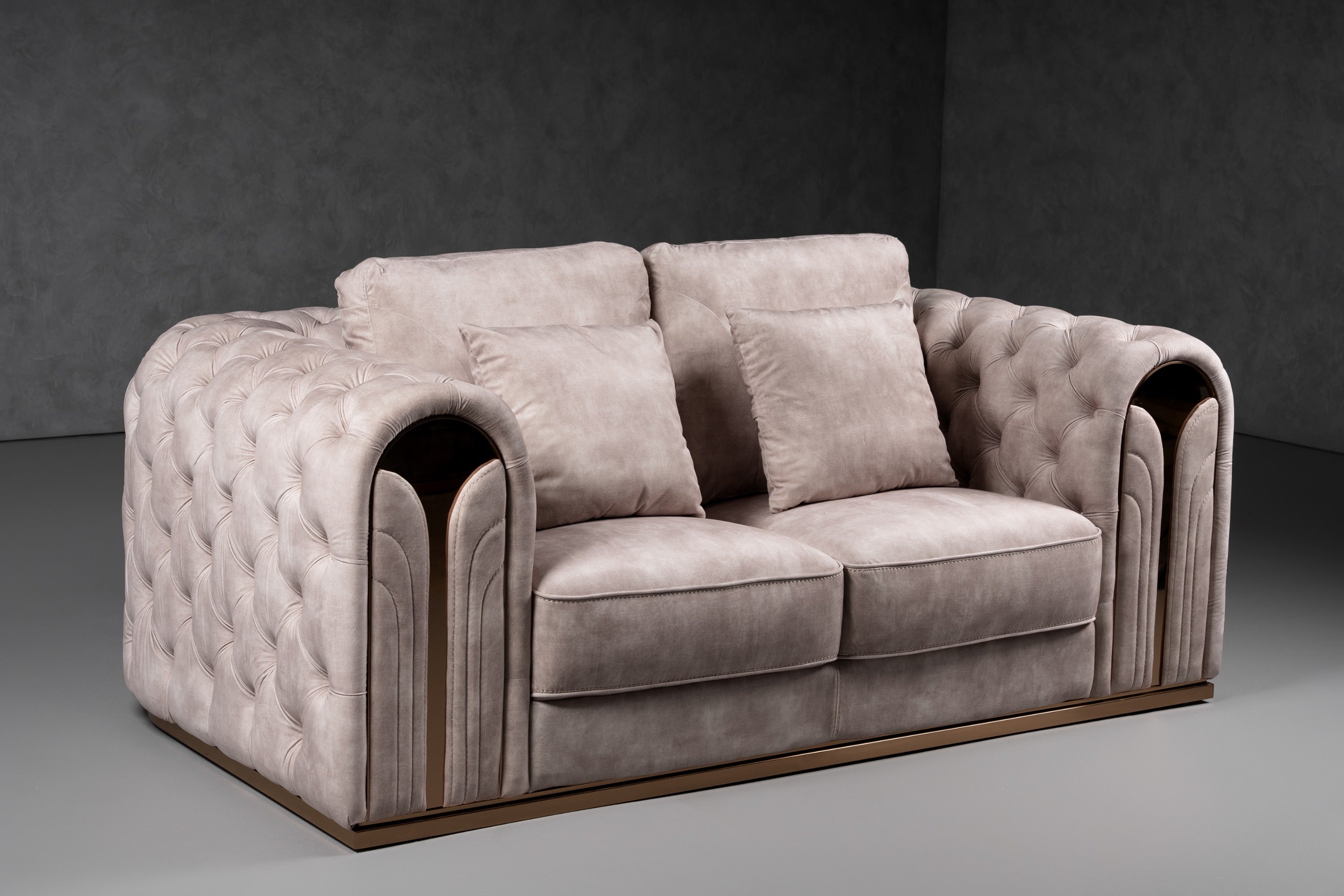 The Divani Casa Dosie Transitional Beige Velvet loveseat is a sophisticated ensemble that combines comfort and elegance. Upholstered in a luxurious beige velvet fabric. The gold stainless steel legs and accents add a touch of opulence, while the button-tufted arms and back provide a classic look. With two throw pillows included, this loveseat is perfect for lounging. The eucalyptus wood frame, foam upholstery fill, and sinuous springs seat construction ensure durability and comfort. Whether for entertaining or relaxation, this loveseat exudes timeless charm and style.