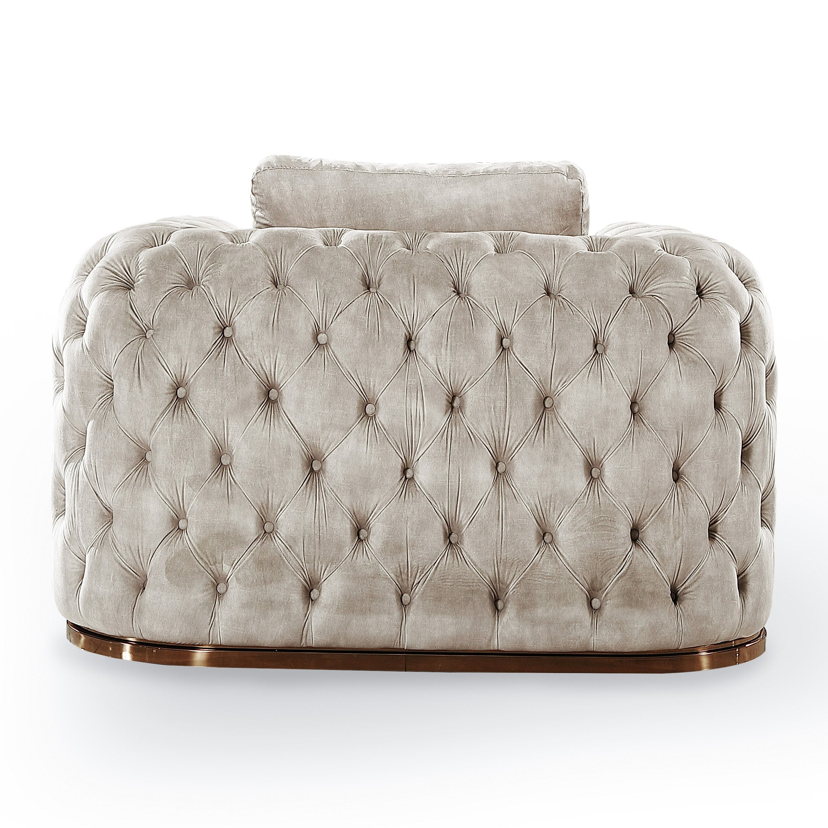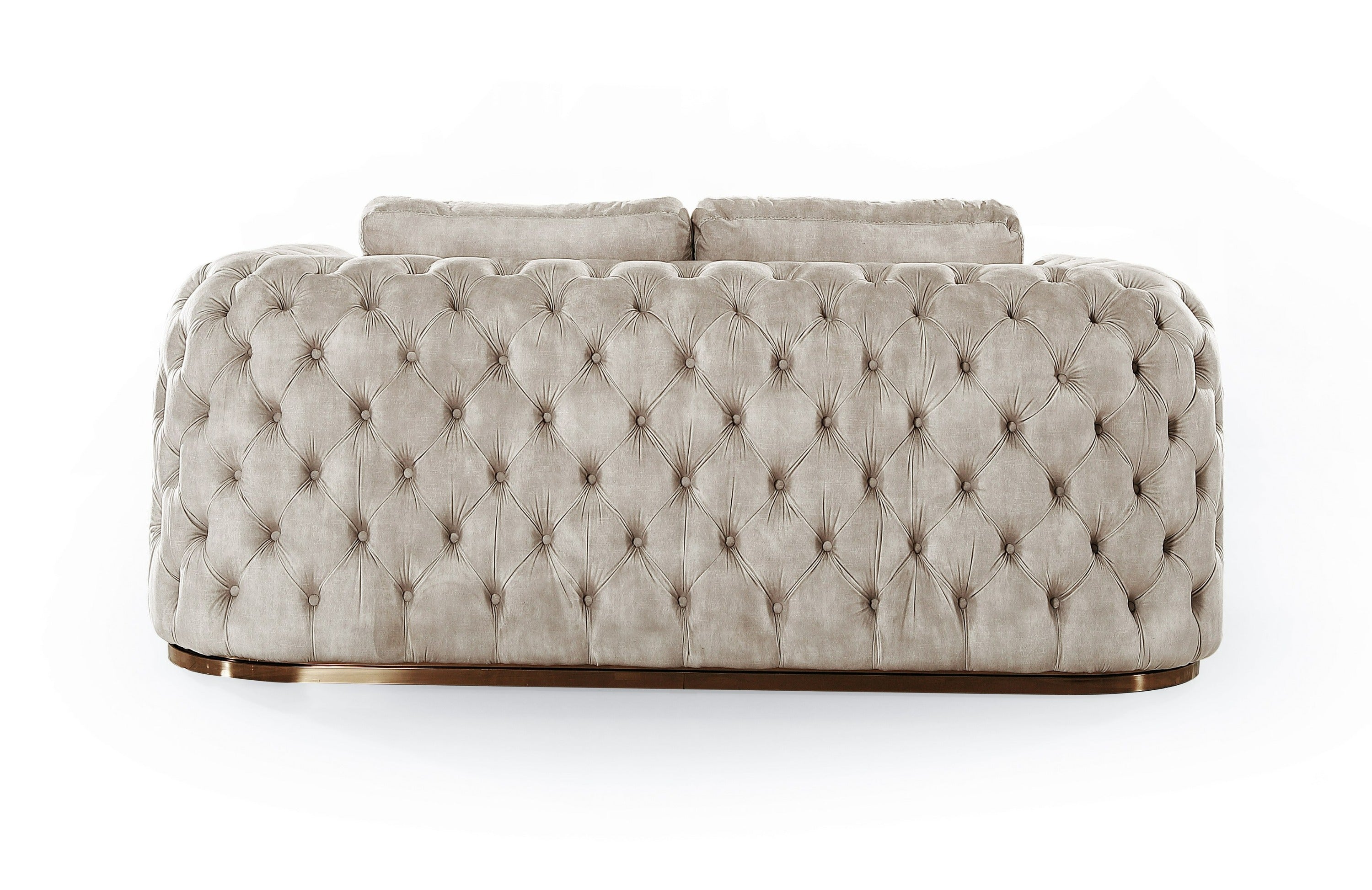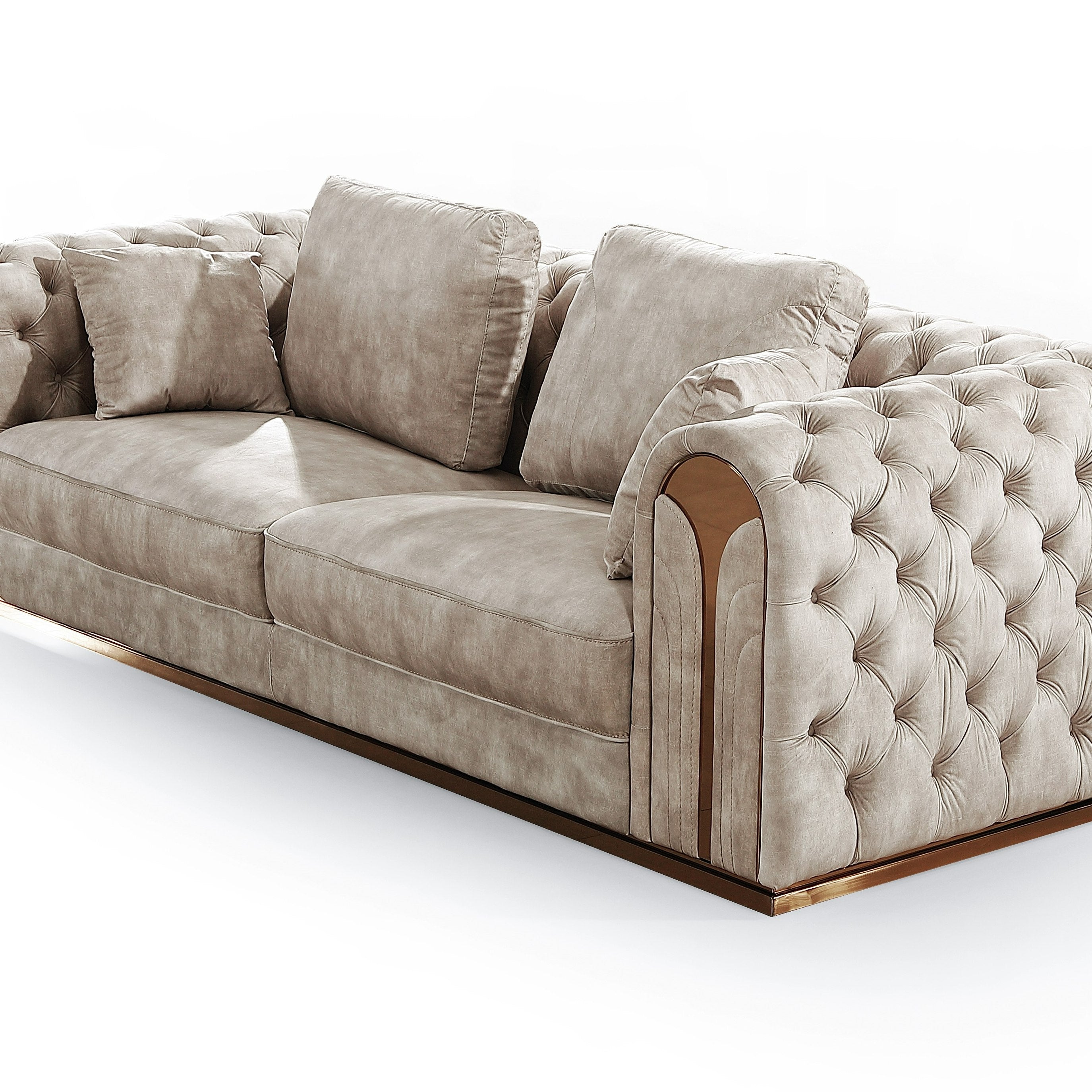 The Divani Casa Dosie Transitional Beige Velvet Sofa Set is a sophisticated ensemble that combines comfort and elegance. Upholstered in a luxurious beige velvet fabric, this set includes a sofa, loveseat, and chair. The gold stainless steel legs and accents add a touch of opulence, while the button-tufted arms and back provide a classic look. With five throw pillows included, this set is perfect for lounging. The eucalyptus wood frame, foam upholstery fill, and sinuous springs seat construction ensure durability and comfort. Whether for entertaining or relaxation, this sofa set exudes timeless charm and style.