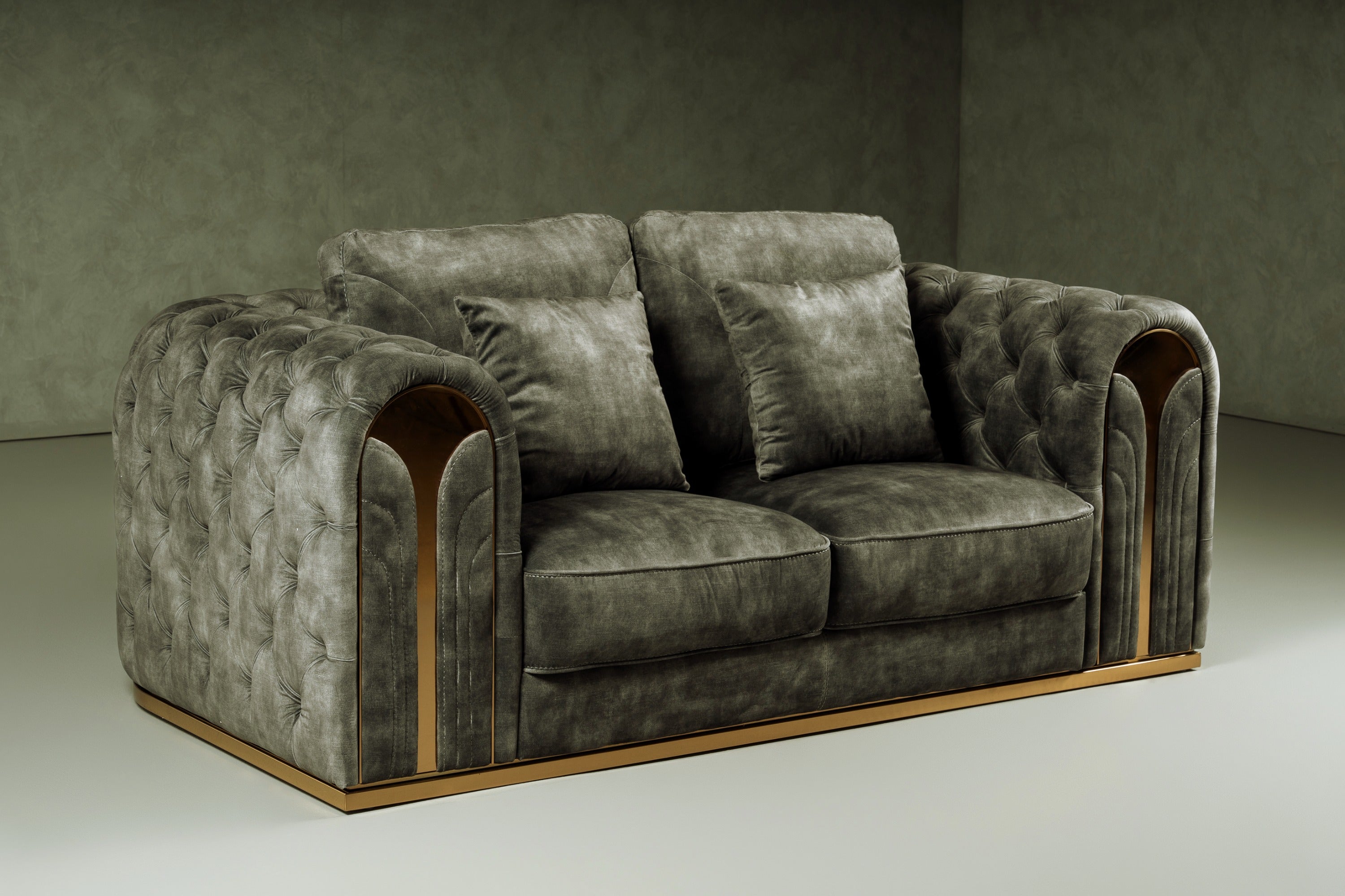 The Divani Casa Dosie Transitional Grey Velvet loveseat is a sophisticated ensemble that combines comfort and elegance. Upholstered in a luxurious grey velvet fabric. The gold stainless steel legs and accents add a touch of opulence, while the button-tufted arms and back provide a classic look. With two throw pillows included, this loveseat is perfect for lounging. The eucalyptus wood frame, foam upholstery fill, and sinuous springs seat construction ensure durability and comfort. Whether for entertaining or relaxation, this loveseat exudes timeless charm and style.