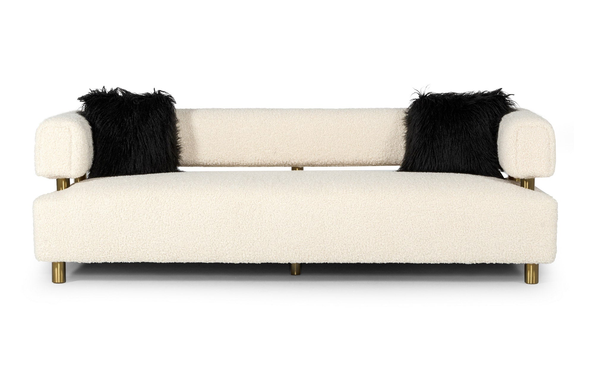 This glam-style fabric sofa features 100% polyester beige-colored upholstery, which covers the foam-filled back and seat cushions. Large enough to seat four, this couch and its tuxedo arm will provide plenty of comforts. In addition, the brushed gold stainless steel legs and black faux-fur throw pillows will add glam style to any space.