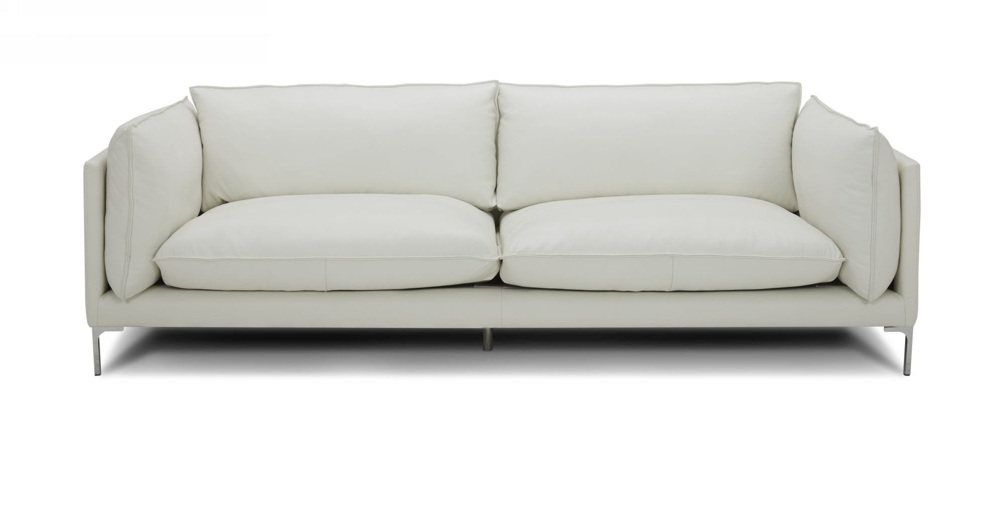 This fully upholstered modern sofa, which is available in either white L-grade leather, features two oversized cushions. In total, there are six cushions on this couch, two seat cushions, two back cushions and two arm cushions. All six cushions feature a self-welt detail. All of these fluffy cushions sit atop a tight, upholstered frame, chrome bracket style legs and tuxedo arm. This Stylish Piece is perfect for your contemporary living space.