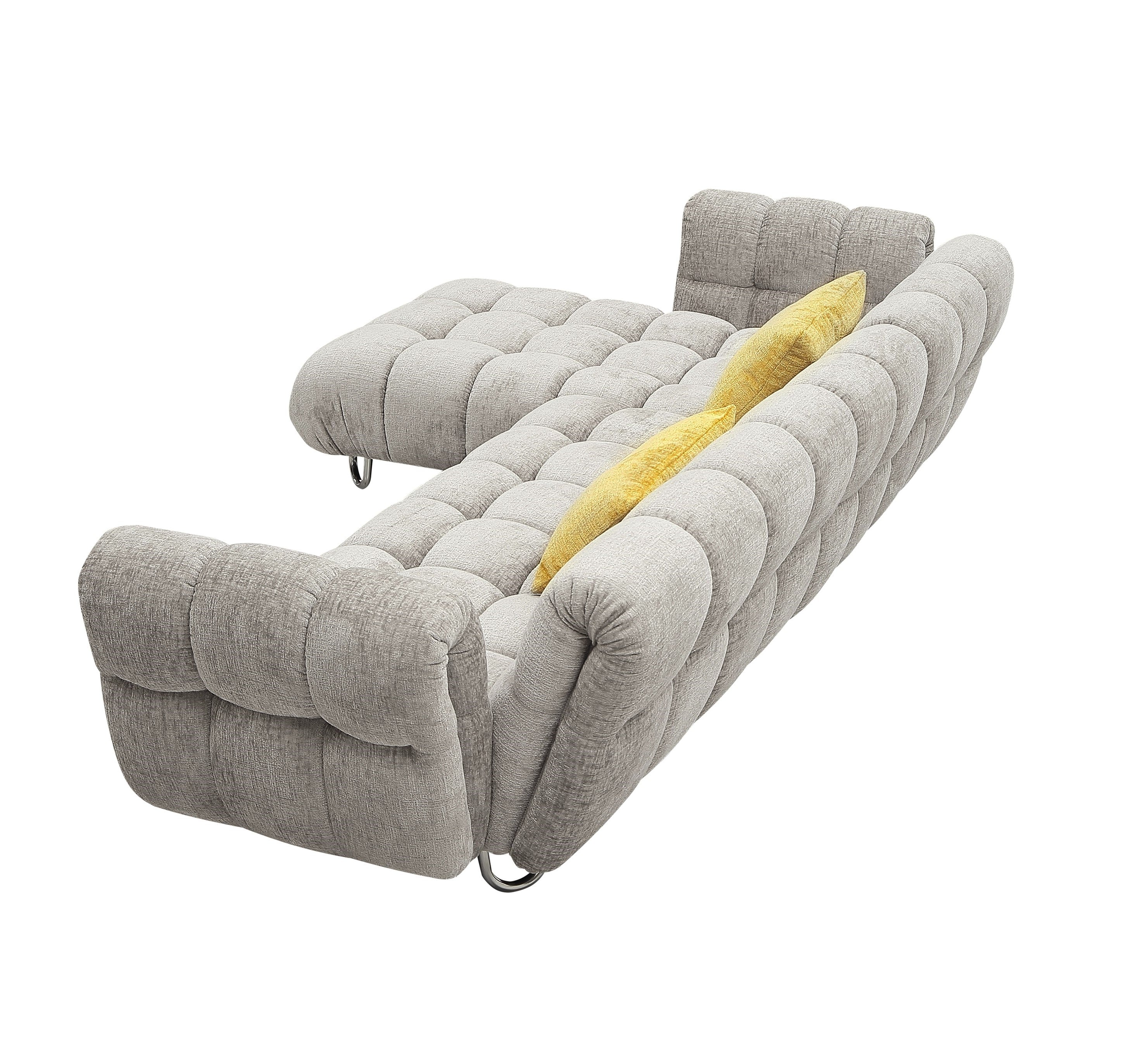 Looking for a contemporary sofa with a mid-century design? The Jacinda Sectional Sofa with Left Arm Facing Chaise combines excellent quality materials and superb design that makes it a stunner in any space. The Jacinda sports a grey fabric with yellow throw pillows and stainless steel legs to complete the look that is a modern twist on a throwback design. The sectional sofa can also be made with a Right Arm Facing Chaise.