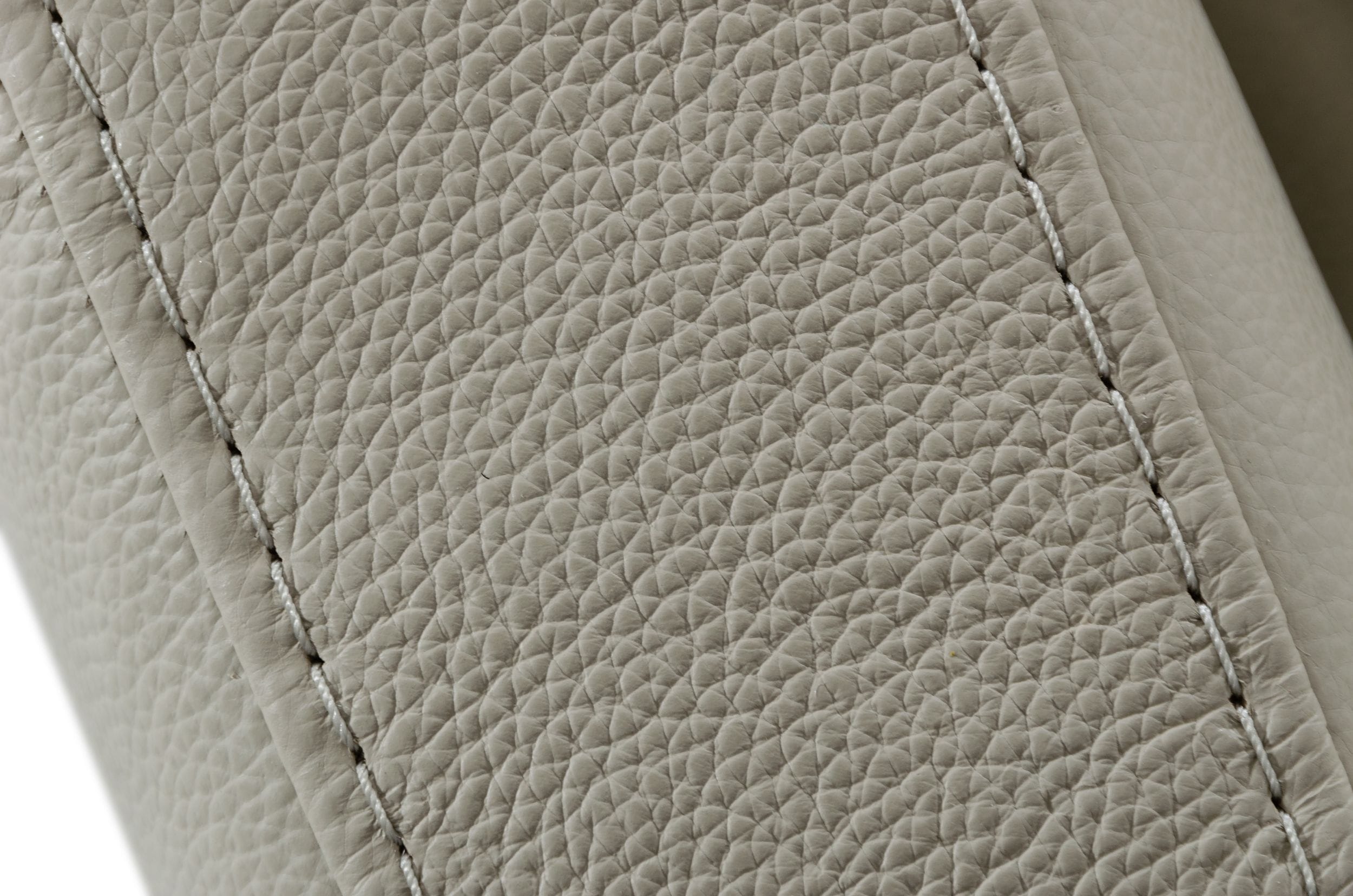 The Janina Sofa is a light grey leather sofa with drop square arms, stainless-steel legs and removable cushions. Two accent pillows round out this lovely piece. The light color is striking and sure to make a statement in any traditional, industrial or modern home.