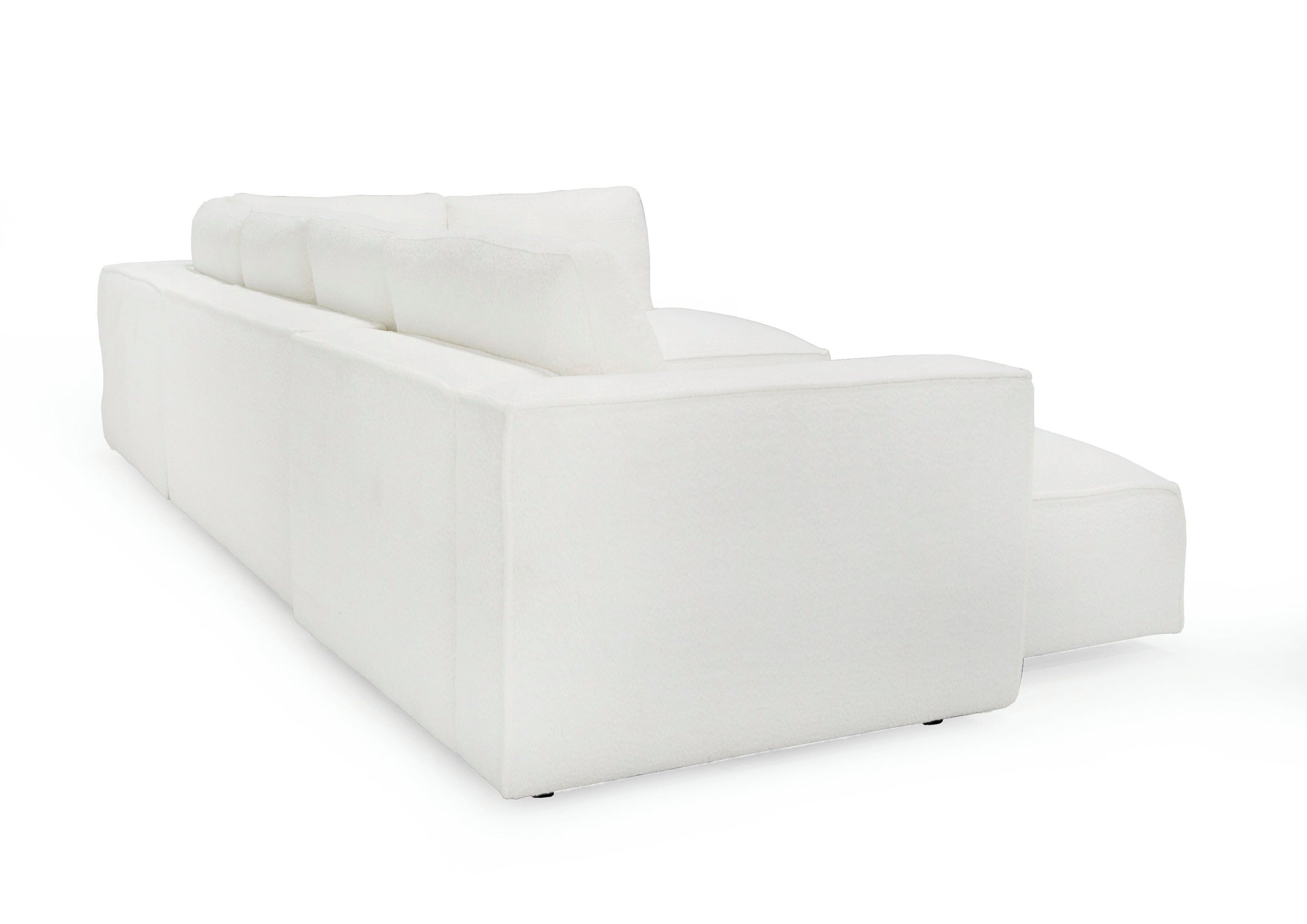 The Divani Casa Lulu Modern White Fabric Modular Sectional Sofa is a stylish and comfortable addition to any living space. Upholstered in 100% polyester fabric, this sectional sofa features a clean white color that complements various interior styles. It includes both a left-facing arm chaise and a right-facing armless chaise, allowing for flexible seating arrangements. The square arms and black plastic legs add a modern touch, while the manufactured wood frame ensures durability. The seat is filled with a combination of foam and feather, supported by pocket spring construction. The tight seat style and cushion back provide a sleek and tailored look. The back cushions are removable, but the cushion covers are not. Overall, the Divani Casa Lulu offers both comfort and contemporary design.