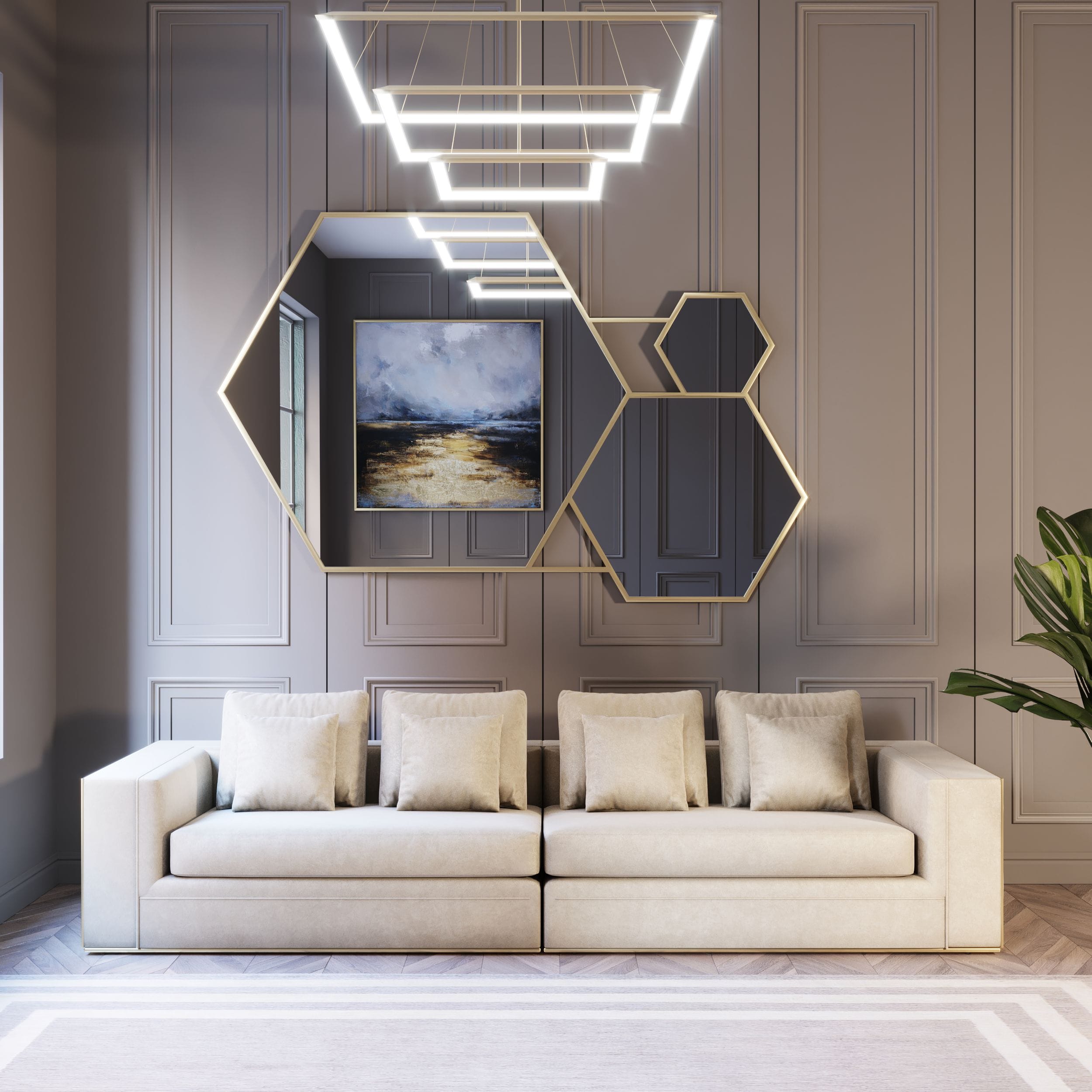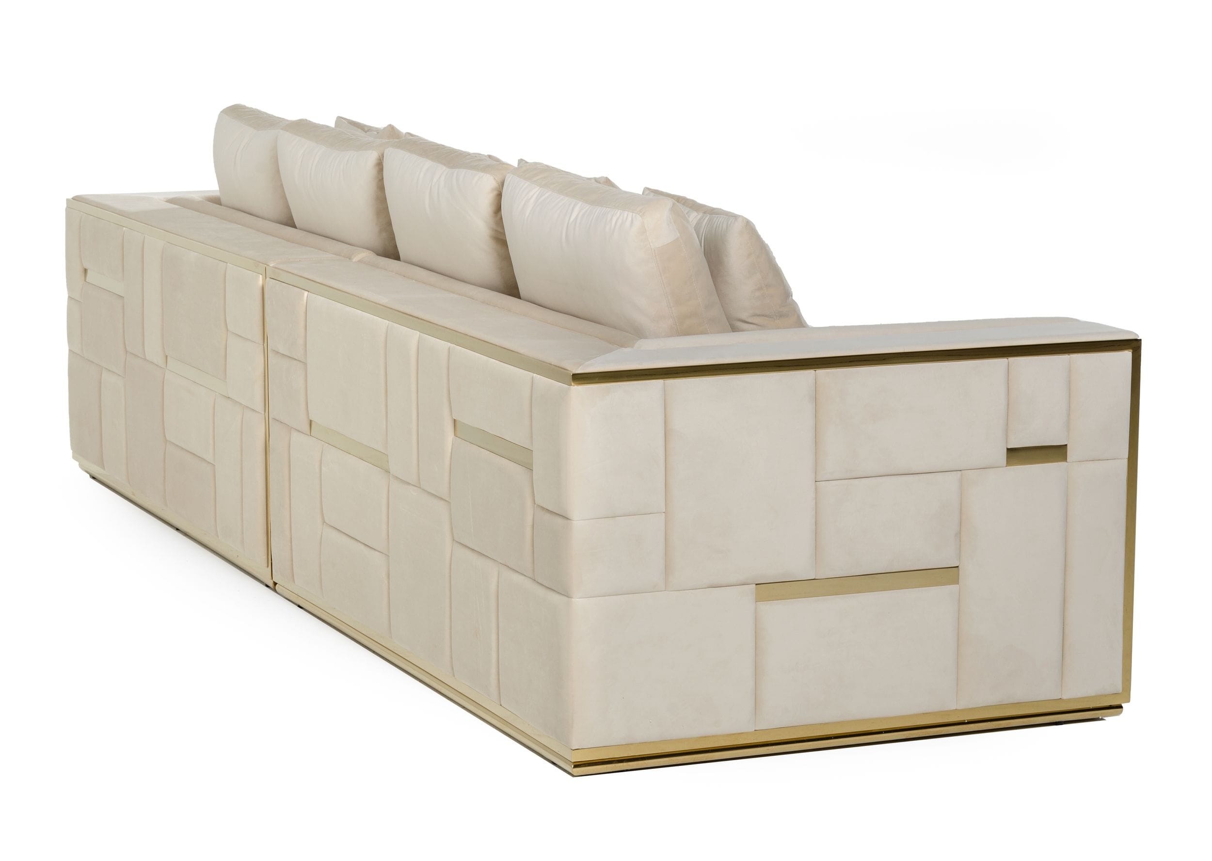 The modern silhouette of the Mobray Sofa becomes a stand-out item with its lovely gold accents. The beige velvet upholstery is luxurious and neutral, matching everything in your home. The seat cushions and covers are removable, allowing this item to be easily cleaned. The back of the sofa is padded with 8 foam-filled pillows. This glam sofa is perfect for any modern living area.