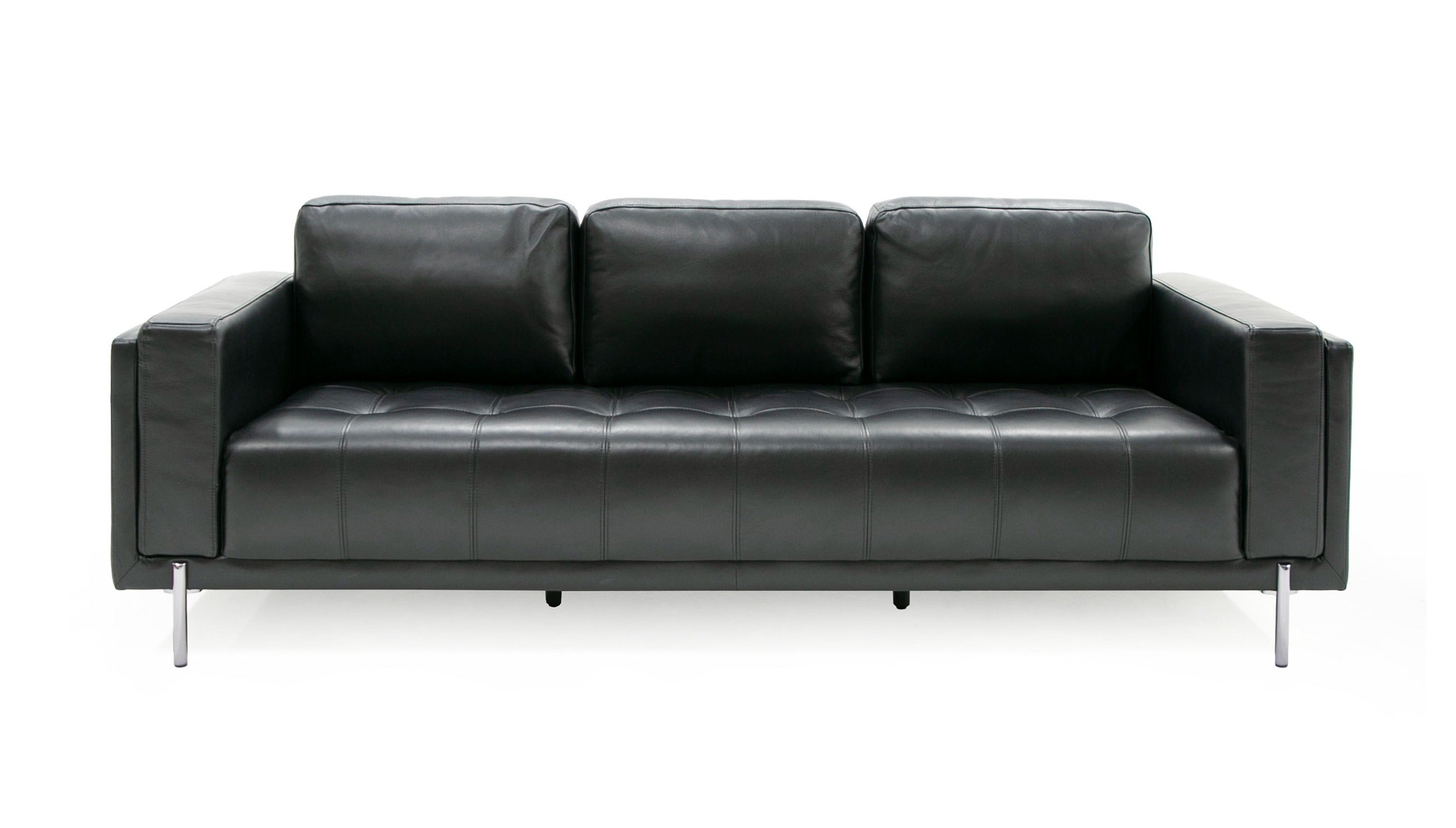 The Schmidt Modern Black Leather Sofa has a low & lean silhouette with a classic modern style. With top grain leather upholstery, sinuous springs and featuring grey metal legs, the Schmidt sports a stylish design and offers comfortable seating. The sofa pairs perfectly with the matching Schmidt Black Leather Chair.