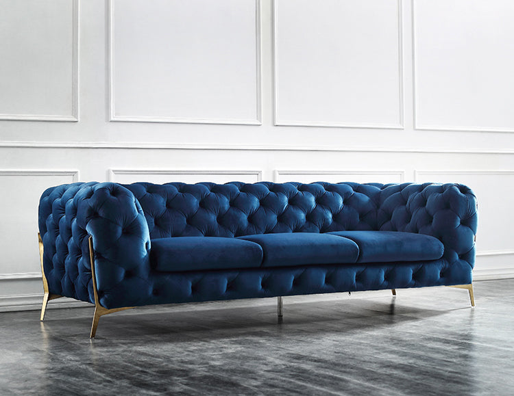 Elegance is not at all difficult to achieve with the Divani Casa Sheila Modern Dark Blue Fabric Sofa Set. Featuring tufted seatbacks with buttons, this sofa set shines in calming blue Velour fabric upholstery. Out to give utmost convenience is the cube shape design that gives you that luxurious feel as you sit with ease on its square thick cushioned seats. It comes with track arms that are of the same height as that of the back. Standing on sleek angular legs with the other angle extended to the side of the arms that serve as accent, this modern sofa set will absolutely provide your home flair, making everyone to want it for their home!