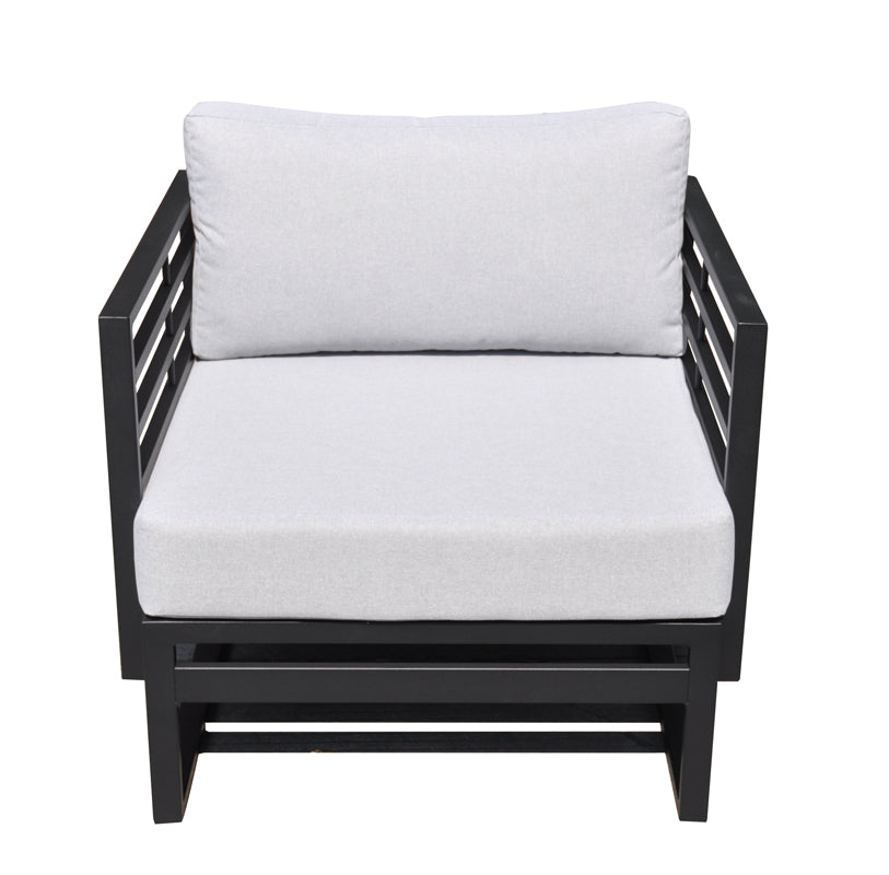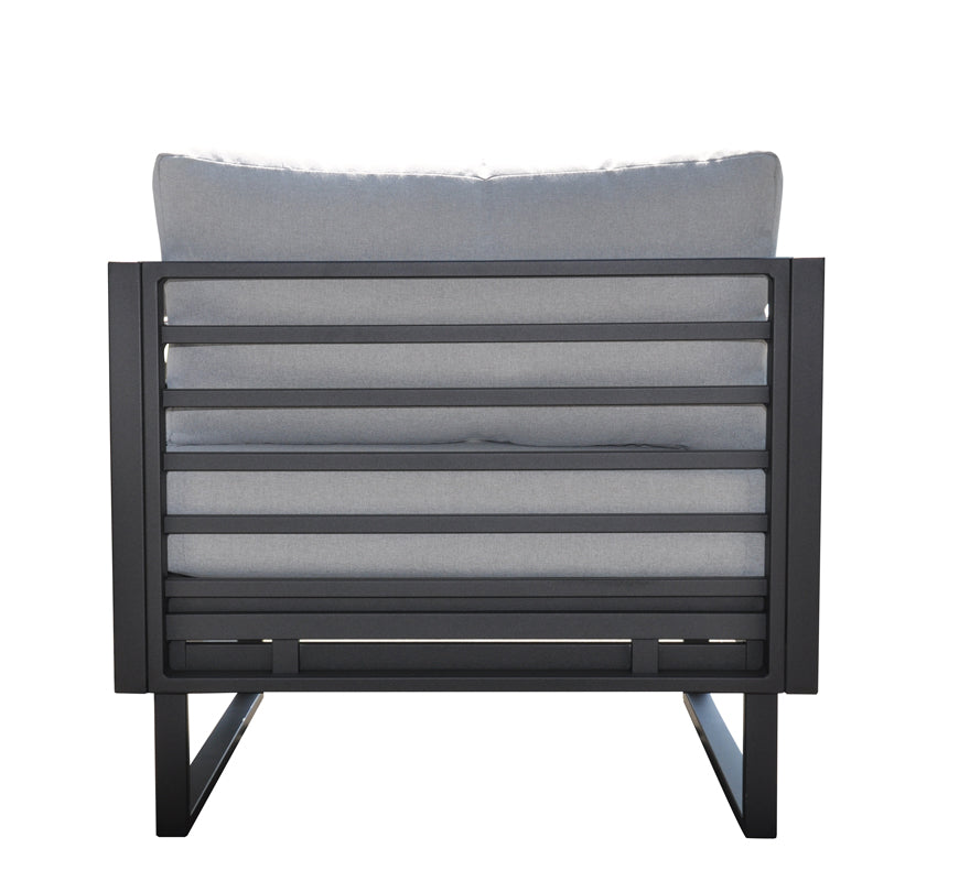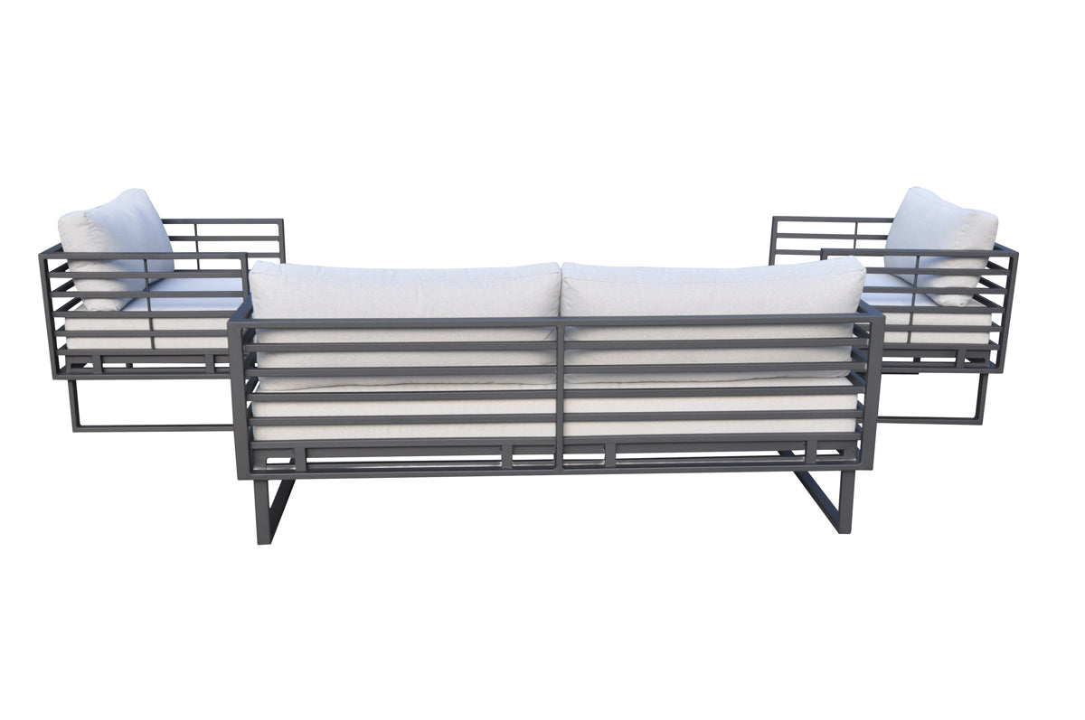 Fashion a convivial setting in your patio or garden with the Renava Wharf Outdoor Grey & Black Sofa Set. Created with a black powder coated aluminum frame, this sofa set can stay looking new in the coming years. It features 6-inch Dacron filled cushions enwrapped in a smooth grey weatherproof fabric. The backs and arms are designed with the same height that provides a secure comfy seating position. Completing this set is a rectangular top coffee table with a round centerpiece to keep bottles of wine from falling. The boxy styles of this modern outdoor sofa set will make your garden or patio always ready for socialization.