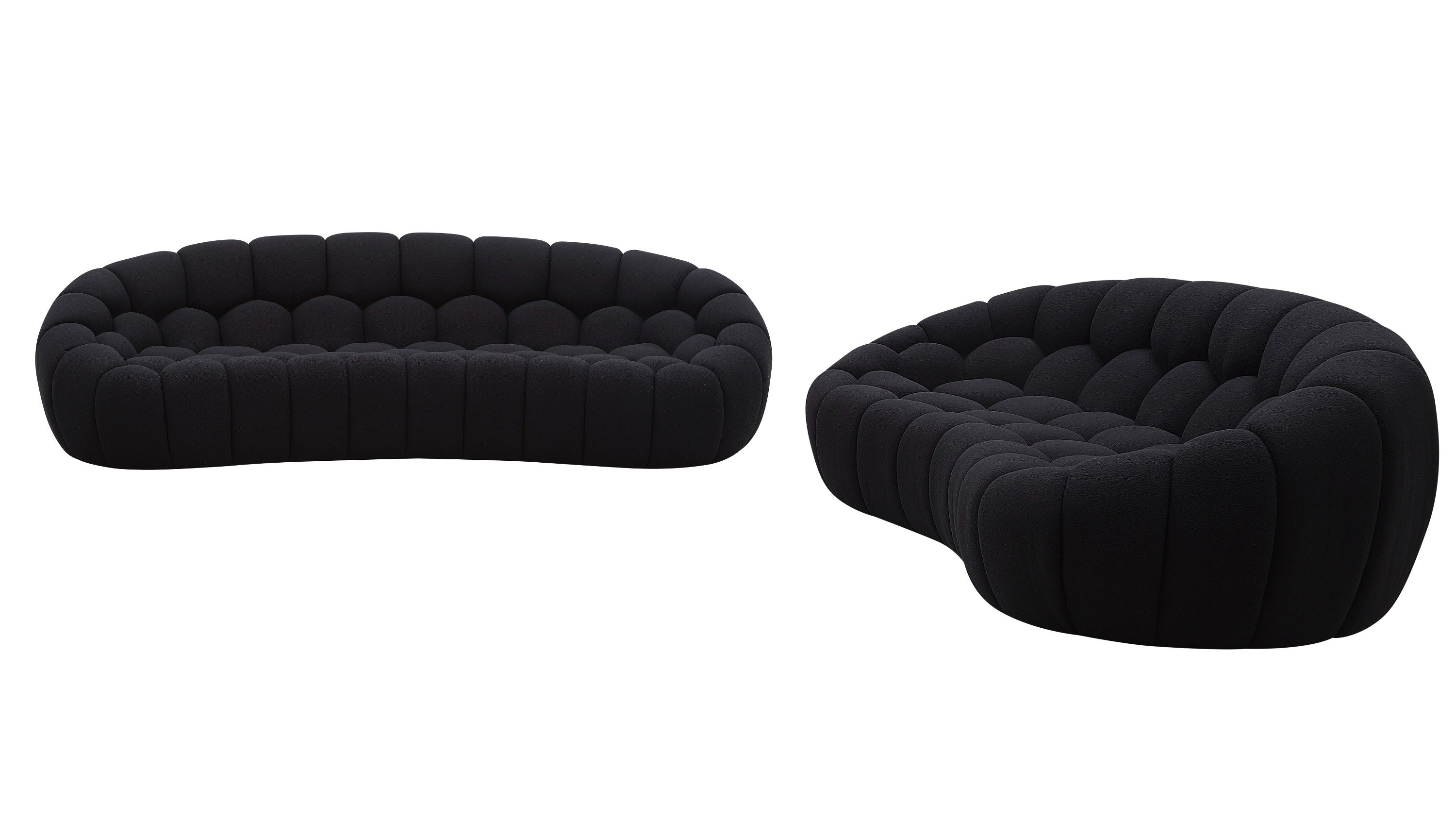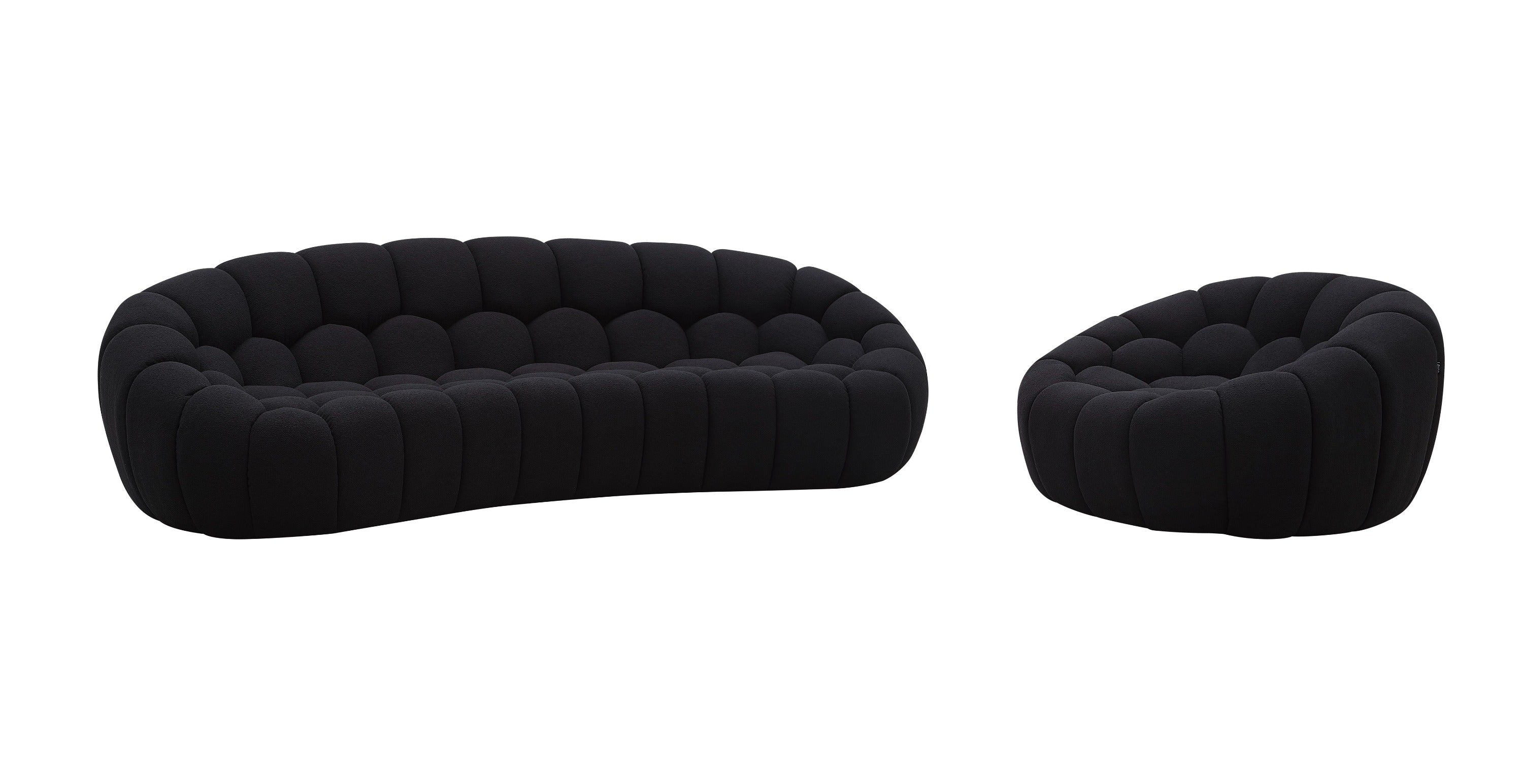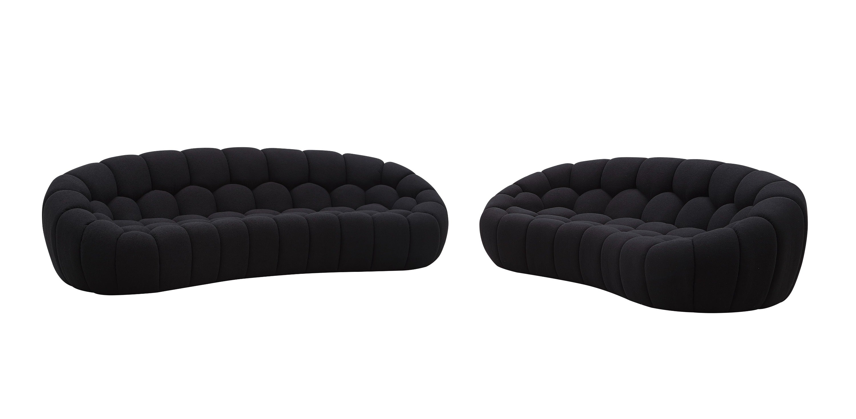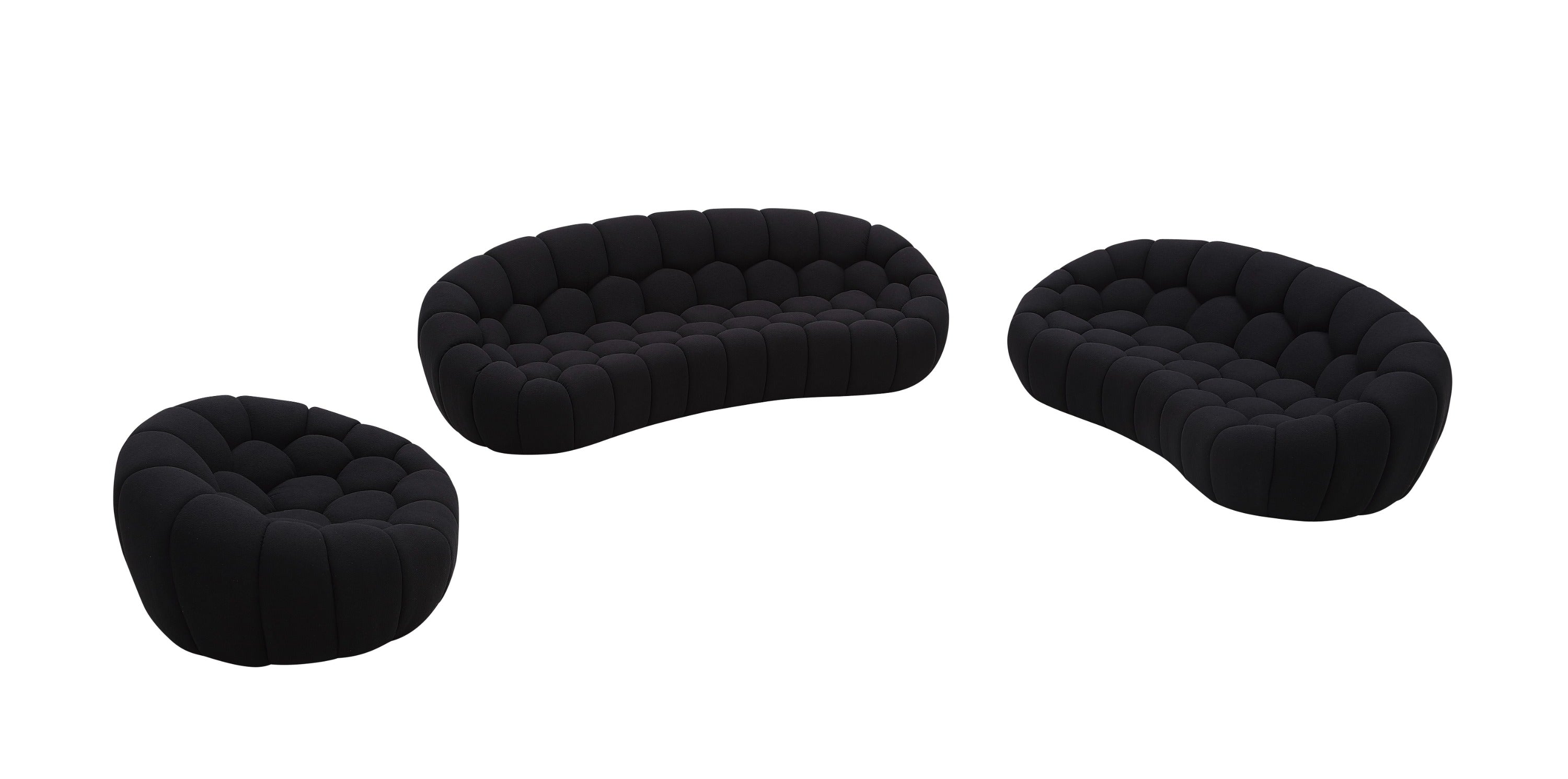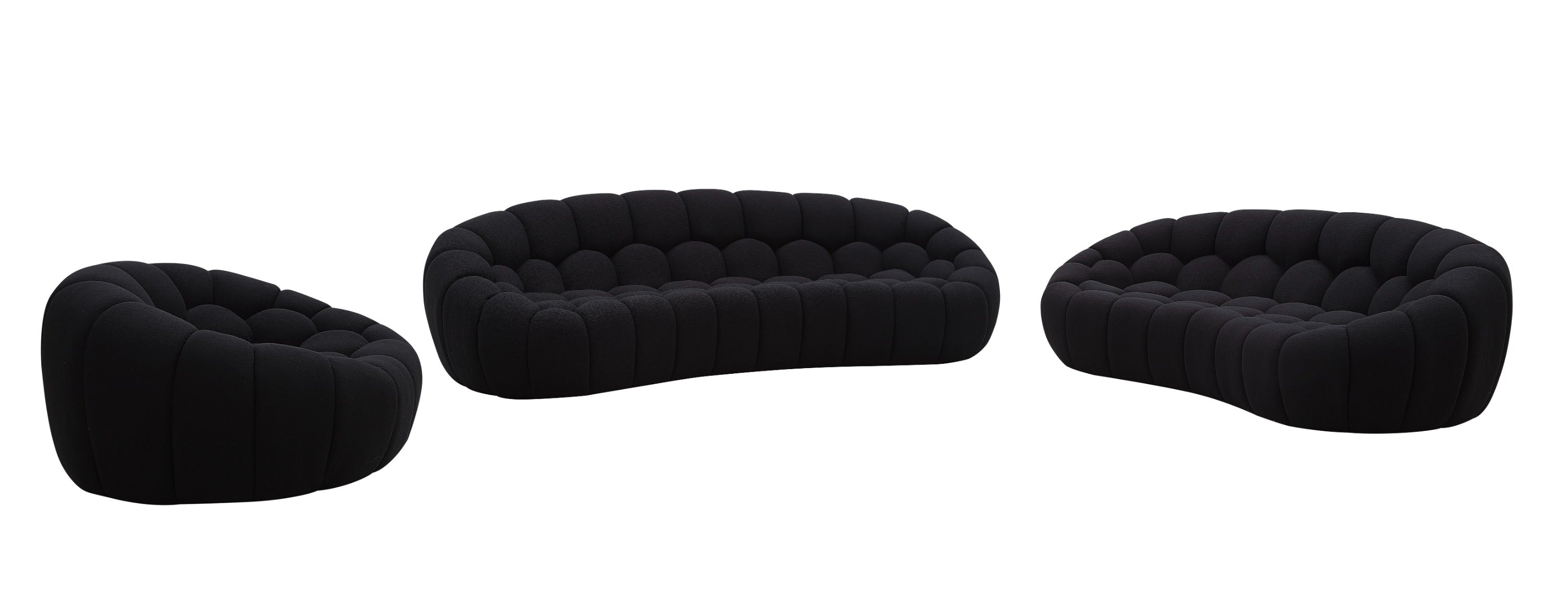 The Yolonda Curved Modern Black Sofa Set offers a stunning collection for your living space. The set includes a sofa, loveseat and single chair. The hexagonal tufted cushions provide a unique, non-traditional and stylish design for the sofa as well the teddy fabric upholstery providing maximum comfort.
