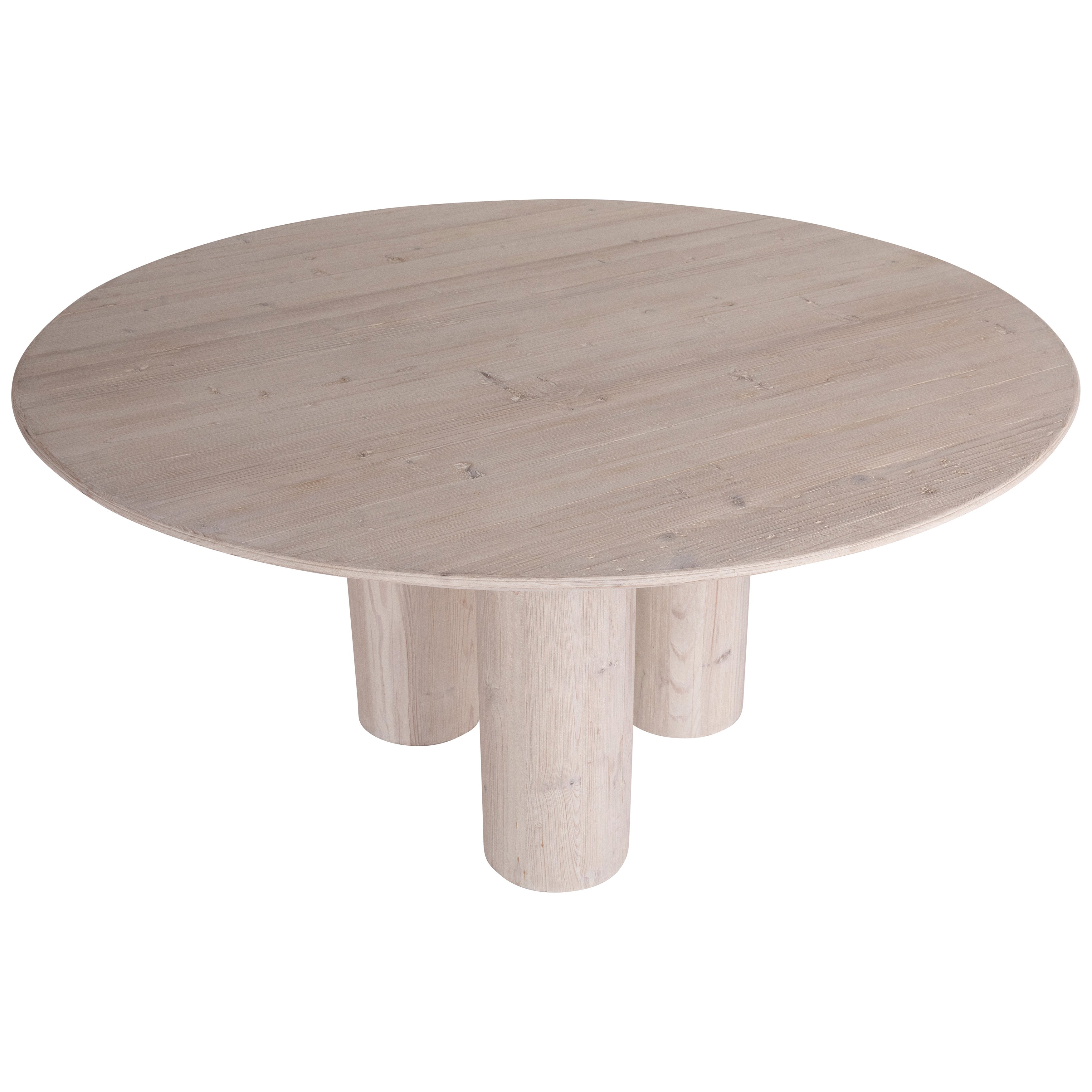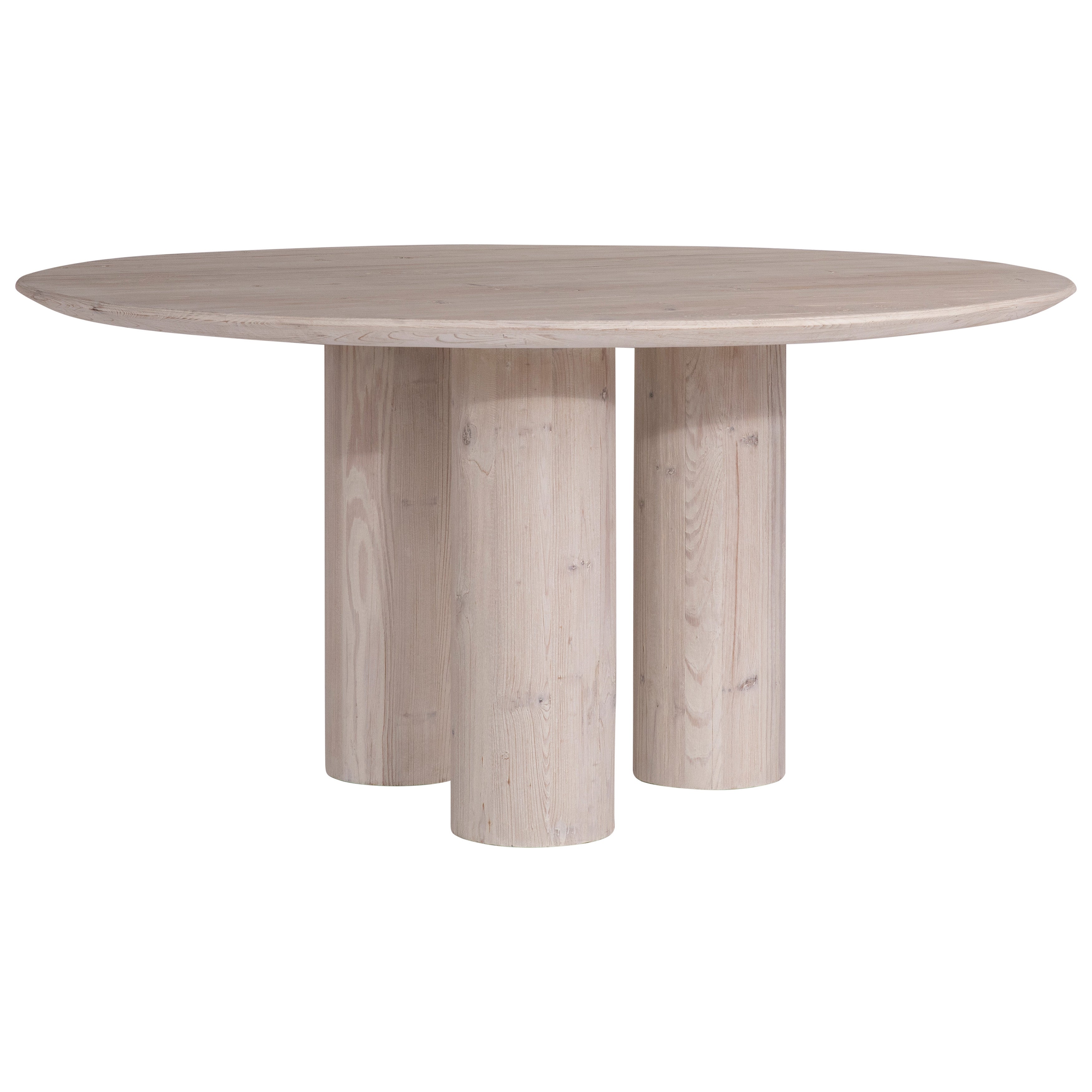 Organic in tone, this 60 round dining table features modern simplicity that is unparalleled. Three solid, reclaimed pine pillars complement the slim-beveled tabletop. Finished in a light warm wash that highlights the natural beauty of the wood. This dining table is designed to blend beautifully in your space and create the perfect stage for enjoyable dinner gatherings.