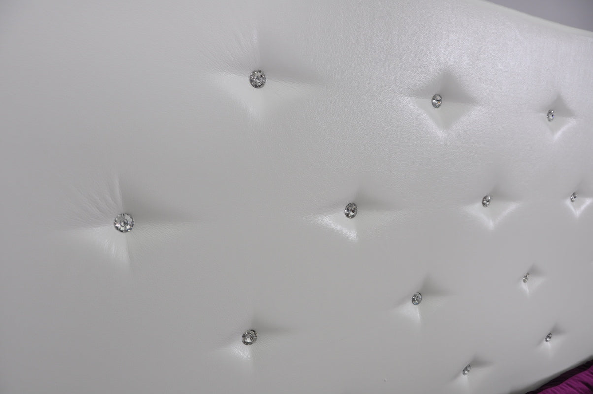This white leather modern bed features a rich leather match material upholstery, and artificial crystals embedded in the tufting. the tufting is evenly spread throughout the headboard and bottom of the low profile frame. This beautiful bed comes with slats so no box spring is required. Matching set pieces are available as well such as Standing mirror, Wall mirror, dresser, chaise, and chest.
