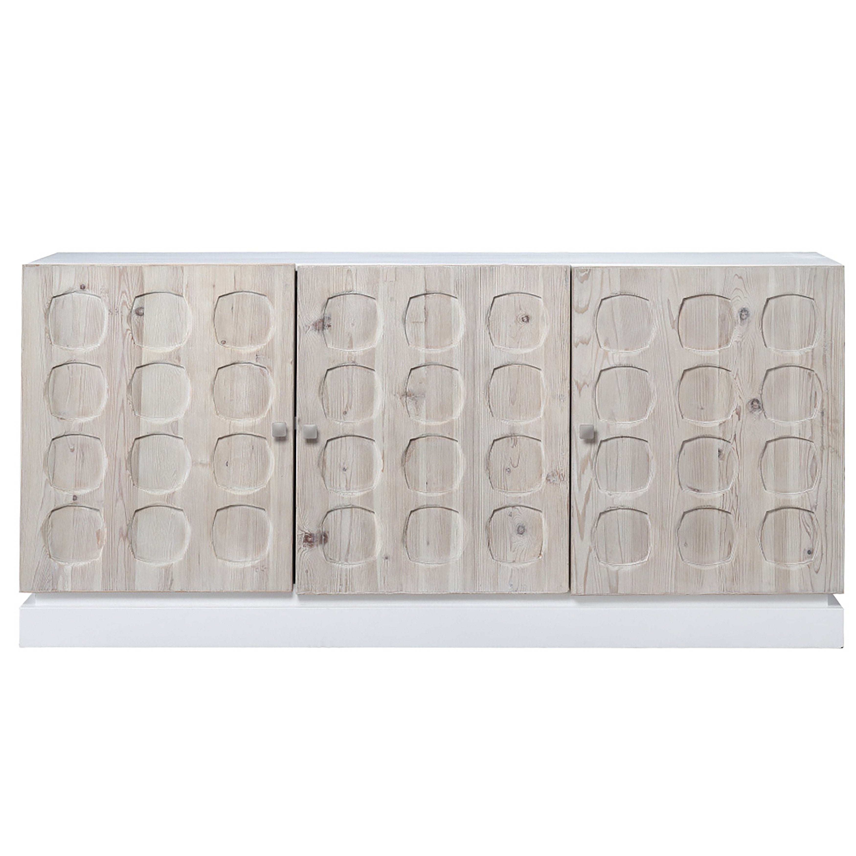 Eclectic and elegant, this large 72 two-toned sideboard is boasting with character. Made of solid reclaimed Pine hardwood, the cabinet exterior is finished in a bright white while the door panels are finished in an light warm wash and hand carved with a unique tribal circular pattern. Each set of doors butterfly open to built-in storage inside. This beautiful cabinet is finished with brushed nickel finished iron door pulls for easy opening.