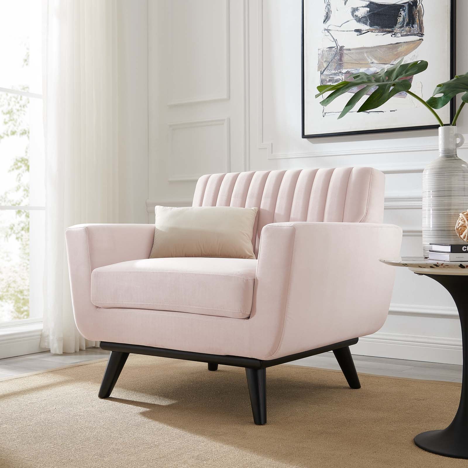 Gently sloping curves and a plush seat cushion create a favorite lounging spot. Whether relaxing after a long day at work, settling in with coffee and brunch, or entering a spirited discussion with friends, the Engage Armchair is a welcome presence in your home. Channel tufting creates eye-catching appeal, adding depth that brings your sitting décor to center stage. The black painted rubberwood legs and frame offer a solid base for the stain-resistant performance velvet upholstery.