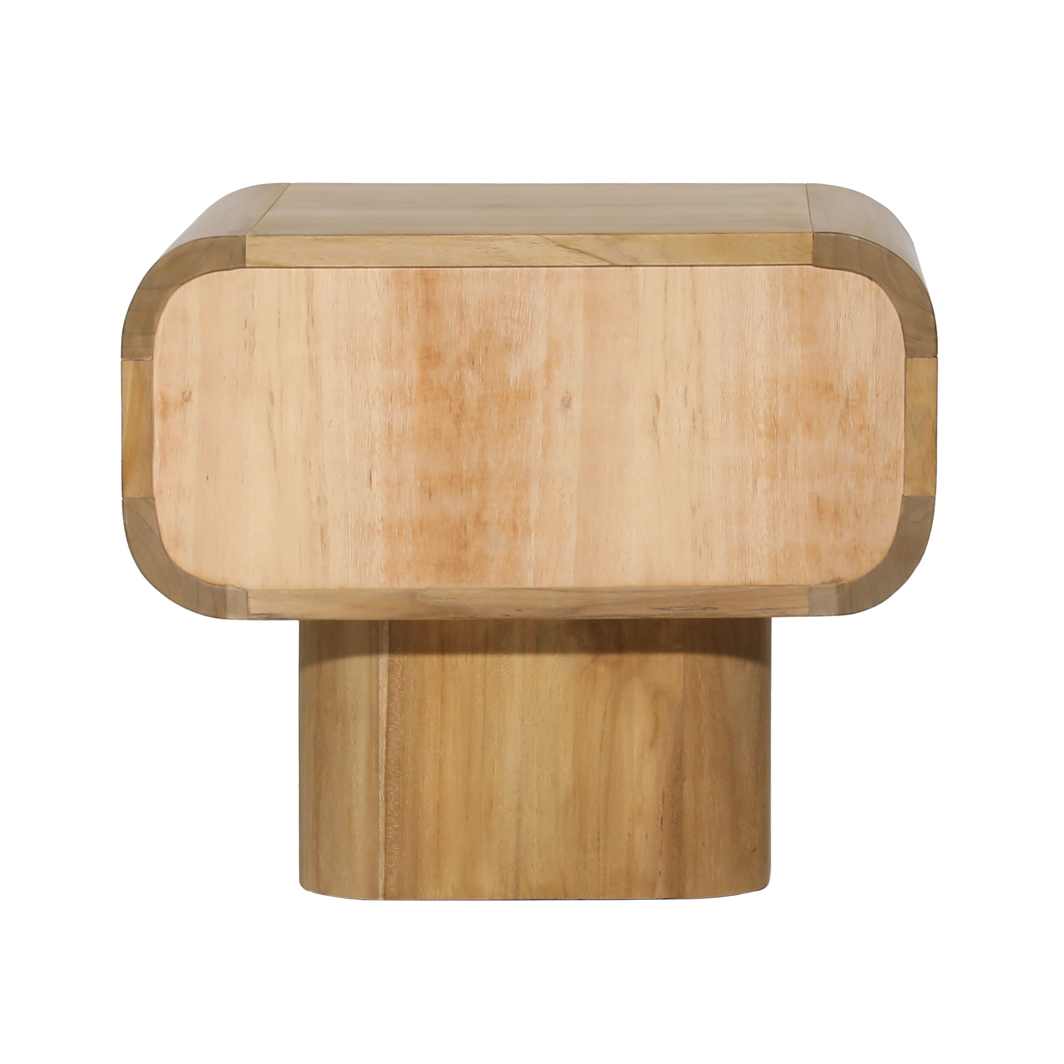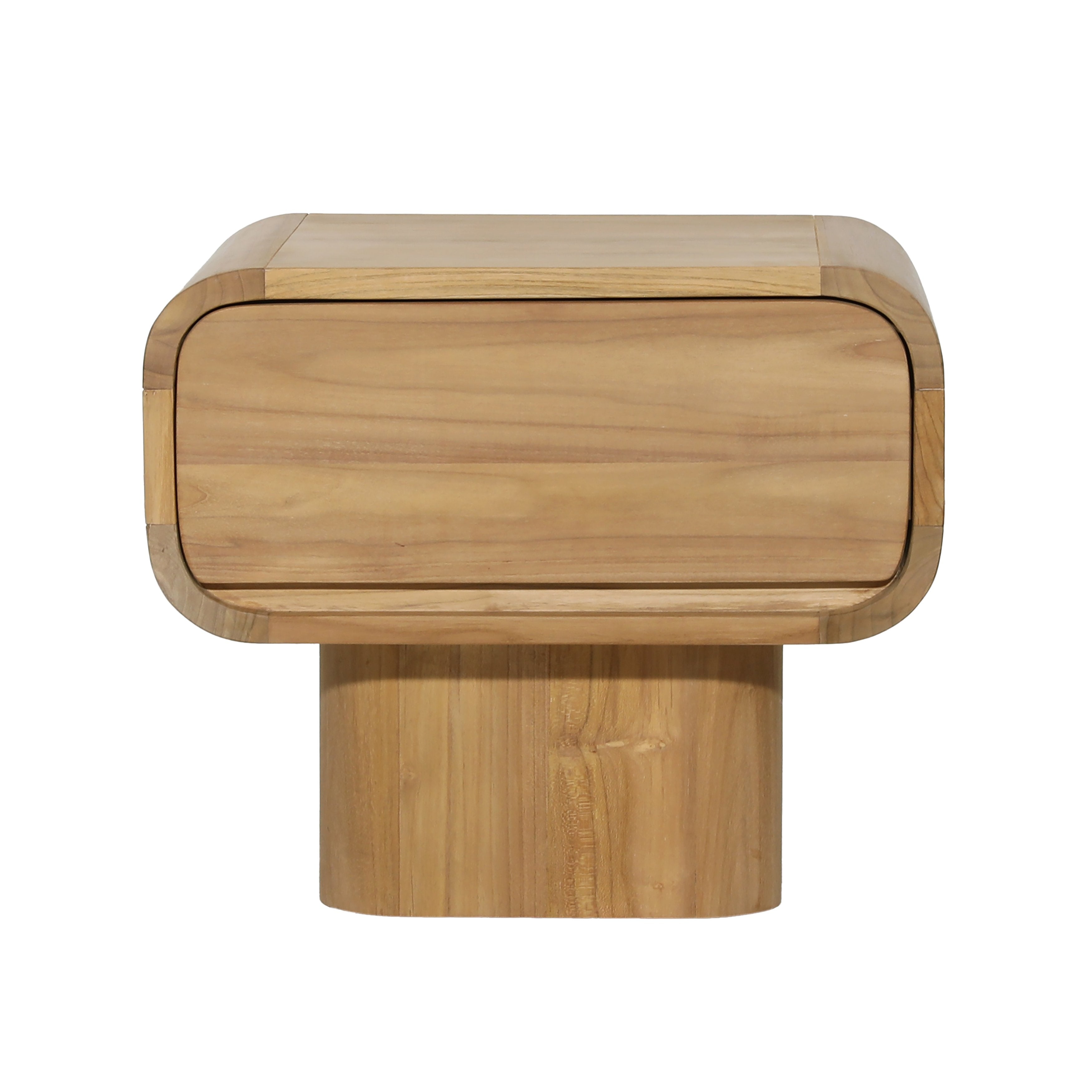 Crafted from solid teak wood, the natural finish of this contemporary nightstand showcases intricate wood grains and knots. With its one-drawer design, it effortlessly blends natural beauty with functionality.???