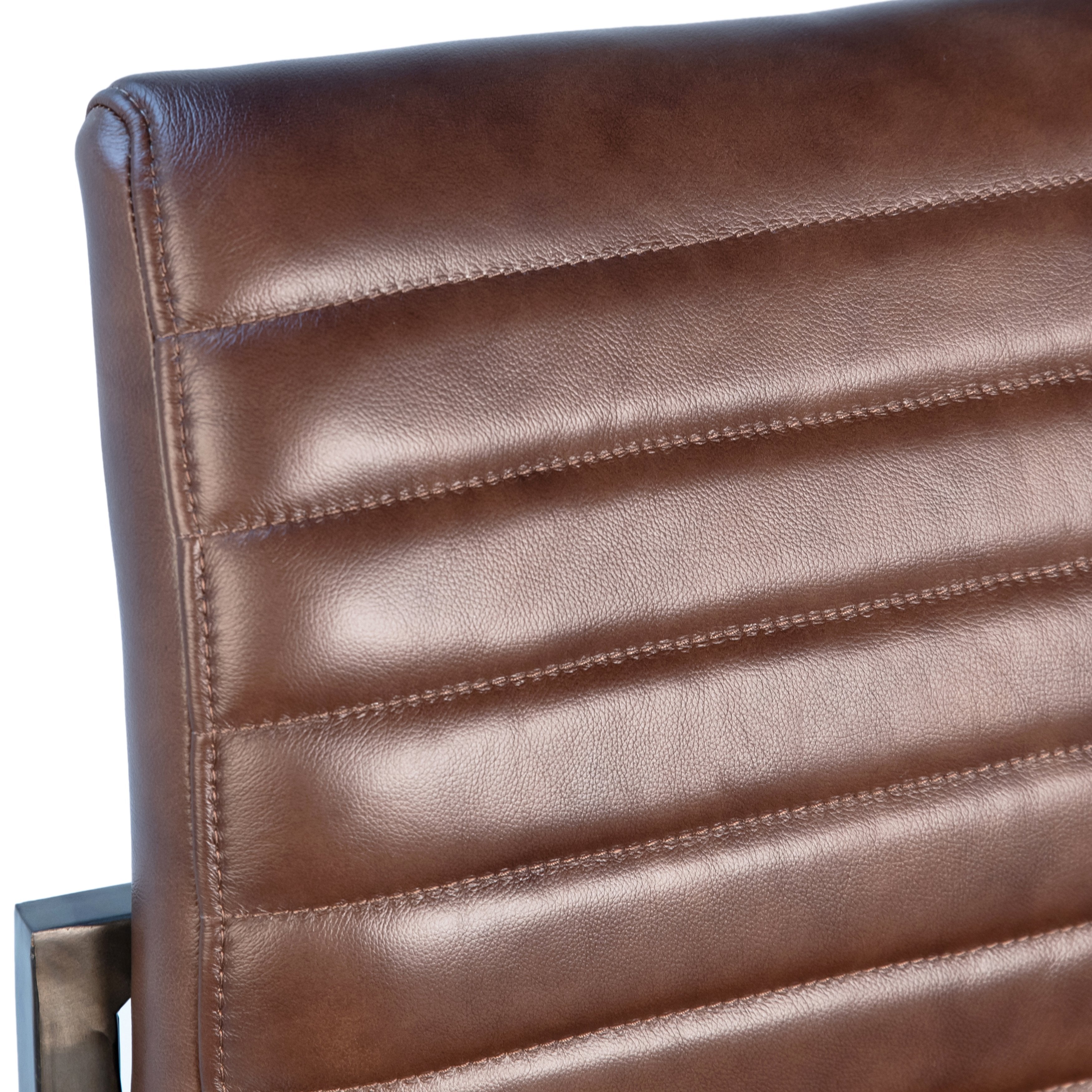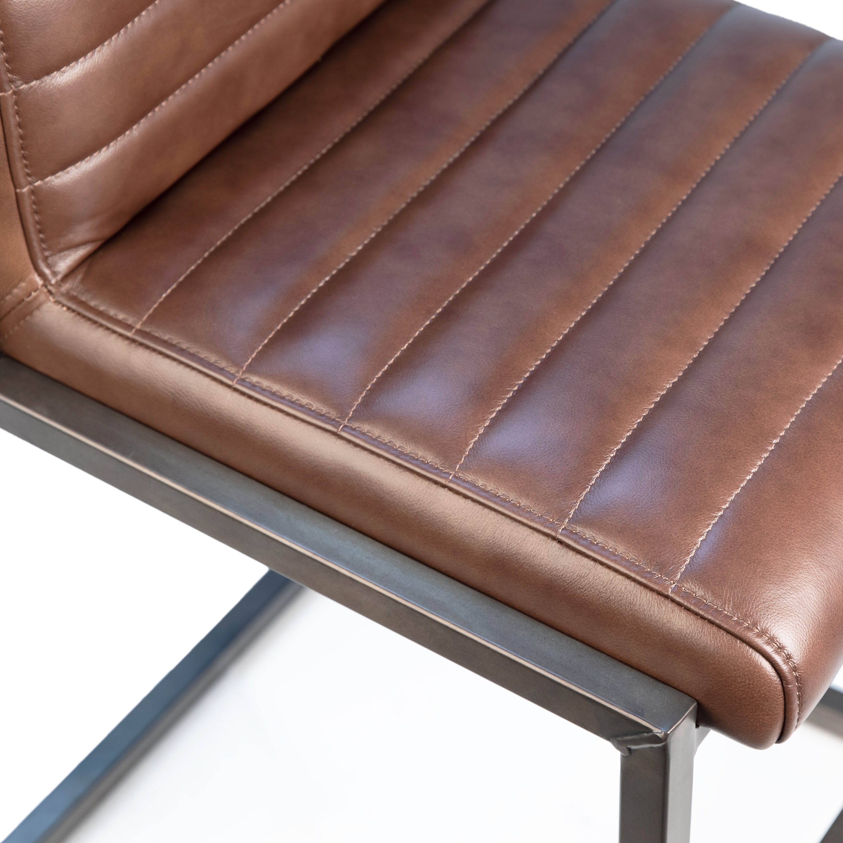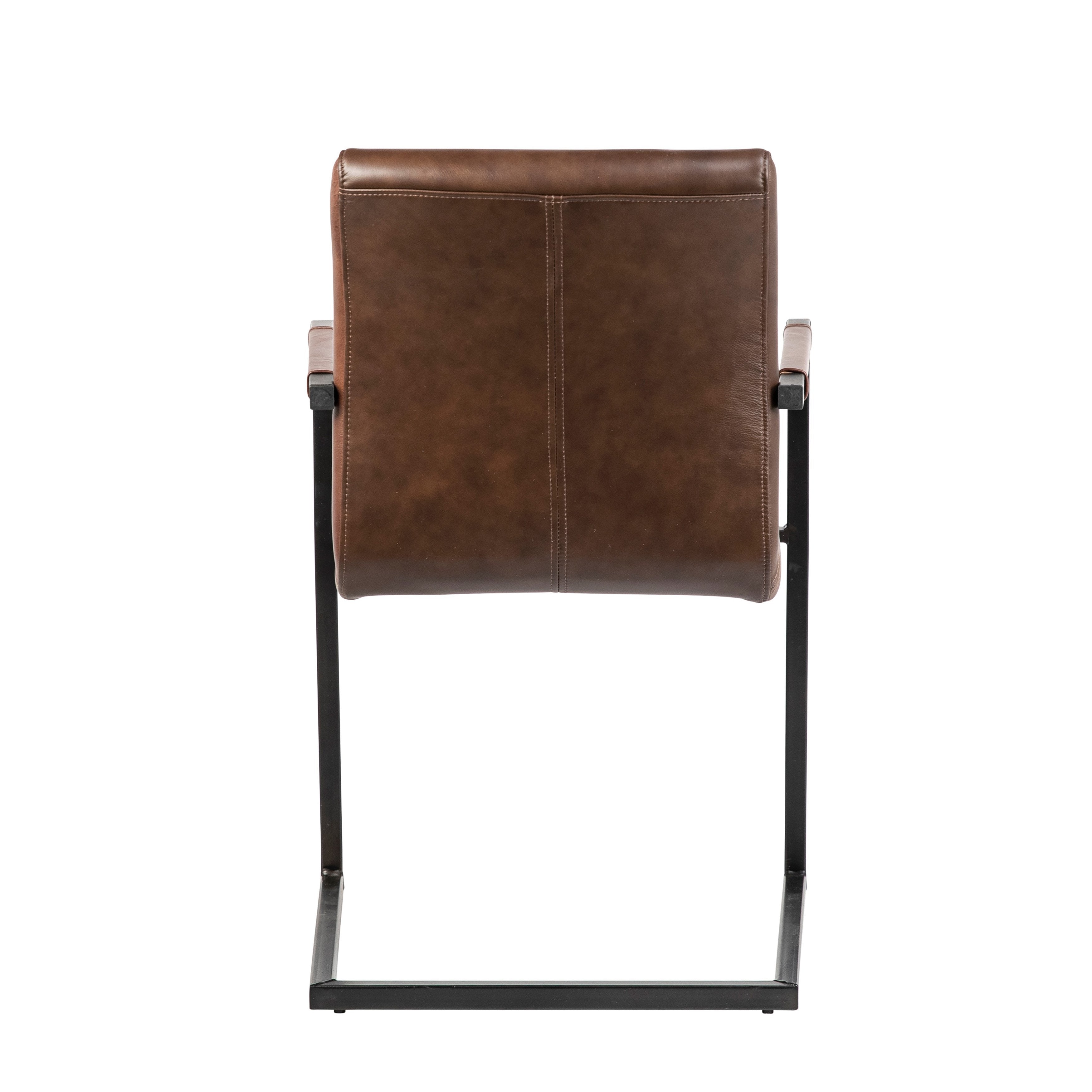 Clean and sophisticated, this dining arm chair brings a modern yet timeless design to your kitchen counter or island. Upholstered in lustrous, genuine brown leather sitting atop a powder coated iron frame. The metal frame offers a simple modern design with a supportive back for durability. The footrest is incorporated in the design, adding an angular component to the frame for added style and comfort.