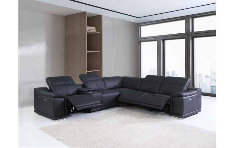 9762 DivanItalia Black 6-Piece Sectional with 3 Power Recliners and 1 Console – Top Grain Italian LeatherModel:  9762-BLACK-3PWR-6PC