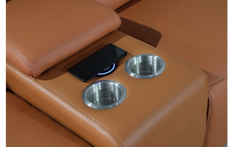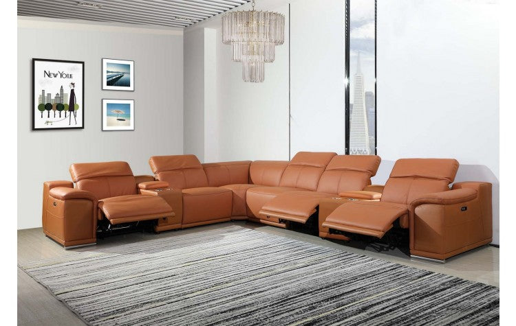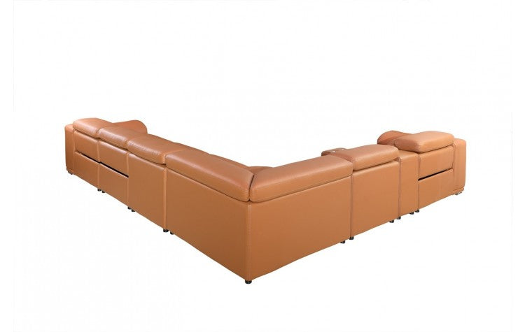 9762 DivanItalia Camel 8-Piece Sectional with 3 Power Recliners and 2 Console – Top Grain Italian LeatherModel: 9762-CAMEL-3PWR-8PC