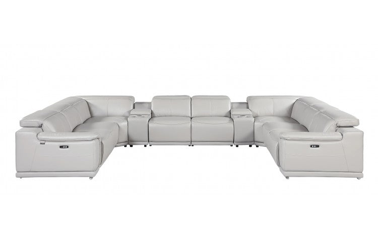 9762 DivanItalia Light Gray 10-Piece Sectional – Top Grain Italian Leather with 4 Power Recliners and 2 ConsolesModel:  9762-LT-GREY-10PC-4PWR-U-SECTIONAL-GROUP