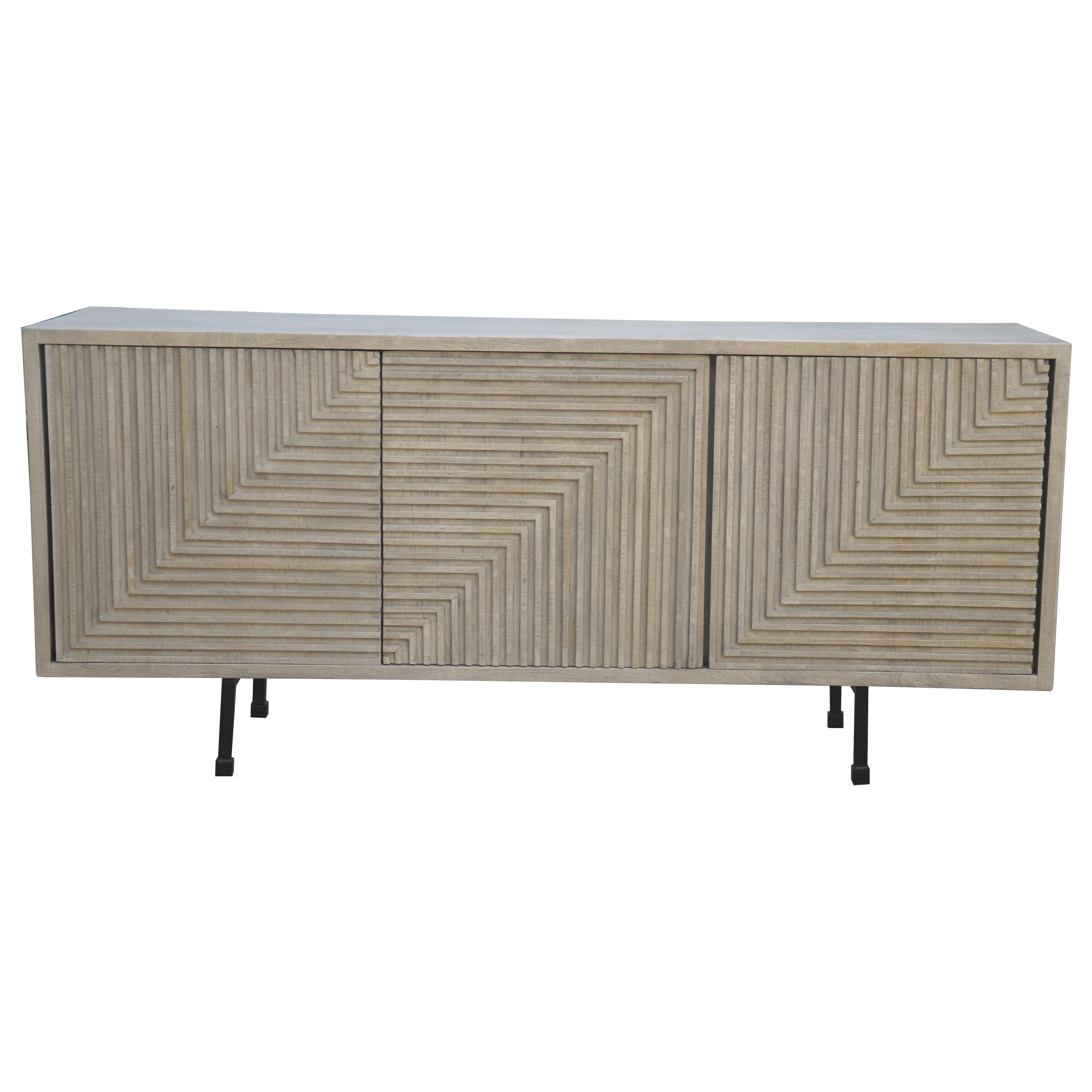 This versatile 76 sideboard mixes materials and textures to create a striking design. Made from reclaimed mango wood in a light warm wash finish. It features a stunning, linear carved design on each of the three doors that open to find built-in shelves for added storage. Sitting atop a black metal base for extra support, this sideboard is equal parts durable, functional, and stylish.