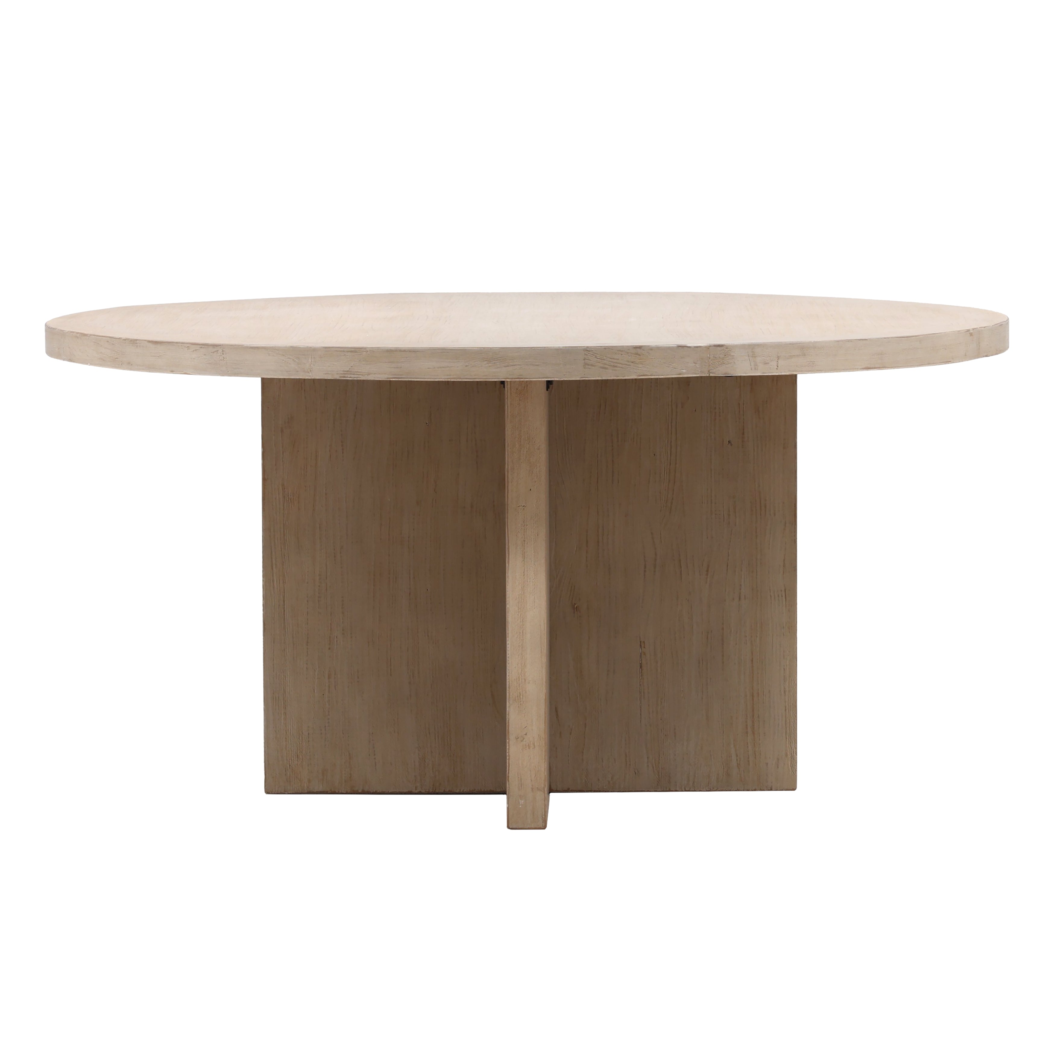Modern organic design crafted from reclaimed pine wood. Featuring a round top and X shaped base, this light warm wash 60 dining table is the perfect way to add a touch of freshness to your dining space. Its natural finish allows the subtle beauty of the wood grain to remain visible. A truly versatile piece that will elevate your space.