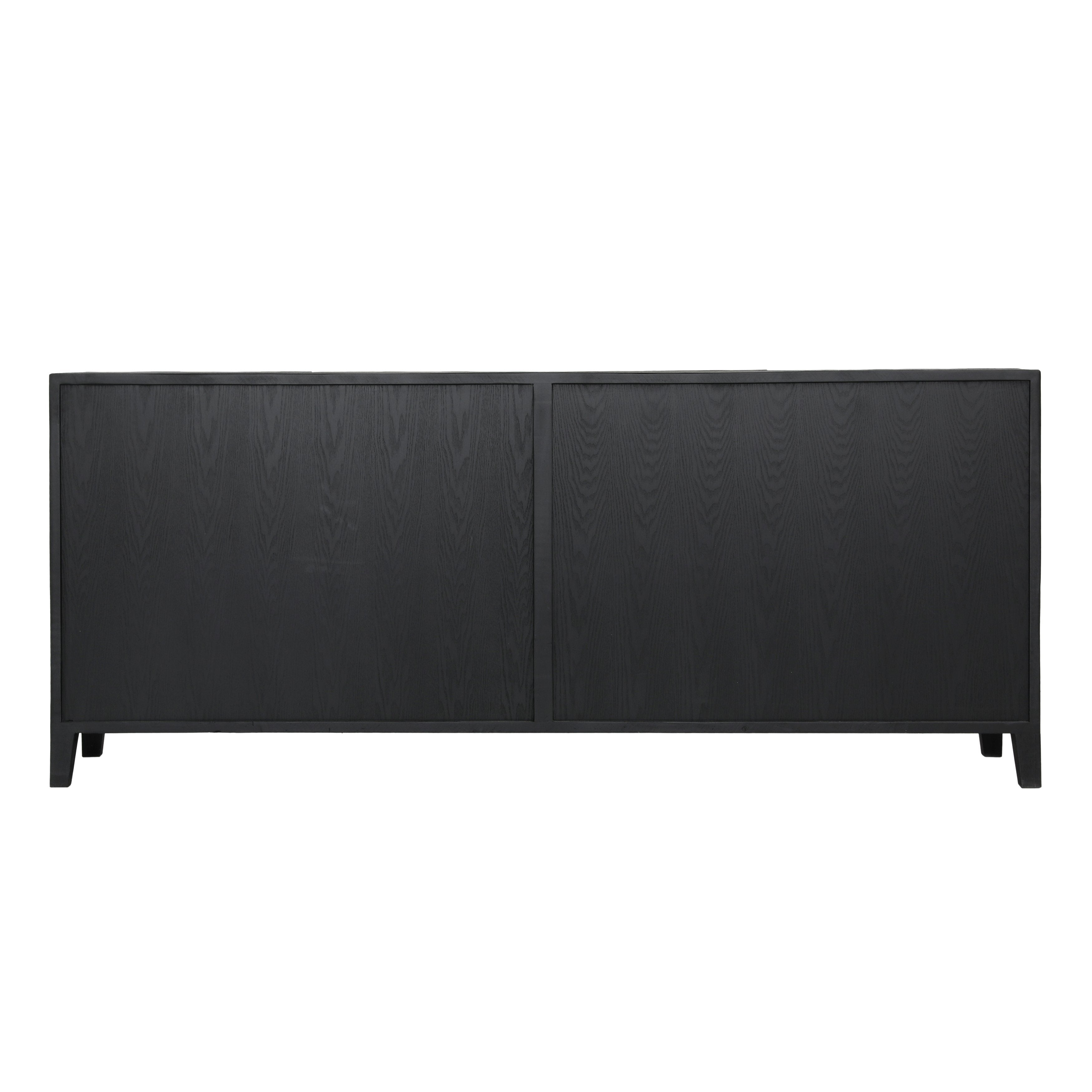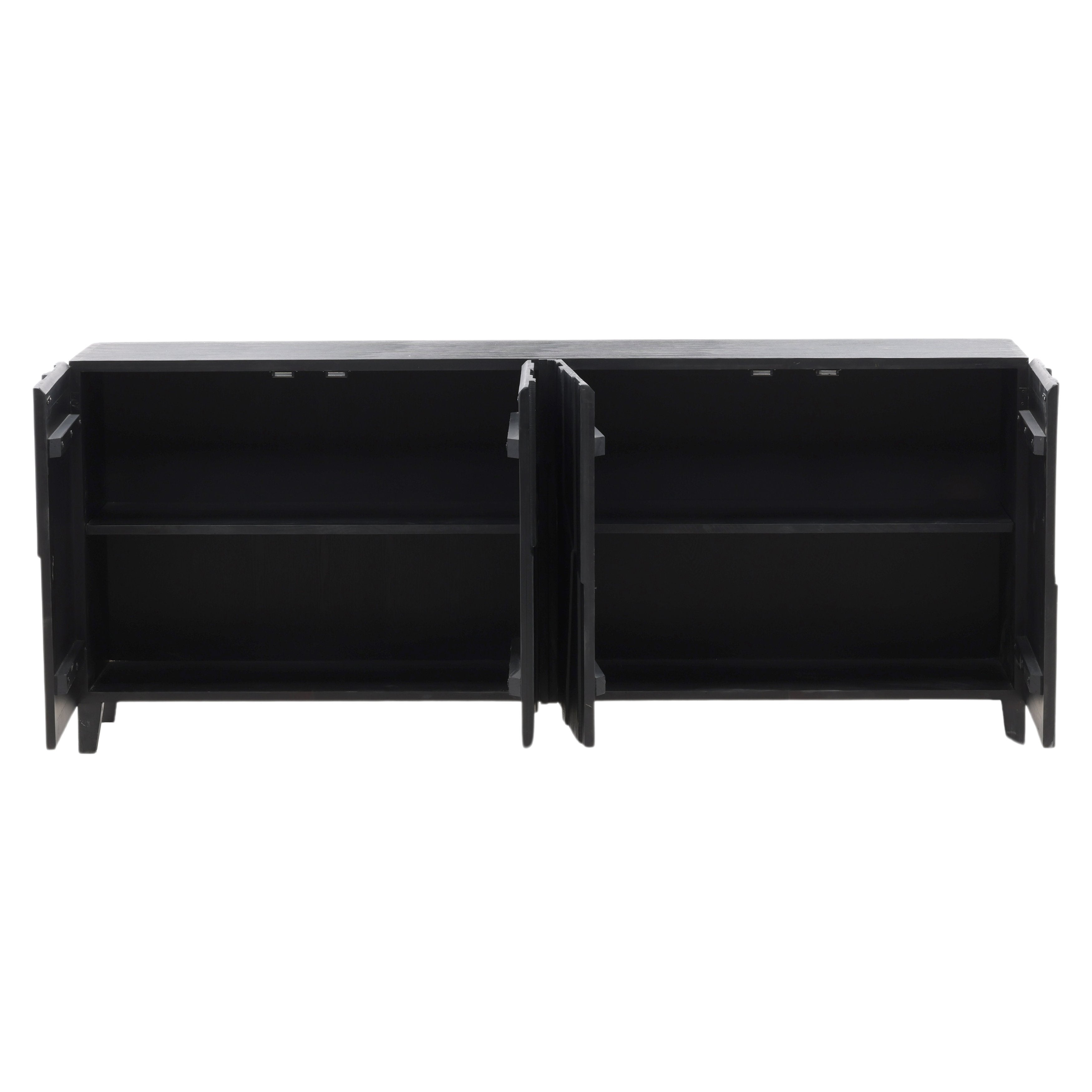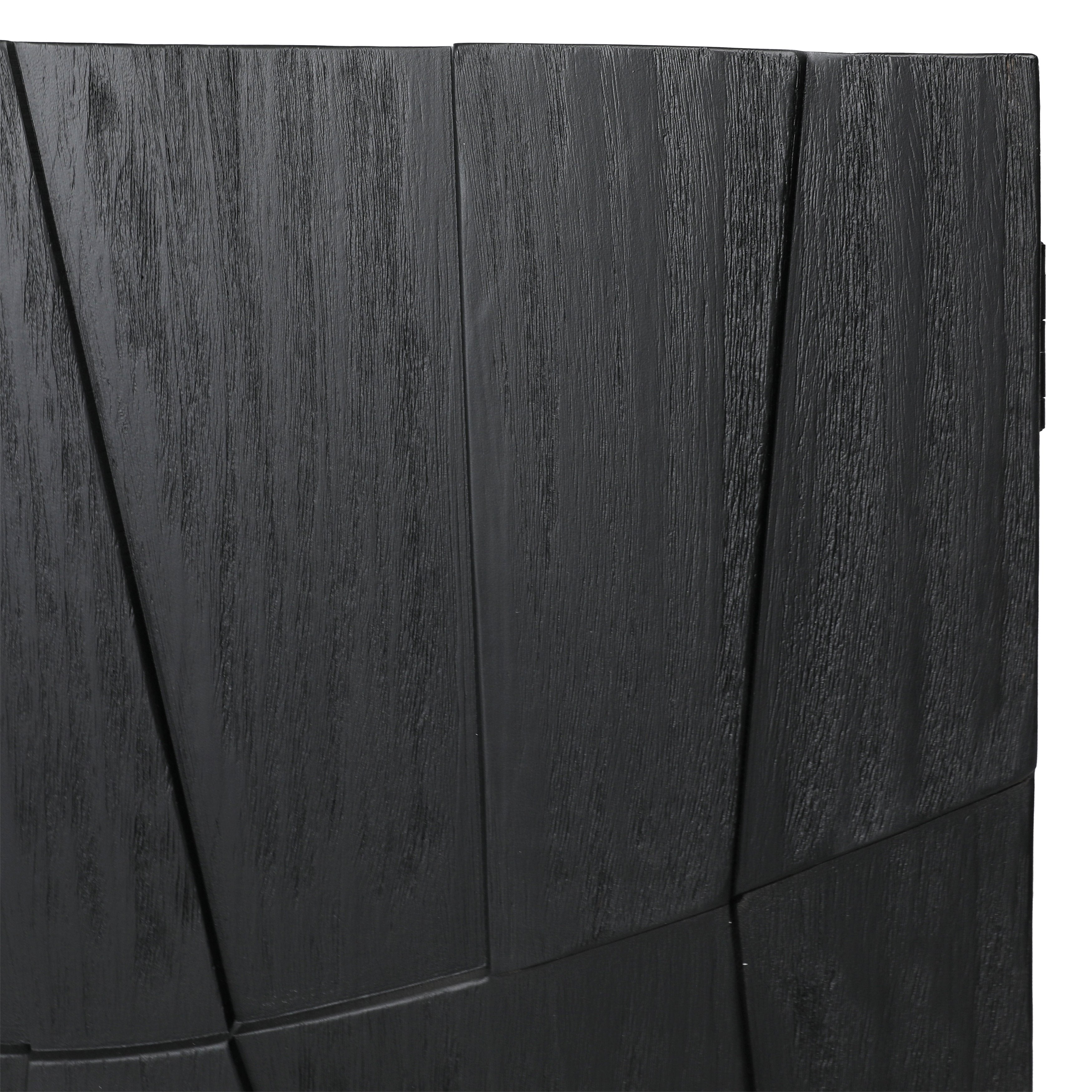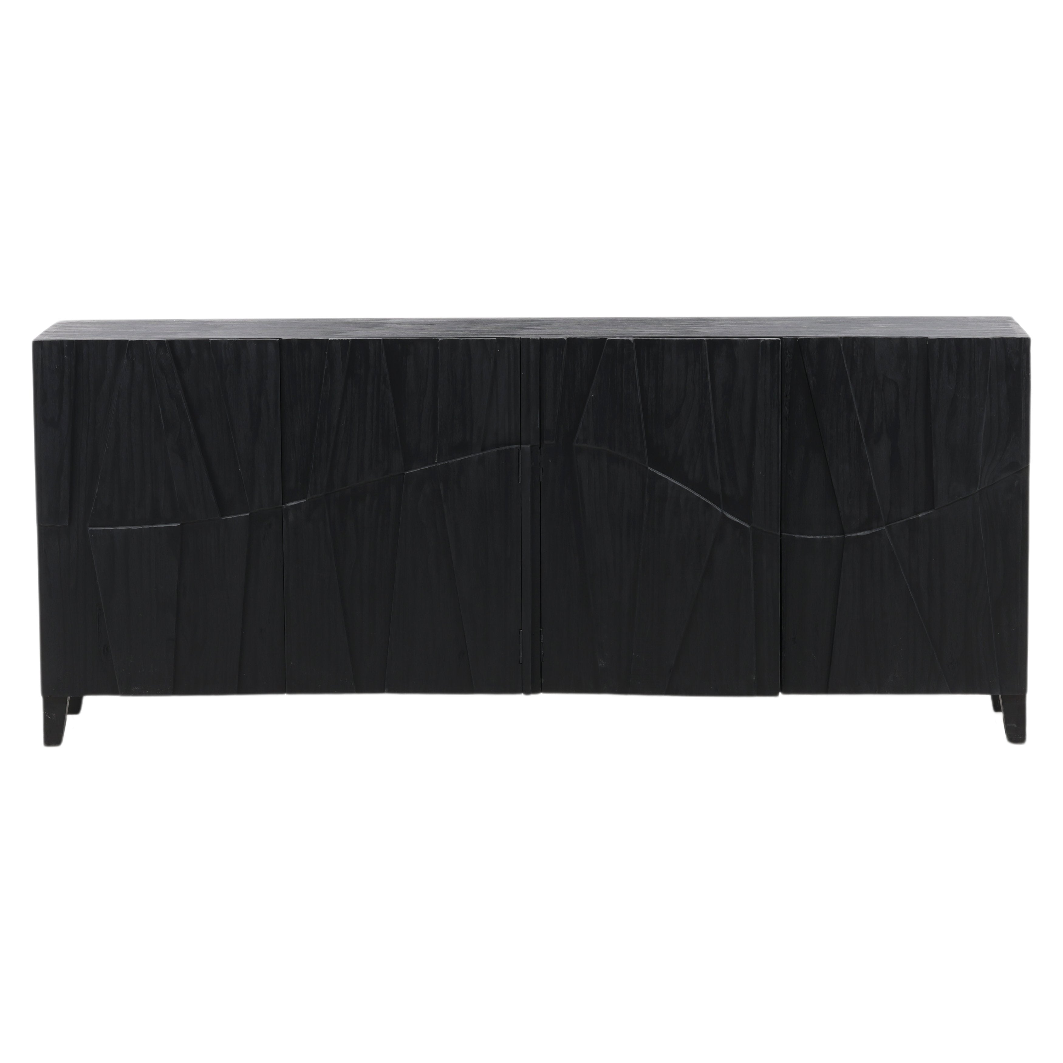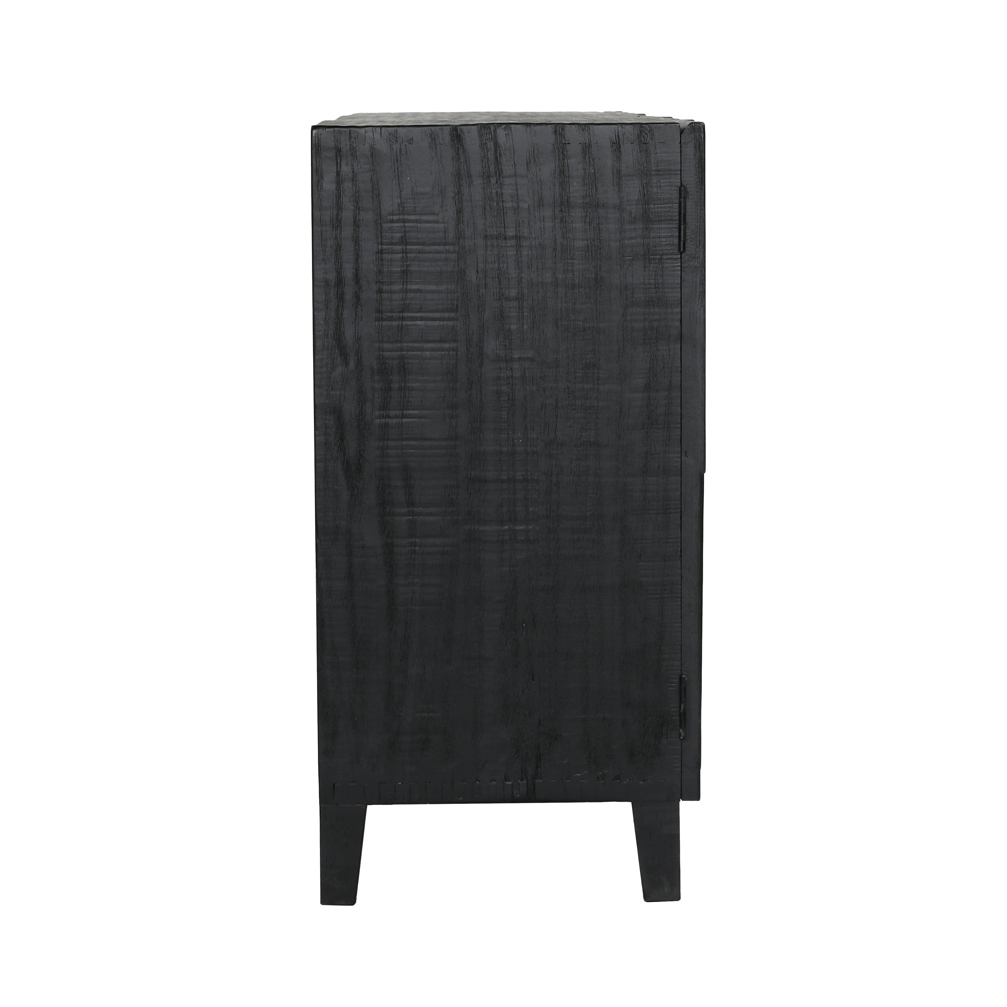 Crafted from reclaimed pine wood with abstract butterfly doors showcasing a geometric door front design. This piece exudes modern style featuring a sleek black finish and distinctive distressed detailing on the side panels.