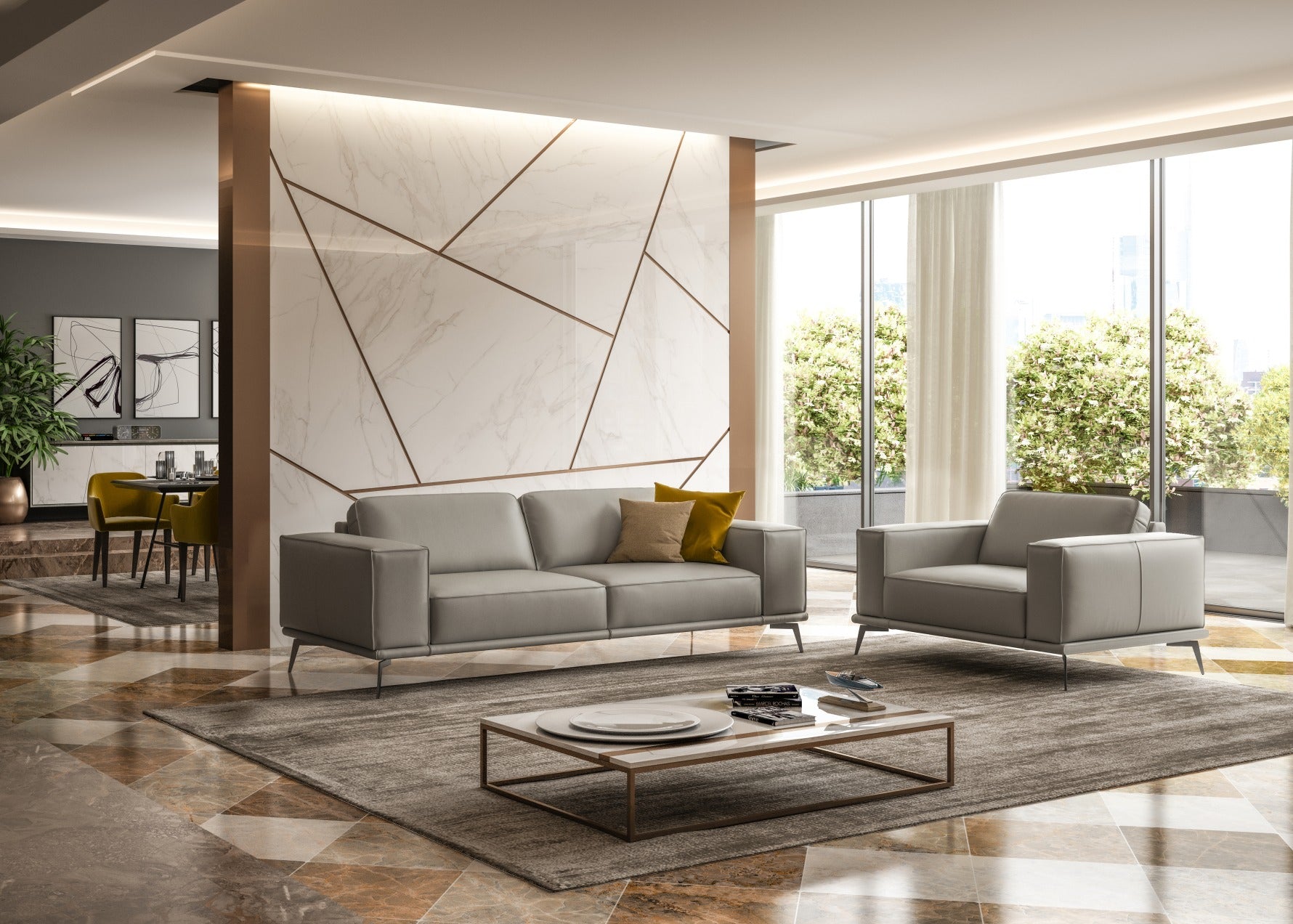 The Soho Leather Armchair is a stylish Italian Made piece that is sure to offer support and comfort. Upholstered in high grade Italian leather, this piece has a clean light grey look. Stainless Steel legs and exposed stitch details give a relaxed modern look to this contemporary armchair. Pair with the Soho sofa for a perfect pairing.