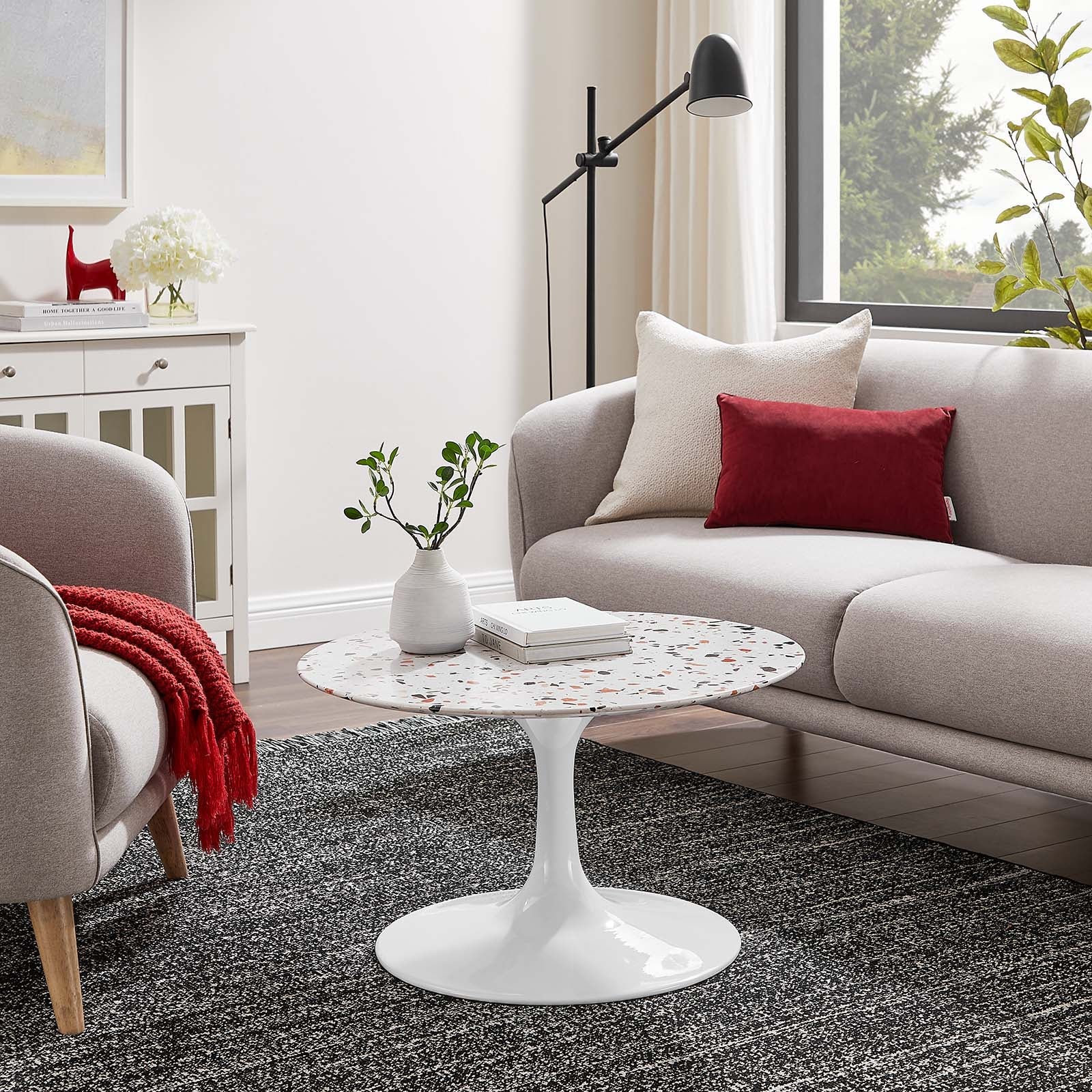 Let modern inspiration flow while gathered around the Lippa 28" Round Terrazzo Coffee Table. Perfect for hosting a morning cup of coffee or entertaining family and friends, this pedestal table features a spacious surface. Its round tabletop features a durable terrazzo construction and beveled edge for a contemporary yet timeless design. Embodying an iconic mid-century silhouette, this pedestal coffee table floats on a sleek tapered metal pedestal base with a chip-resistant lacquered finish. Includes non-marking felt pad to protect flooring. Assembly required.