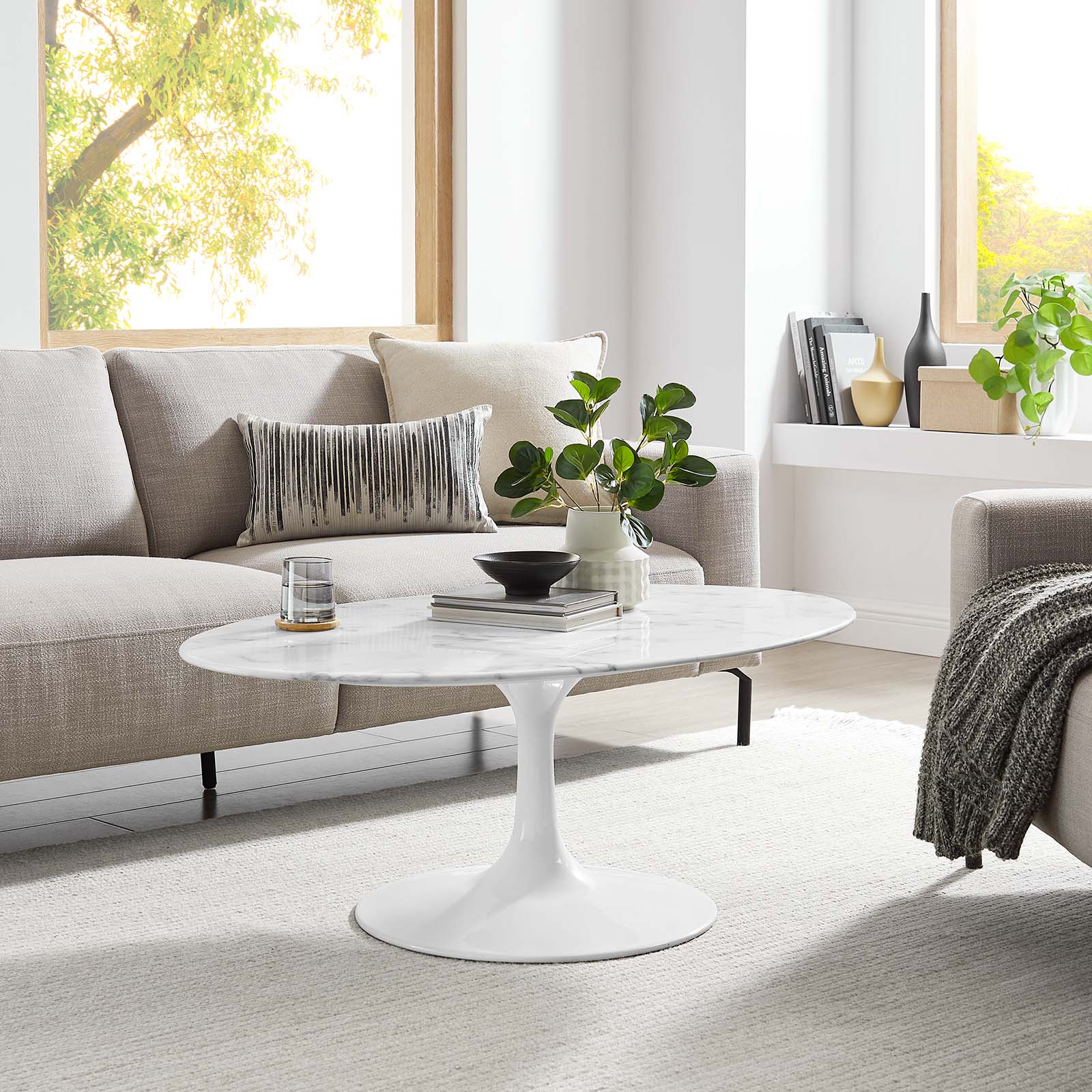 Let modern inspiration flow while gathered around the Lippa 42" Oval Artificial Marble Coffee Table. Perfect for hosting a morning cup of coffee or entertaining family and friends, this pedestal table features a spacious surface. Its oval tabletop is crafted with artificial marble and beveled edge for a contemporary yet timeless design. Embodying an iconic mid-century silhouette, this pedestal coffee table floats on a sleek tapered metal pedestal base with a chip-resistant lacquered finish. Includes non-marking felt pad to protect flooring. Assembly required.