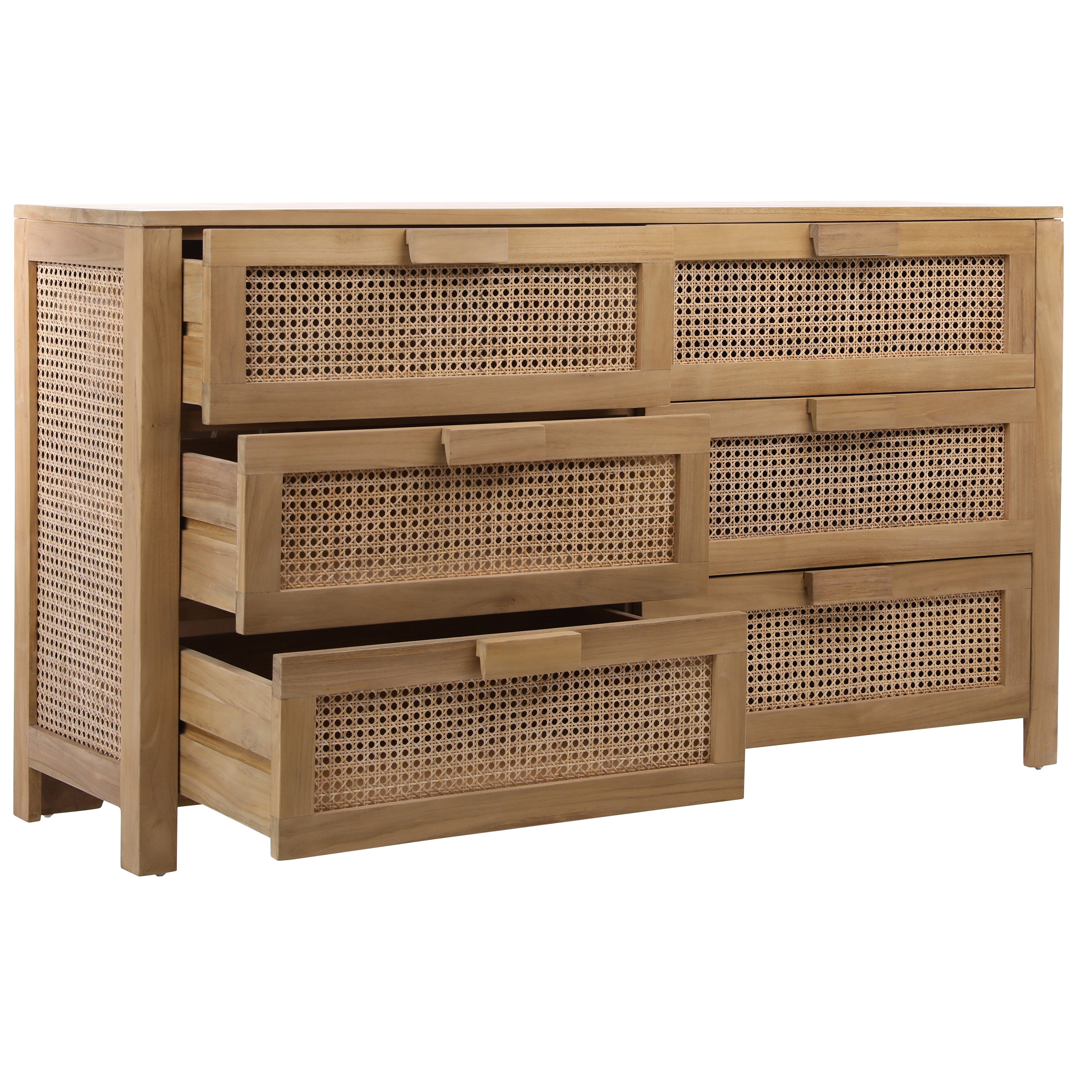 This beautifully designed 63 teakwood dresser will be the perfect companion to both modern and traditional aesthetics. Featuring rattan details that add texture and an artisan touch to the six drawers and side panels. The ample interior offers plenty of storage for dining room or bedroom essentials.