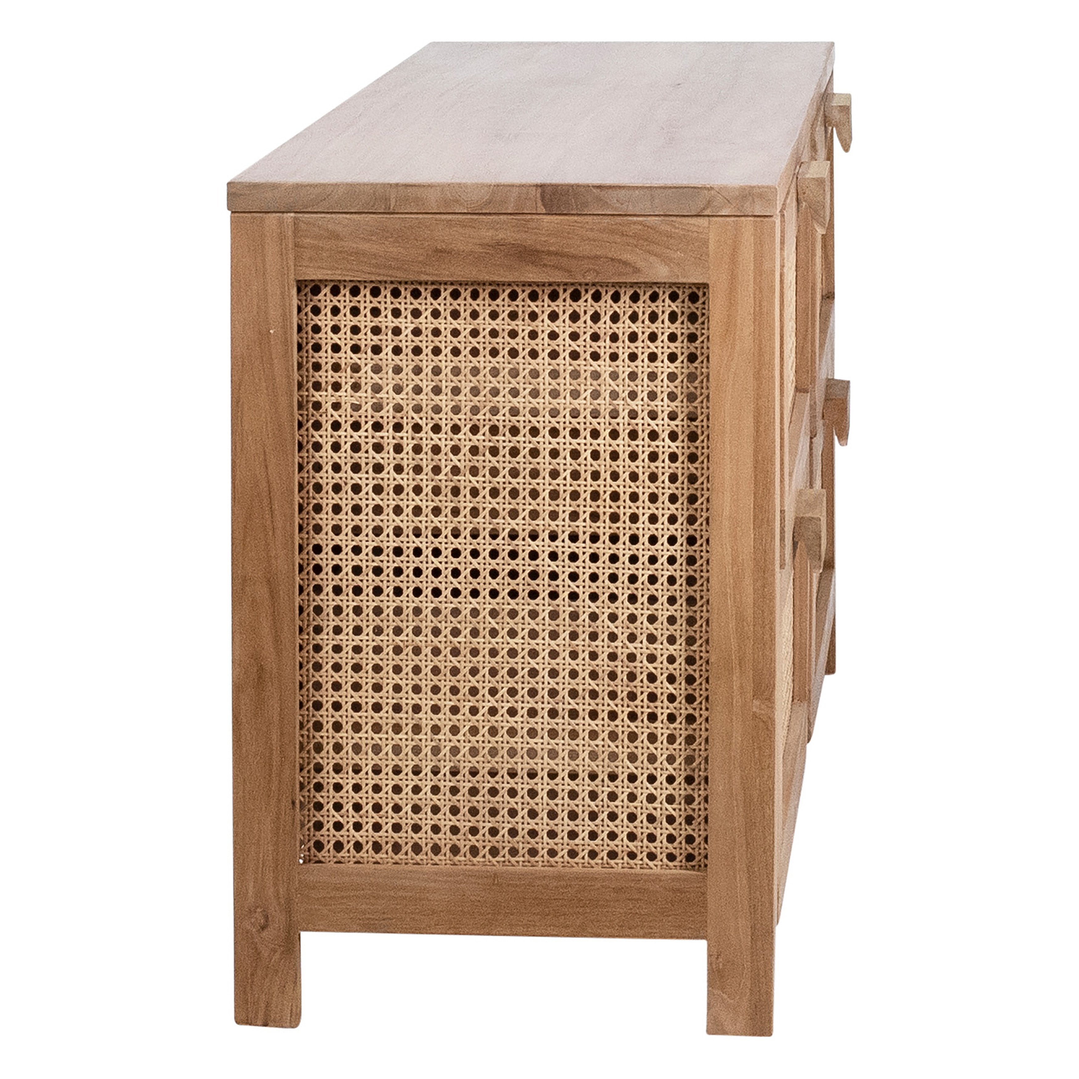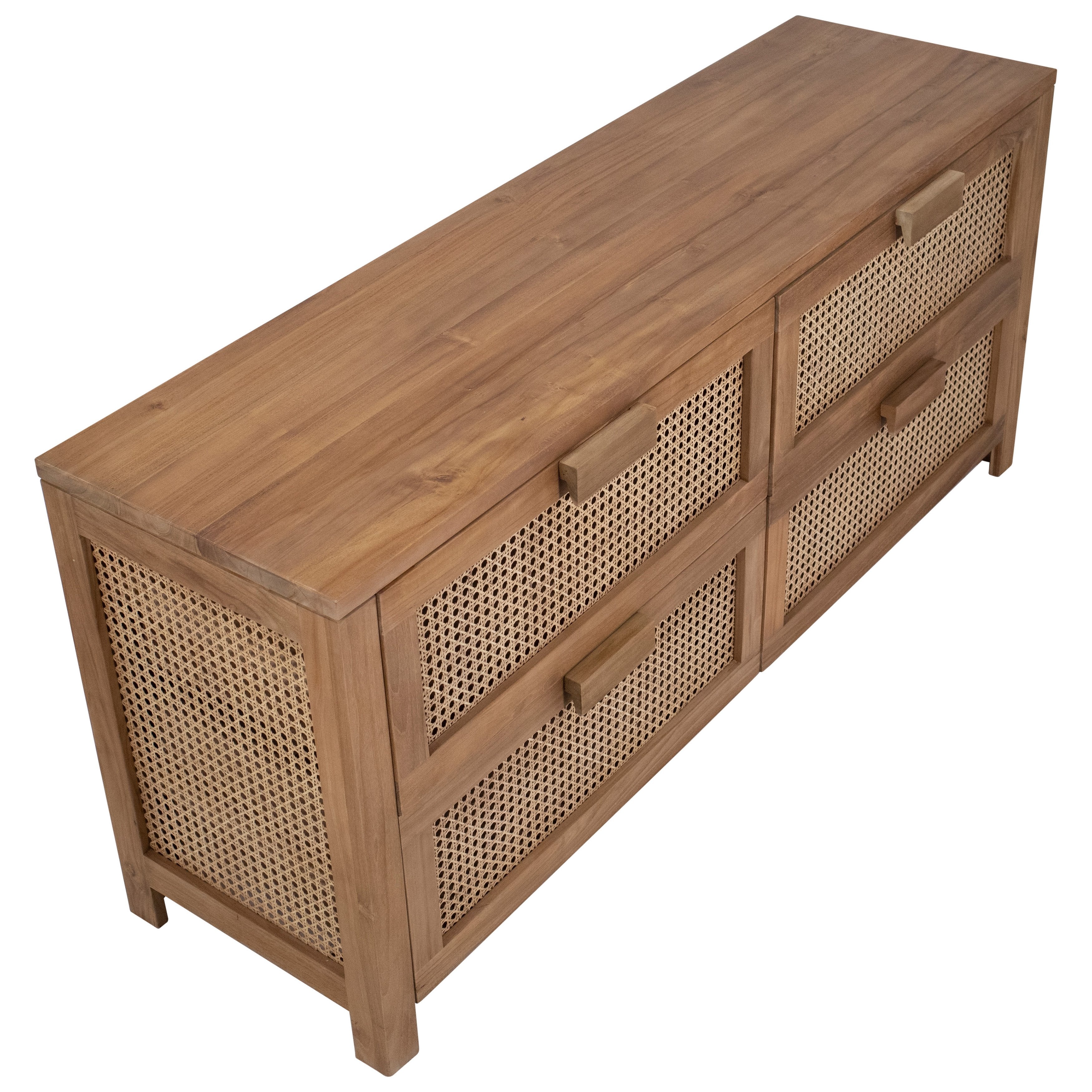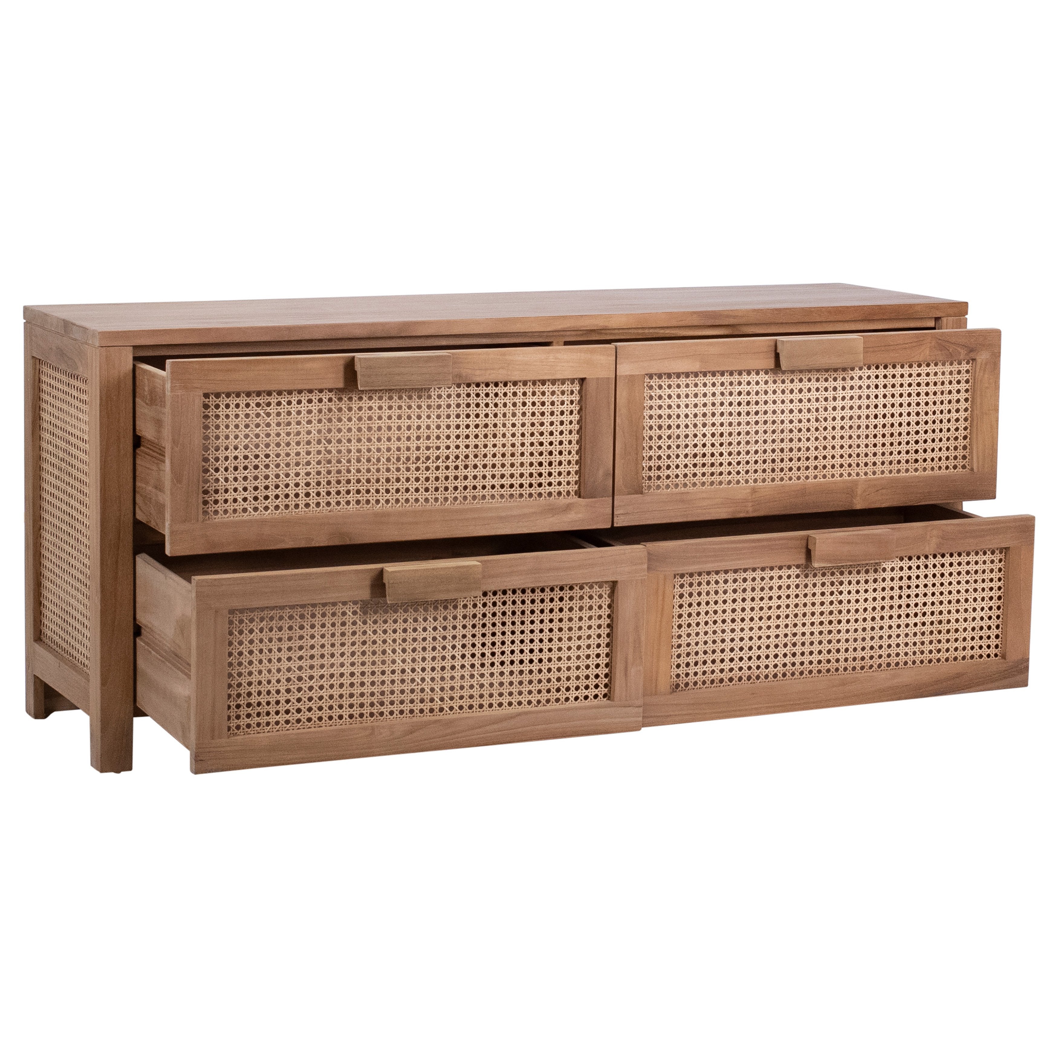 This beautifully designed 63 teakwood sideboard will be the perfect companion to both modern and traditional aesthetics. Featuring rattan details that add texture and an artisan touch to the four drawers and side panels. The ample interior offers plenty of storage for dining room or bedroom essentials.
