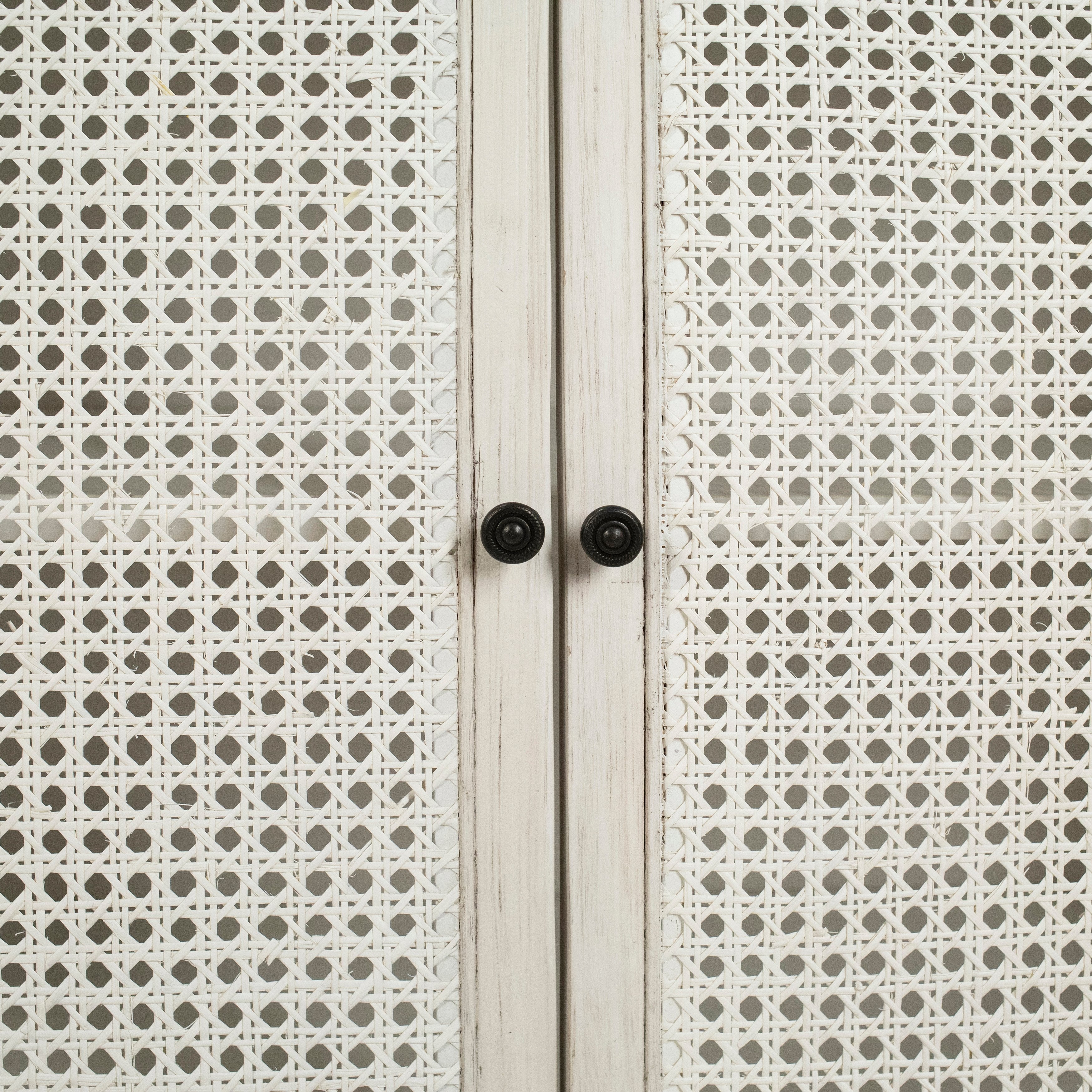 Perfectly designed to refresh your décor with modern, coastal flair. This 66 sideboard is made of acacia wood in an antique whitewash finish with rattan details in each door panel. Featuring three cabinet doors that open to four interior shelves that can accommodate dinnerware, electronics, or office supplies.
