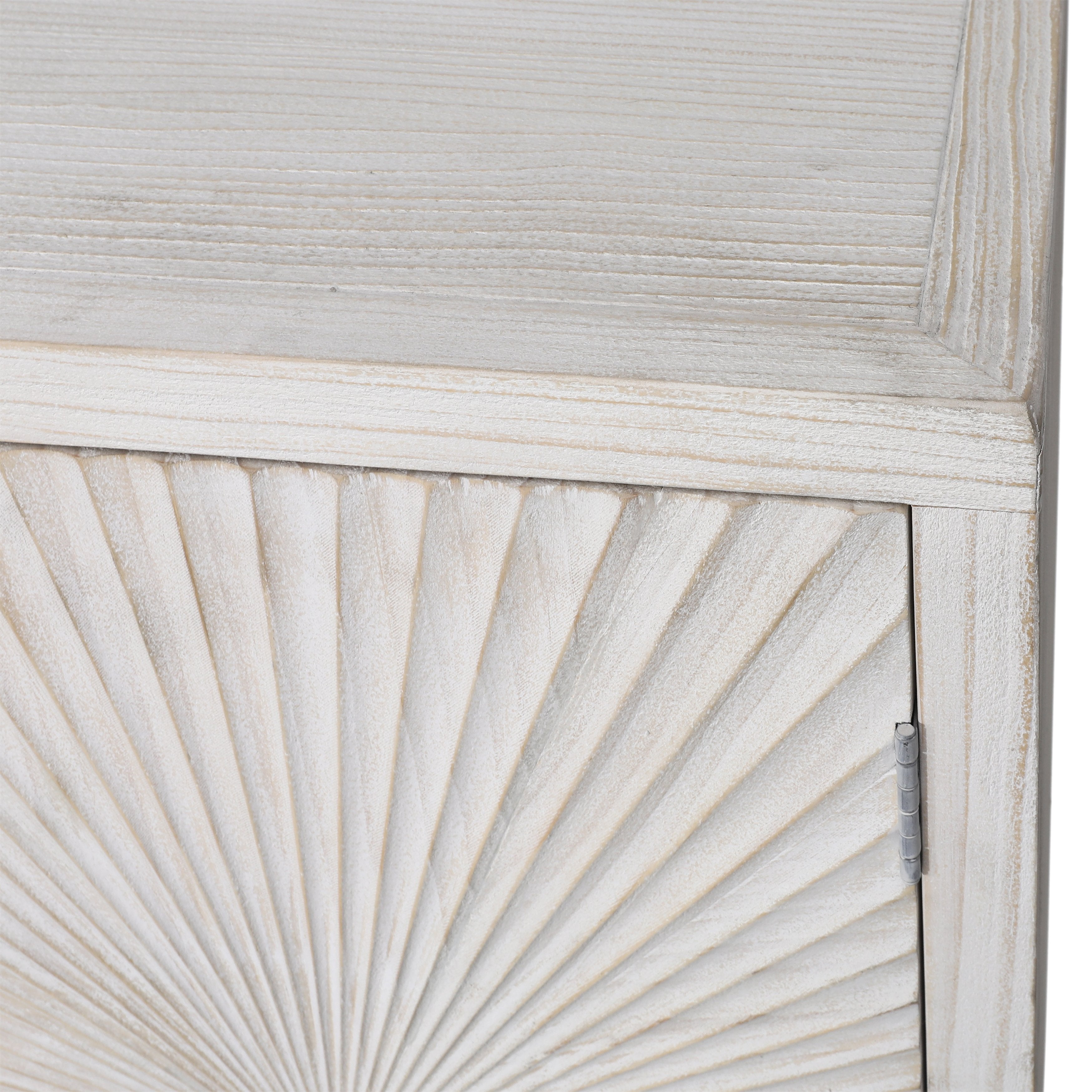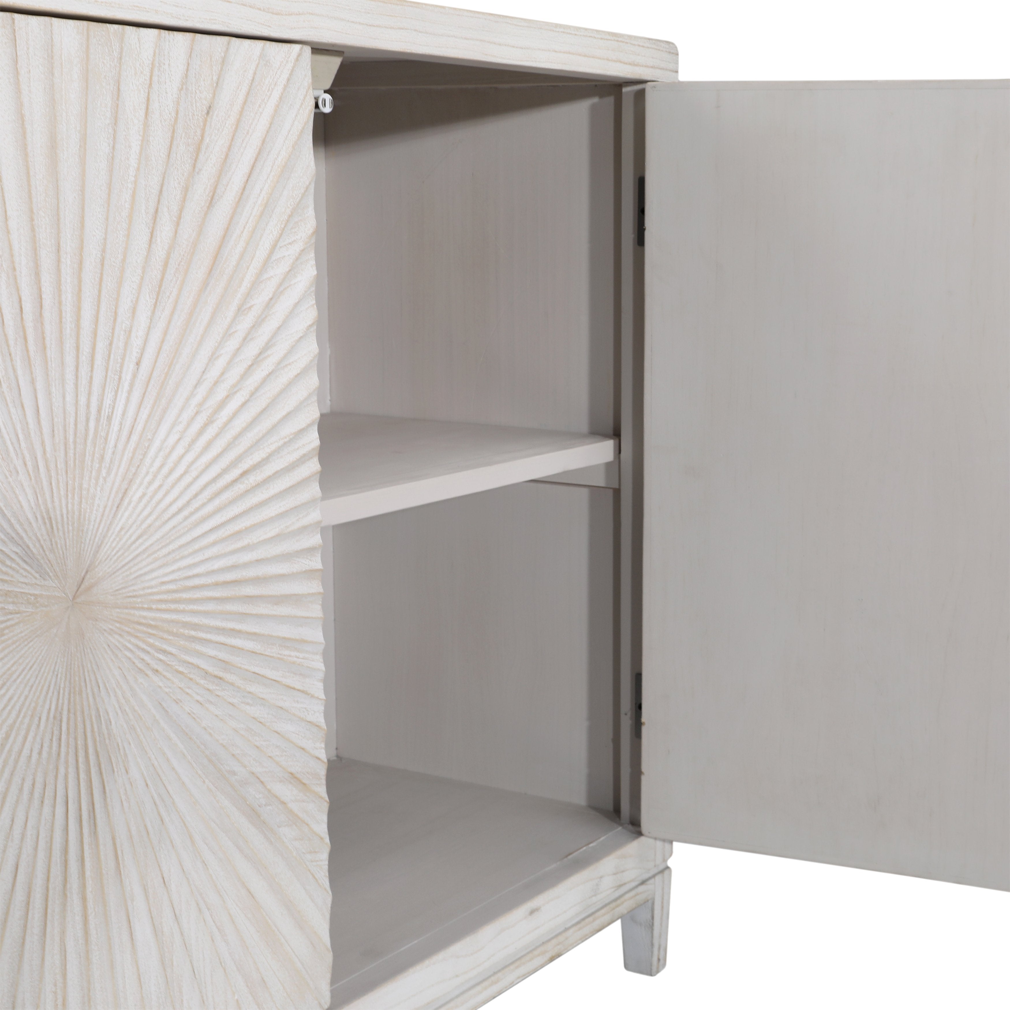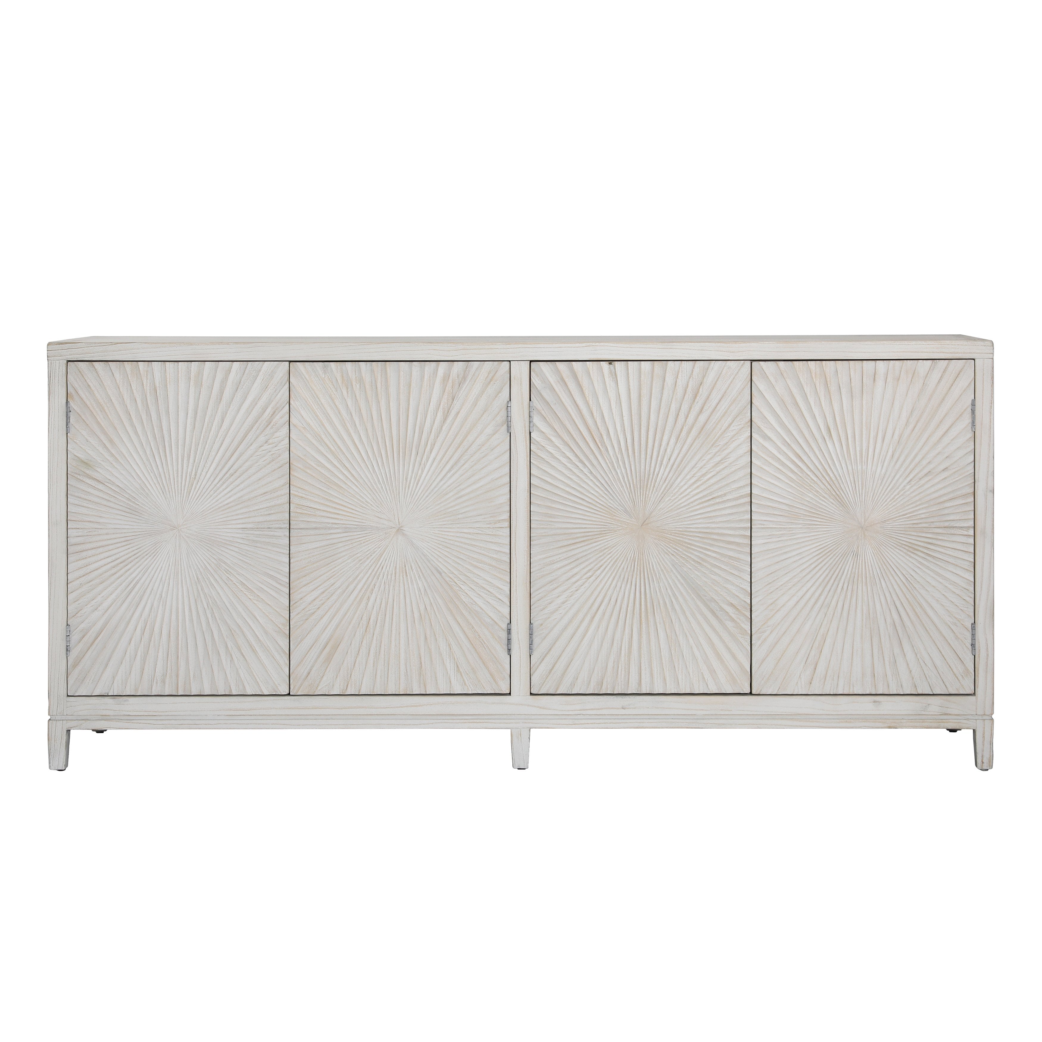 Made from solid pine wood, this stunning sideboard stretches 79 long. Featuring two sets of butterfly doors with a carved sunburst pattern that radiates from the center of each door panel. The inside features large built-in shelves for additional storage. Finished in a light warm wash finish, this sideboard will add fresh beauty to any room.