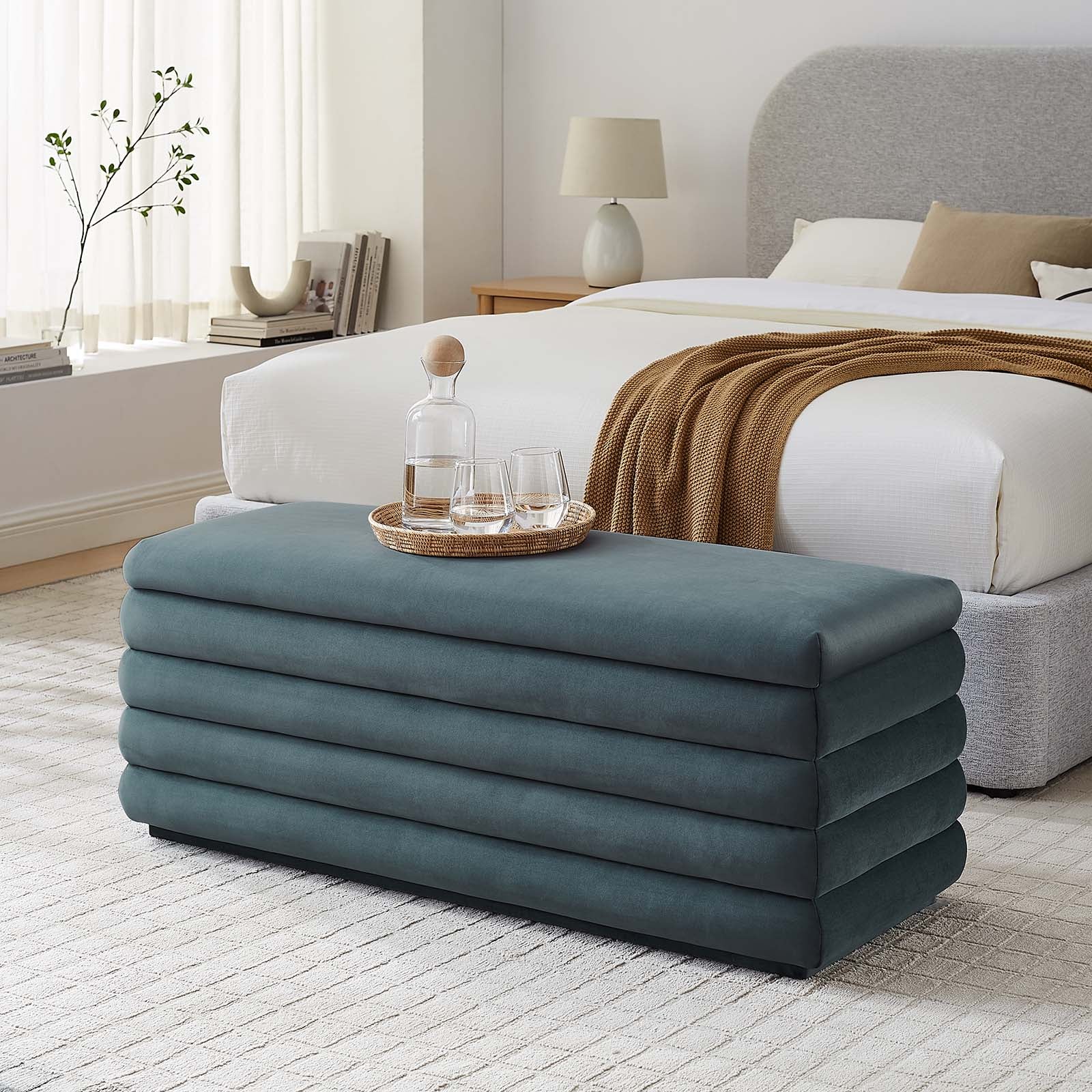 Elevate your home’s comfort and elegance with the Mezzo Performance Velvet Storage Ottoman. Padded with dense foam and wrapped in a luxe, stain-resistant performance velvet, this storage bench for the living room or bedroom is as practical as it is striking with its plush channel tufted detail. The stay-open hinge adds convenience, revealing a spacious storage area ideal for stowing linens, games, home accents, and more. Perfectly suited as a storage bench for the entryway or as a chic bed bench, Mezzo offers versatile use with its non-marking floor glides to protect your surfaces. Its robust design, coupled with the lush texture of performance velvet, makes it a centerpiece in any room. Arriving fully assembled, this bedroom bench saves you time and effort, allowing you to instantly enjoy its splendor and spacious utility. Weight Capacity: 617 lbs.