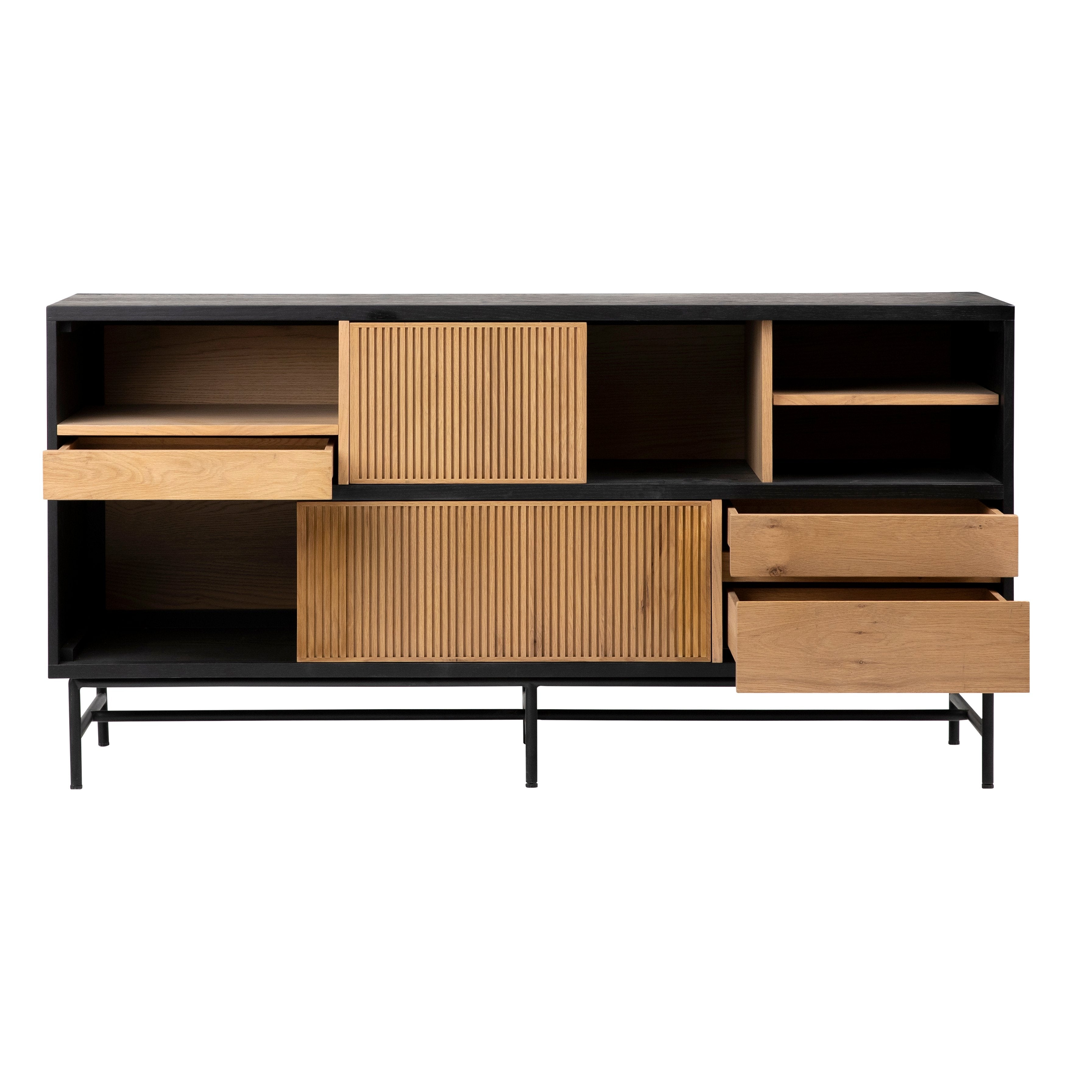 A contemporary design and beautiful silhouette perfectly blended with gentle natural wood and raven black contours. Our Modesto Sideboard is constructed with solid oak wood, oak veneer, and a steady metal base. Measuring approximately 32" in height and 63" in width with plenty of storage compartments, its unique figure and textures create a distinctive character to highlight the beauty of your personal items.