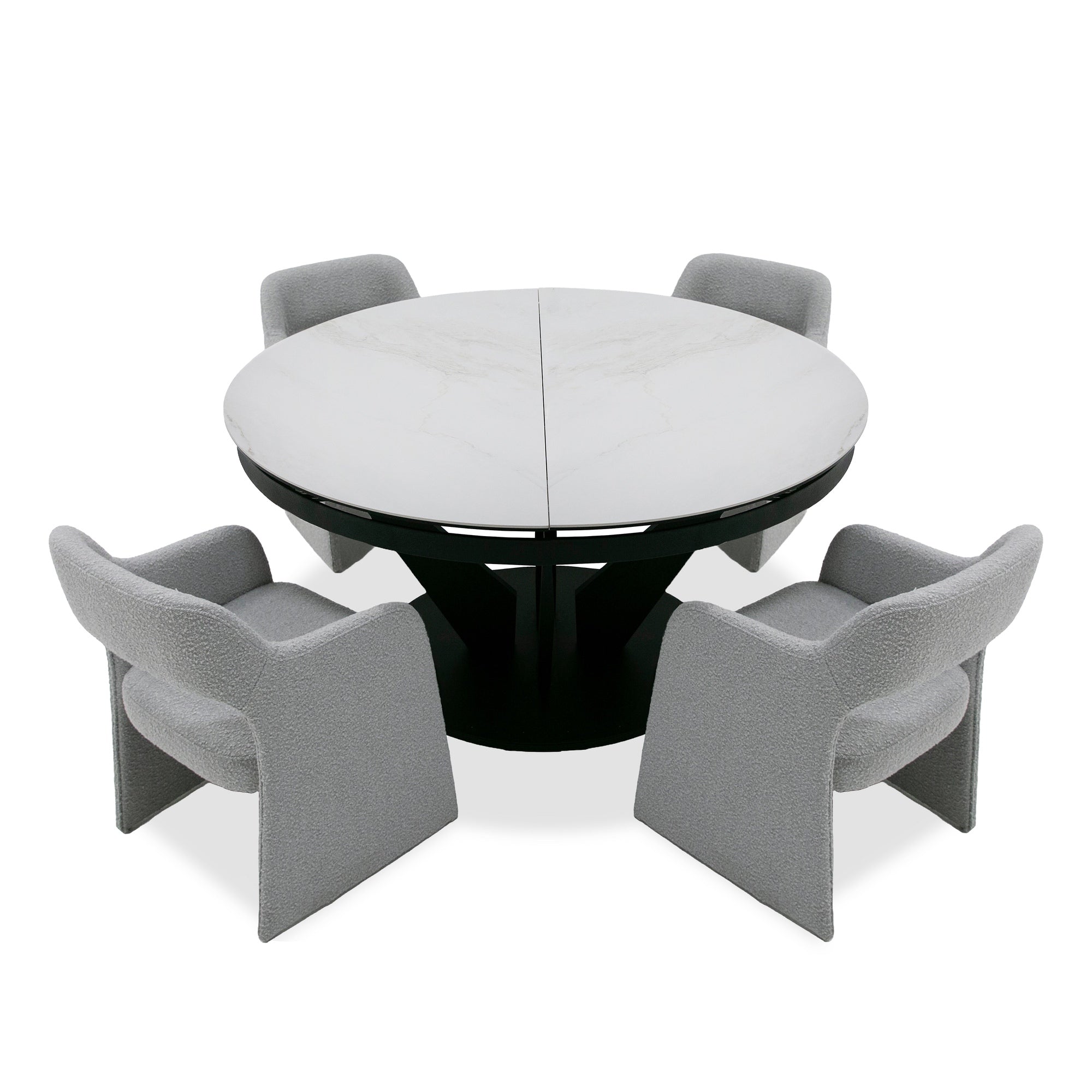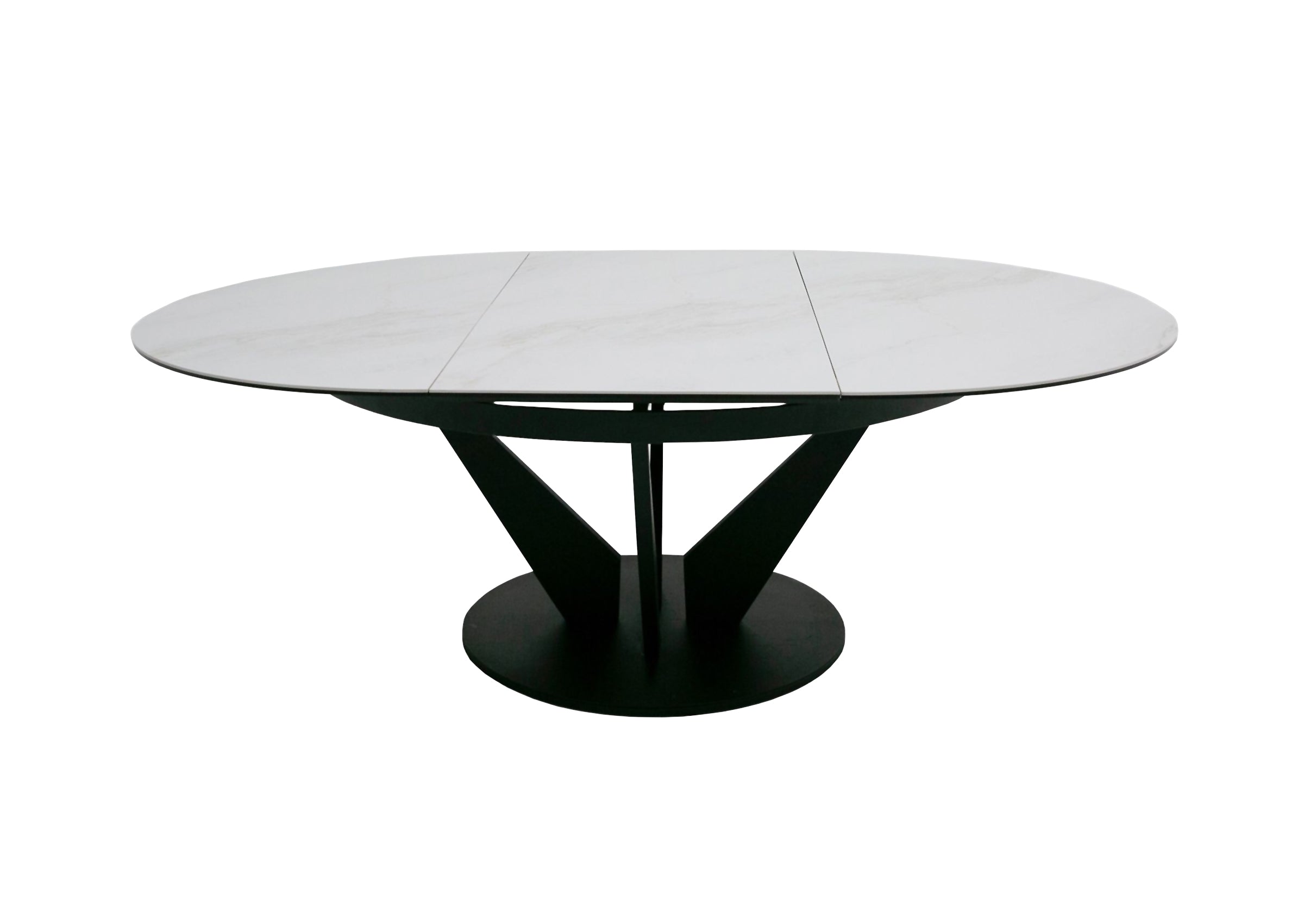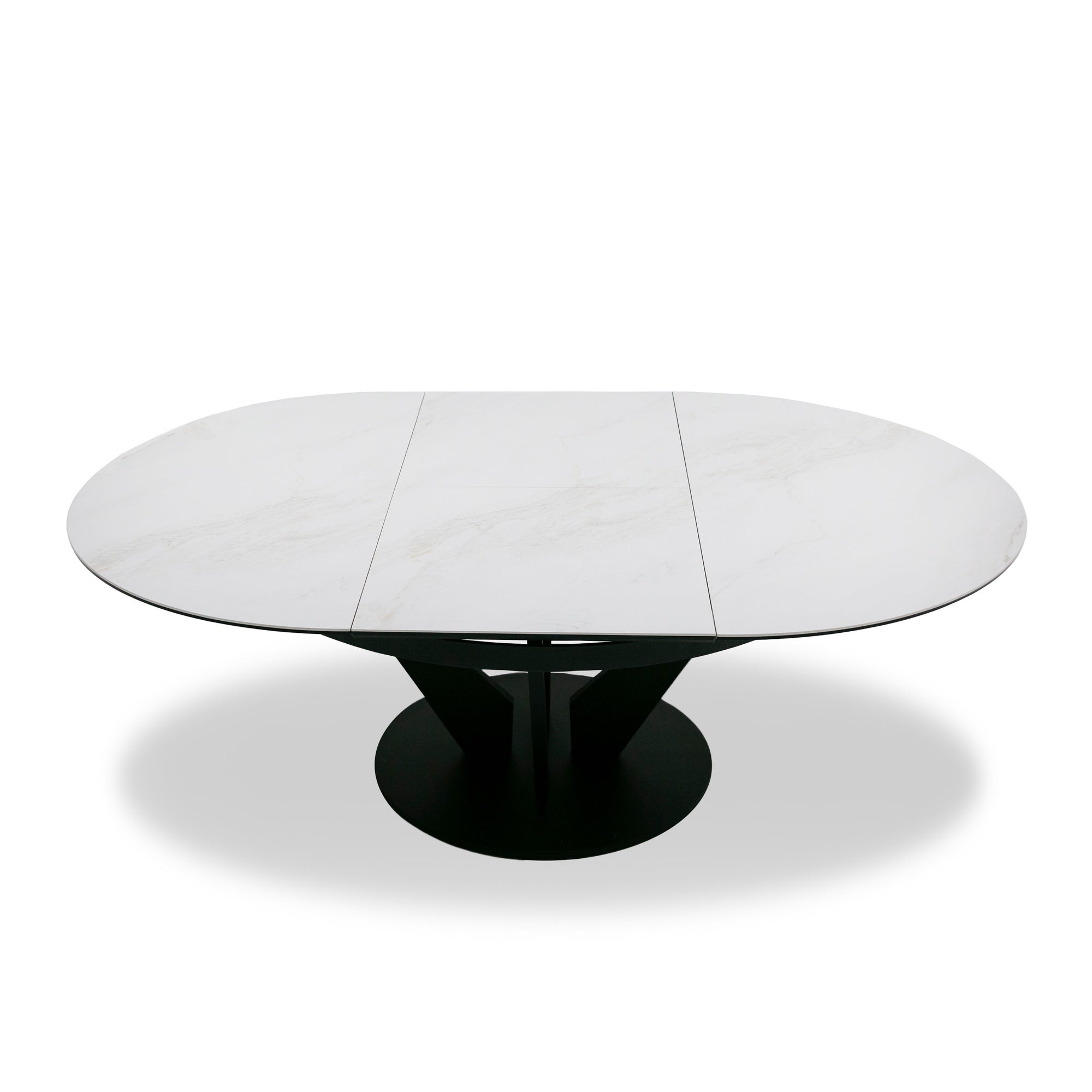 The Modrest Alberta Modern Oval Dining Table combines sleek design with practical functionality. Its white marble-look ceramic top exudes elegance, while the black iron pedestal base provides stability. This extendable table comfortably seats 4 and expands to accommodate 6 when fully extended. Perfect for both intimate dinners and larger gatherings!