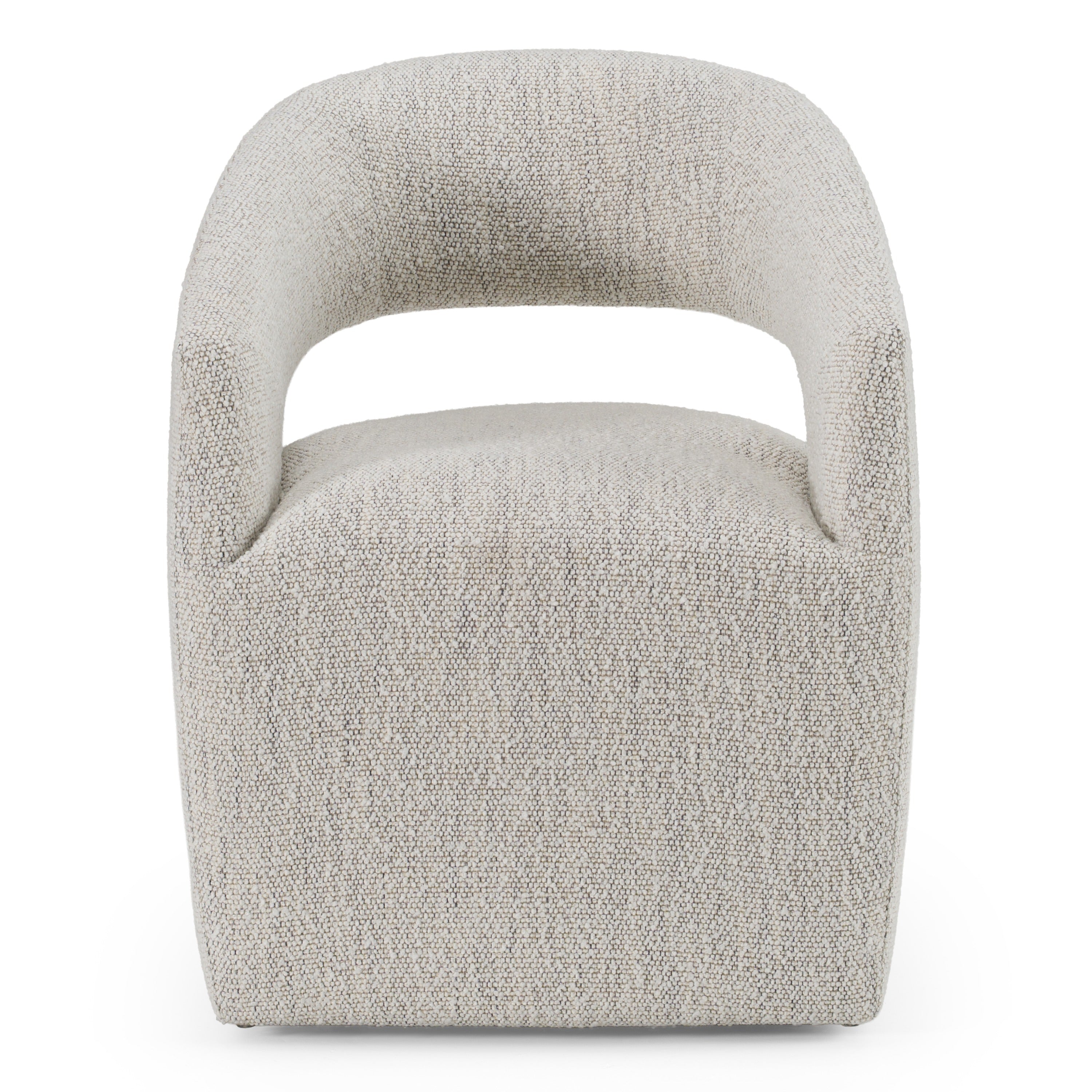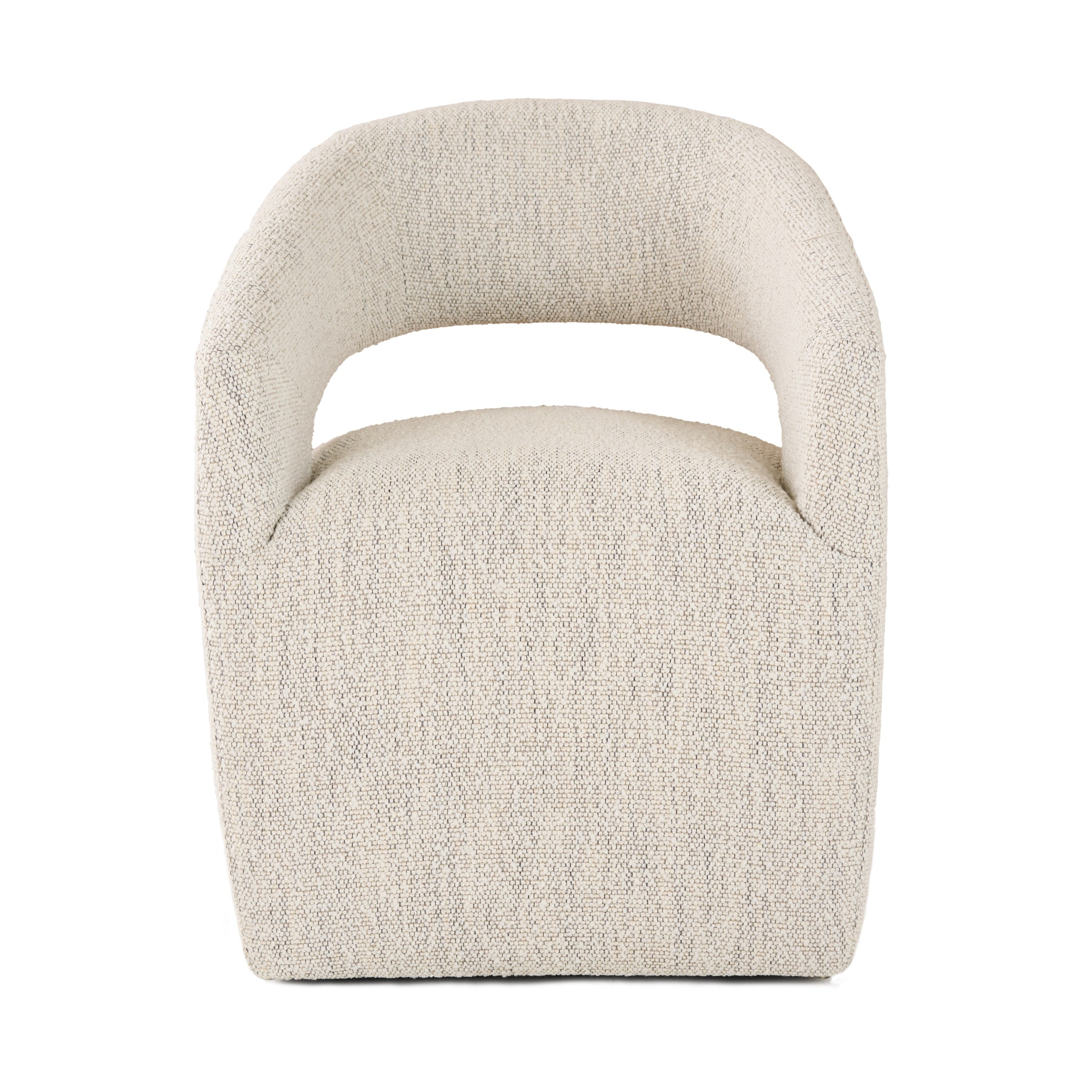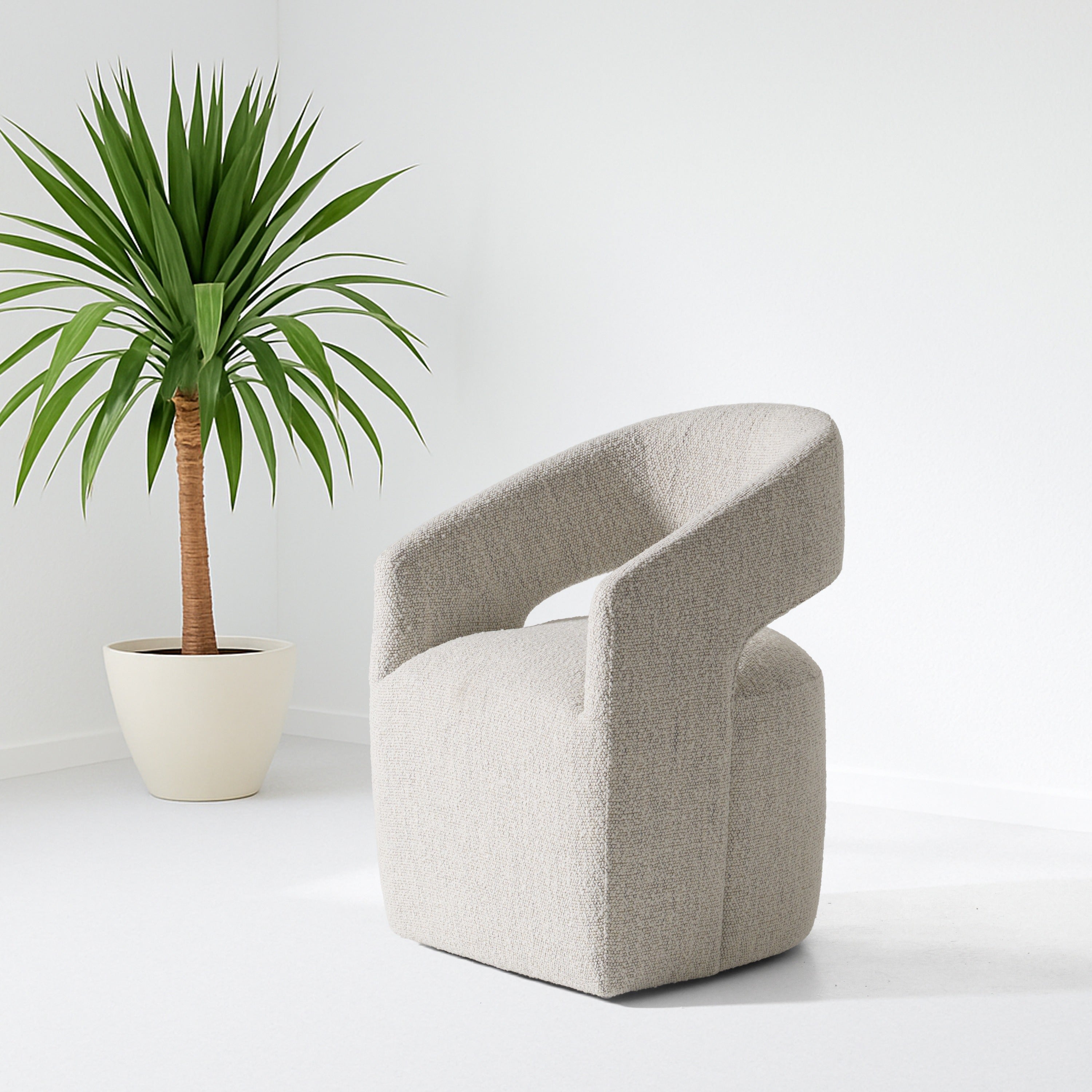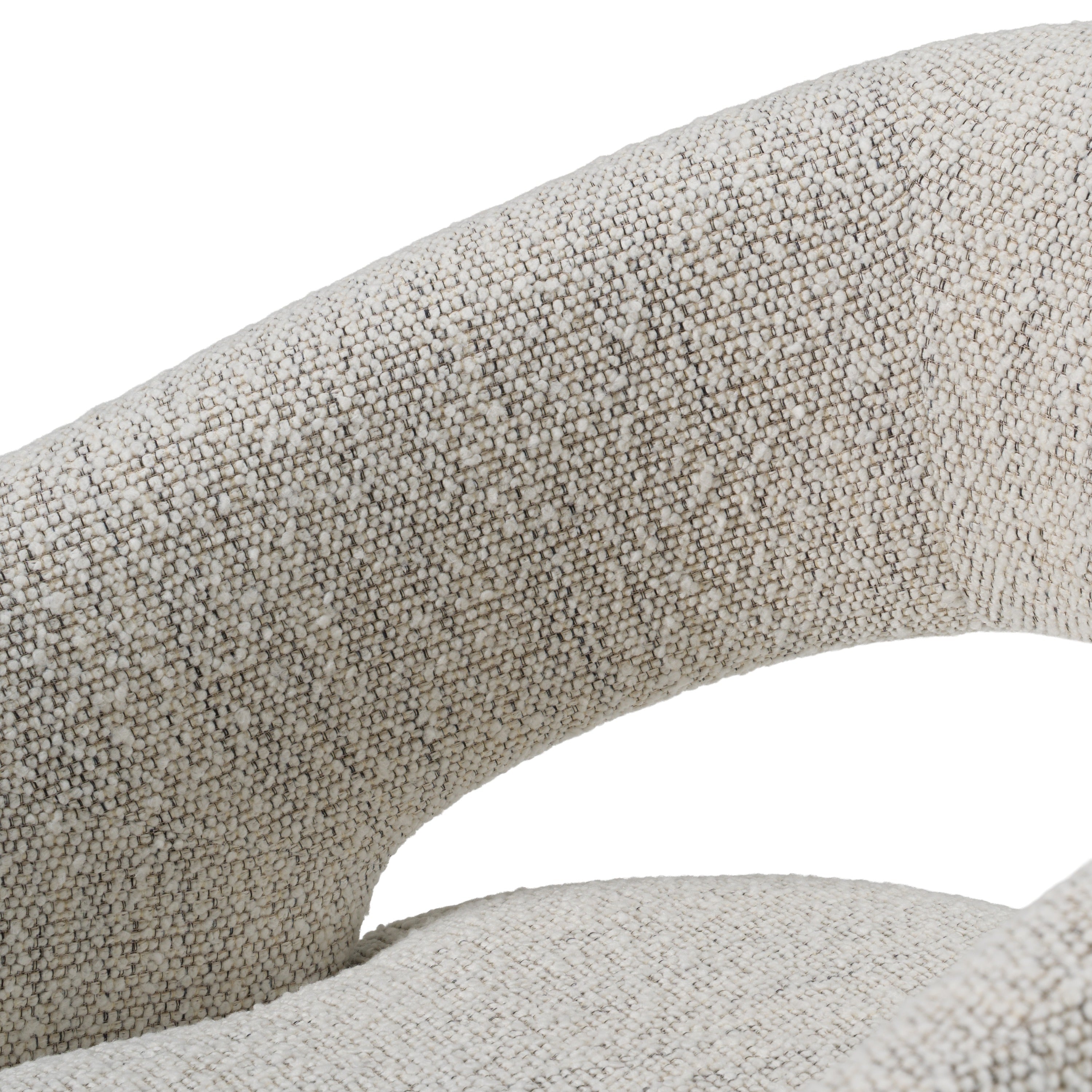 Our Angie Accent Chair has a simple silhouette and contemporary aesthetic with clean lines. With sleek, inviting contours and cut out back that makes for an Art Deco feel. Foam wrapped in a textured cream fabric makes this a desirable choice to brighten any room.