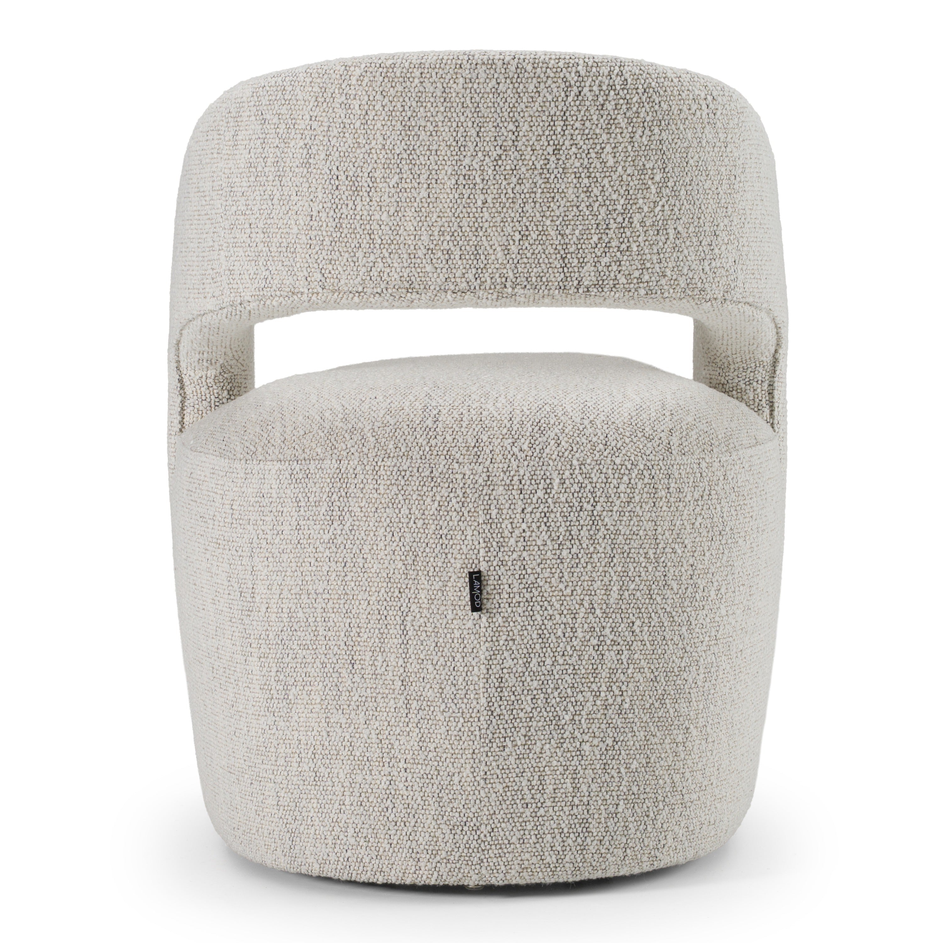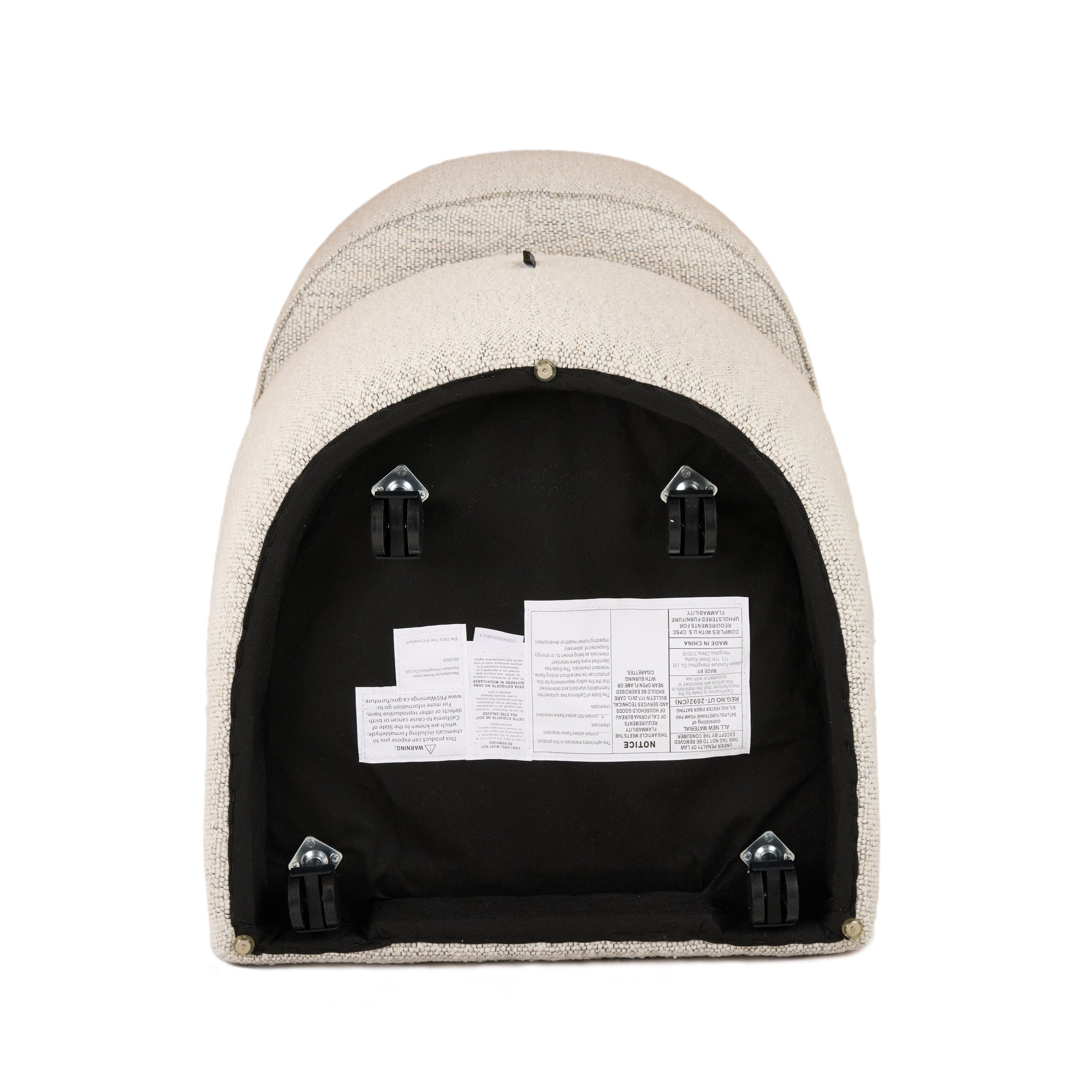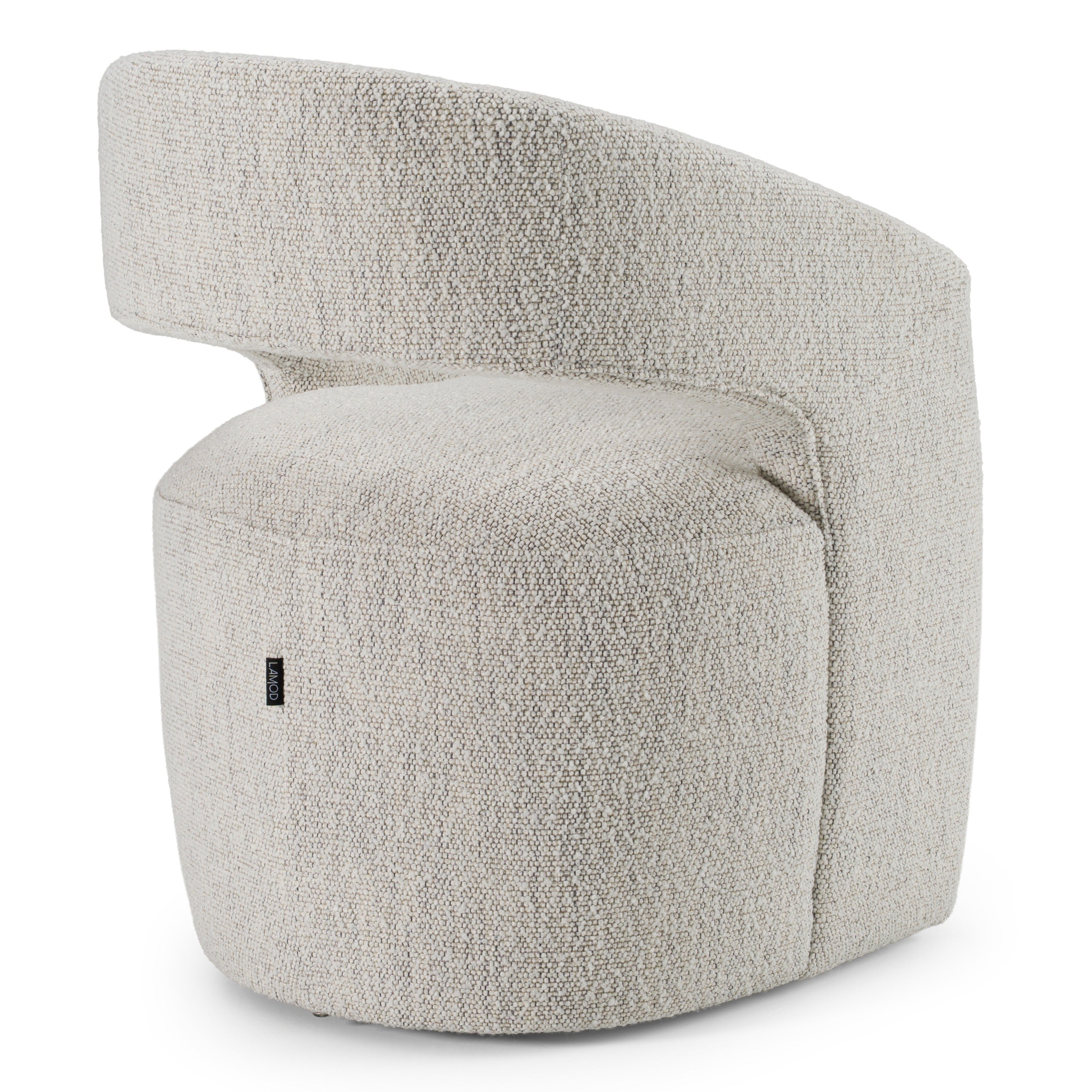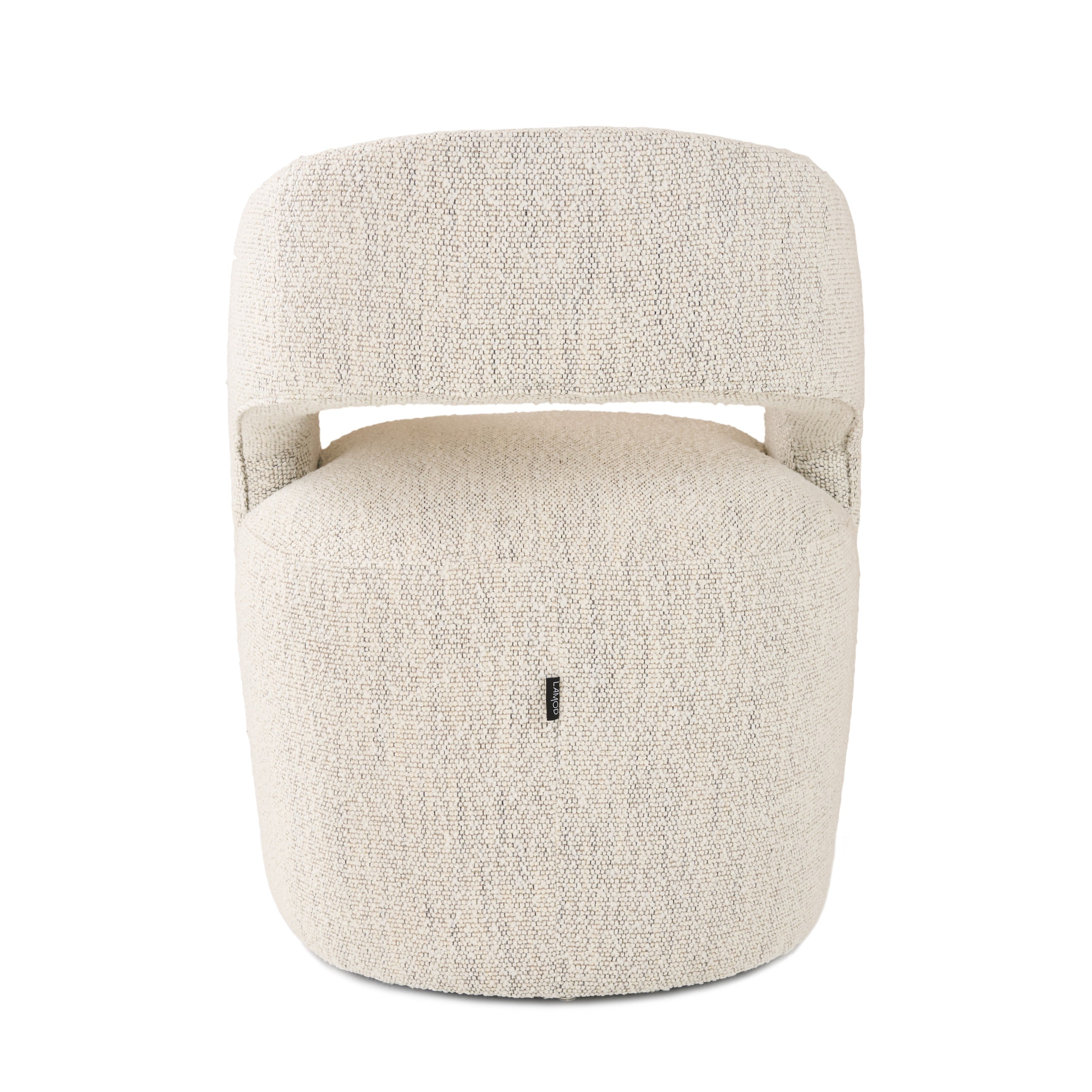 Our Angie Accent Chair has a simple silhouette and contemporary aesthetic with clean lines. With sleek, inviting contours and cut out back that makes for an Art Deco feel. Foam wrapped in a textured cream fabric makes this a desirable choice to brighten any room.