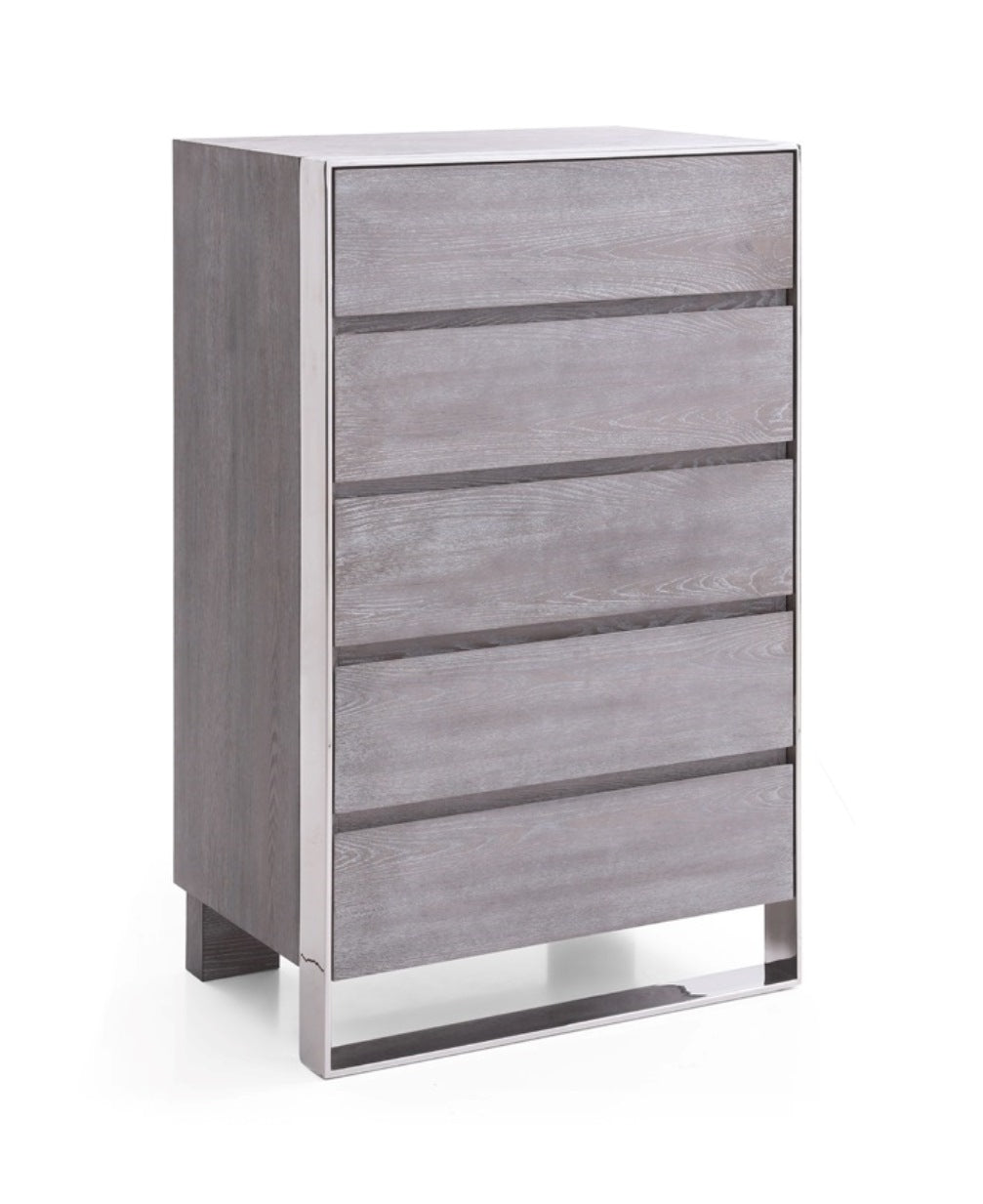 Organize your clothes and other stuff with the Modrest Arlene Modern Grey Elm Chest. Exhibiting a toned-down look that works well in both contemporary and mid-contemporary themes, it features a clean-lined profile finished in grey Elm Veneer. A polished stainless steel frame borders the sides and top front edge that extends to form as its front legs. Elm Veneer was used for the hind legs. This modern chest is also useful in your home office.