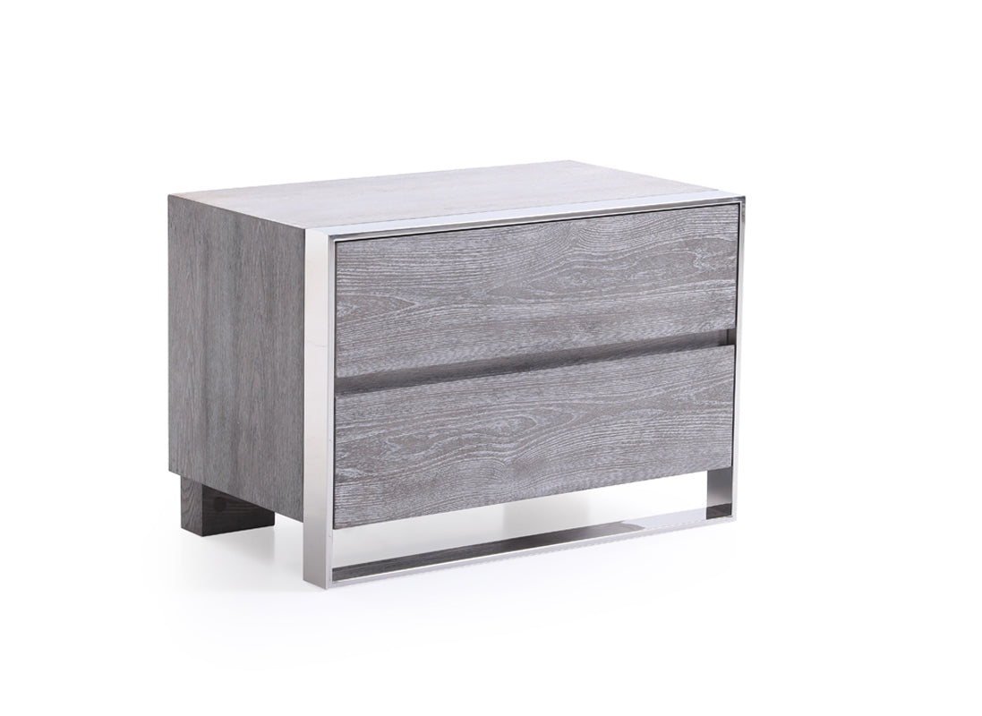 The Arlene Bedroom Set is the perfect modern haven. The striking stainless steel four poster bed is low profile and delicate. Grey elm veneer finishes the faces of this lovely set while the frames are created using a polished stainless steel. This glam set includes bed, two nightstands, dresser, and mirror.