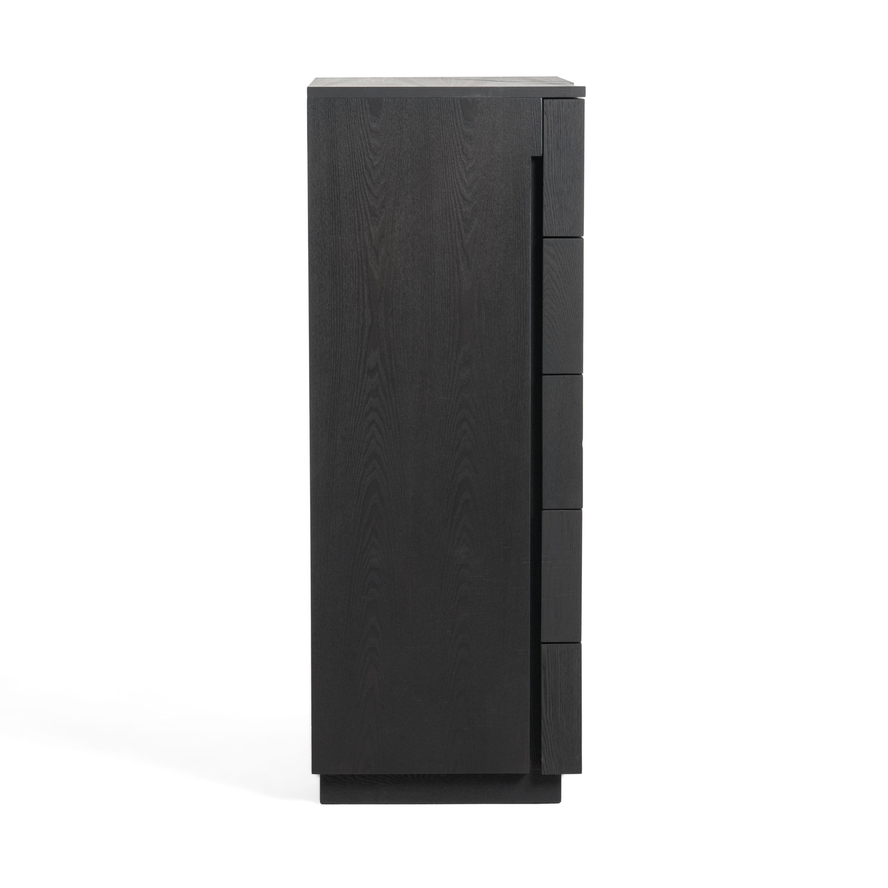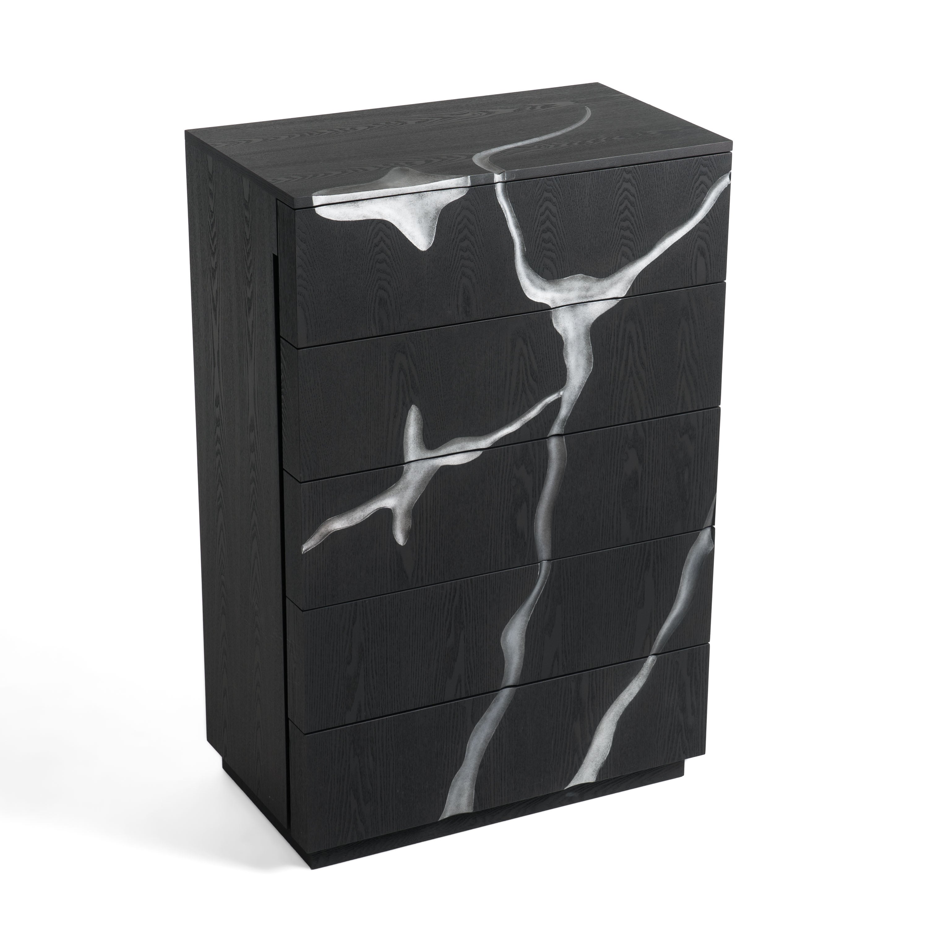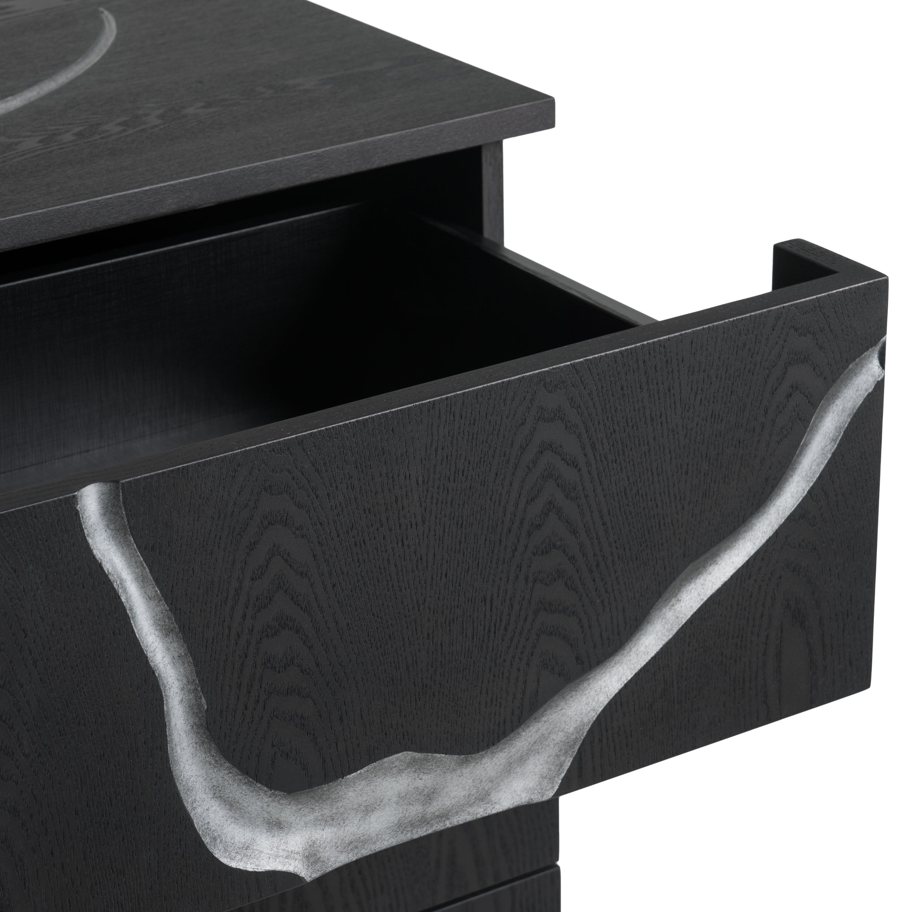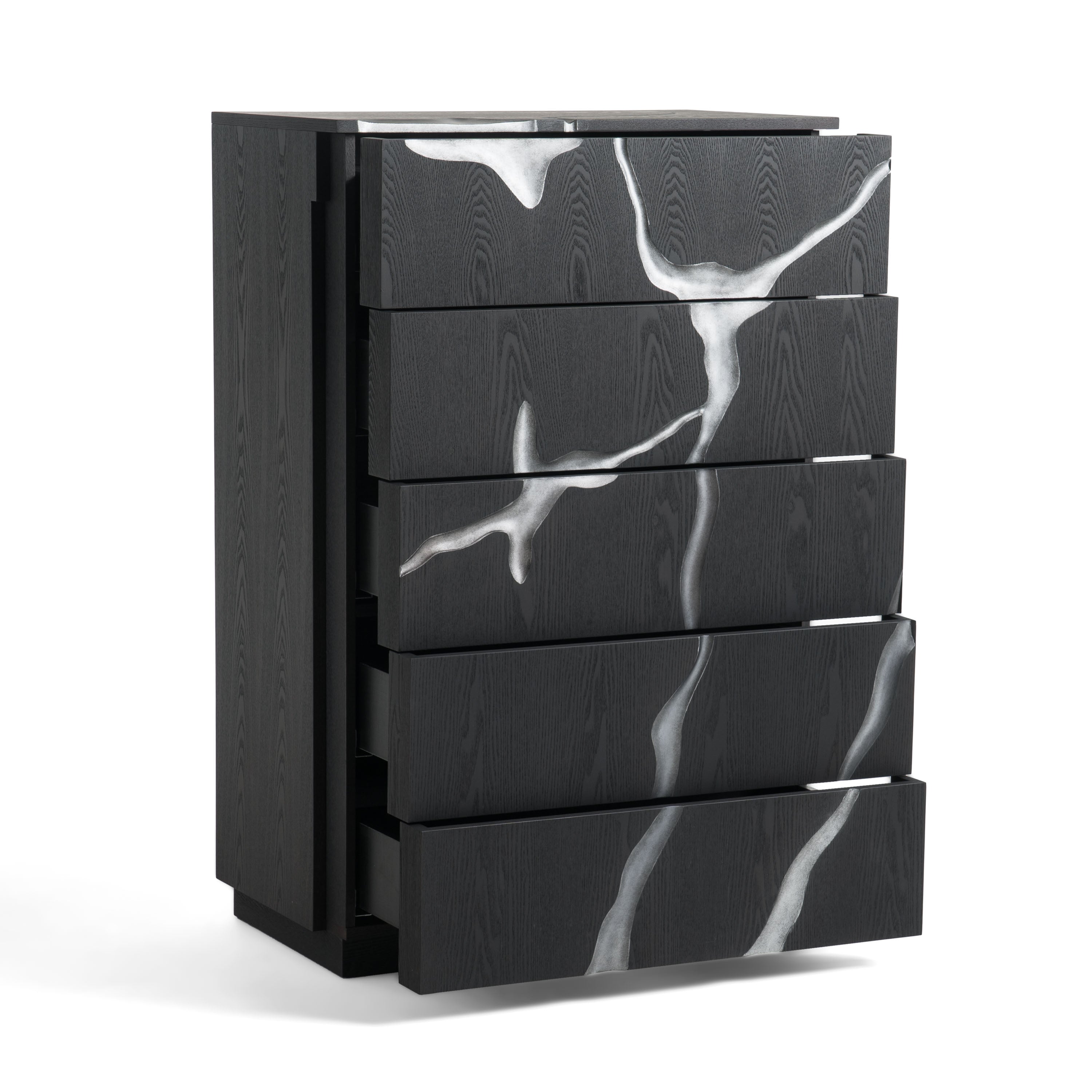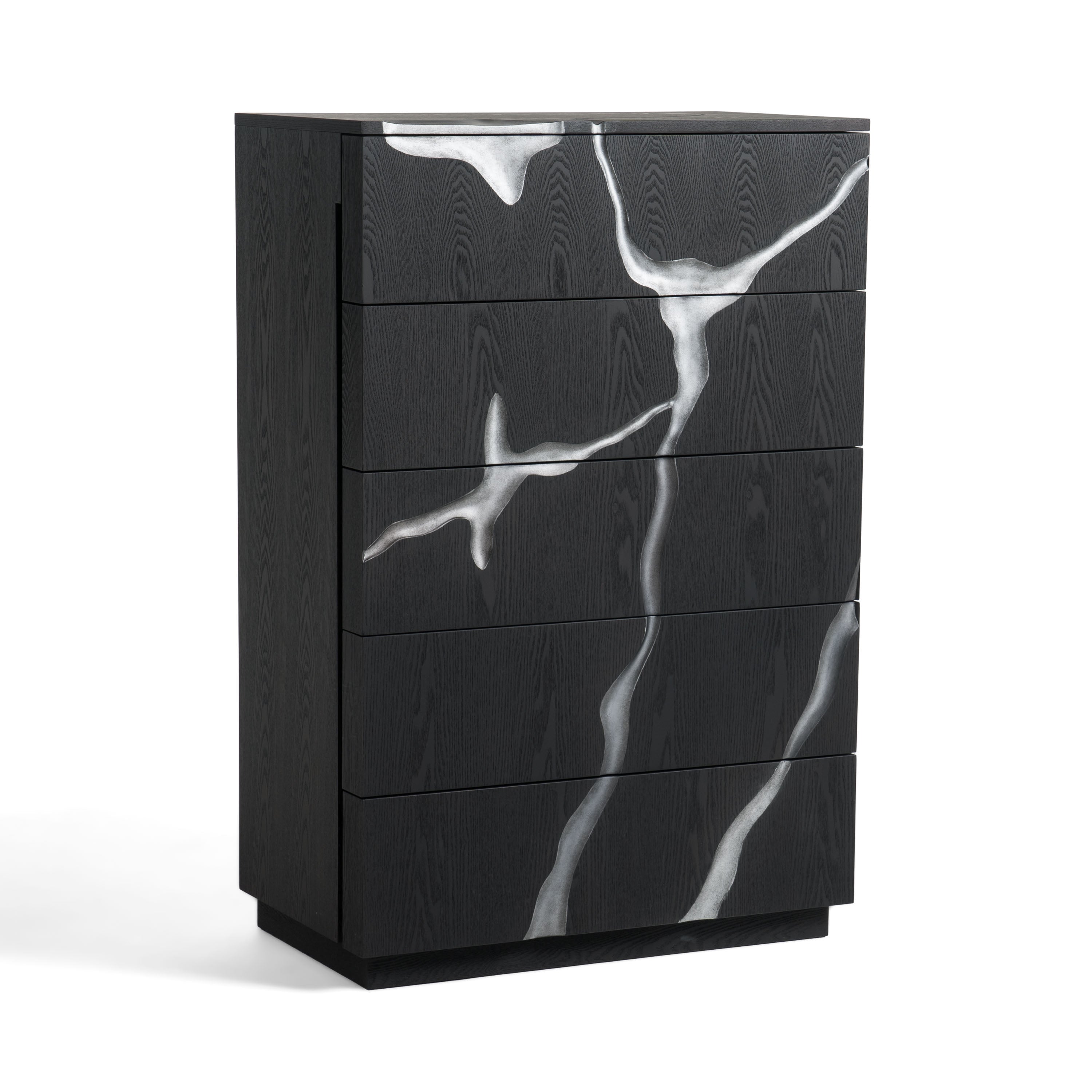 Breathing visual style into your room is the Aspen Modern Brown Ash & Silver Chest. Fitted with five soft-closing drawers, This modern chest features a lustrous brown ash finish punctuated with artistic silver painted accents. The drawers have pulls hidden on their sides to preserve its functionality. Sitting atop a sturdy brown base, the Modrest Aspen chest is a perfect accent piece in any contemporary space in your home.