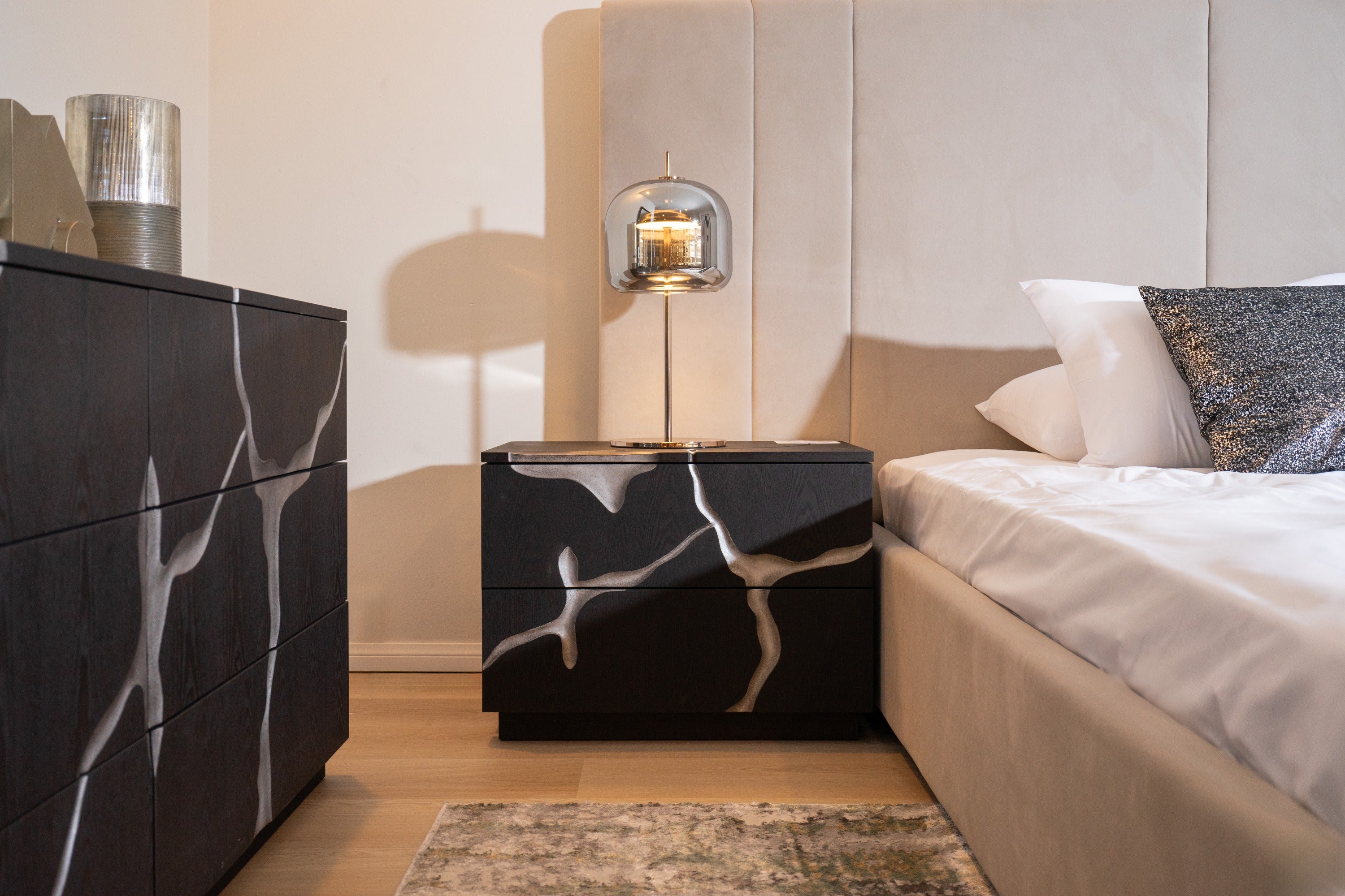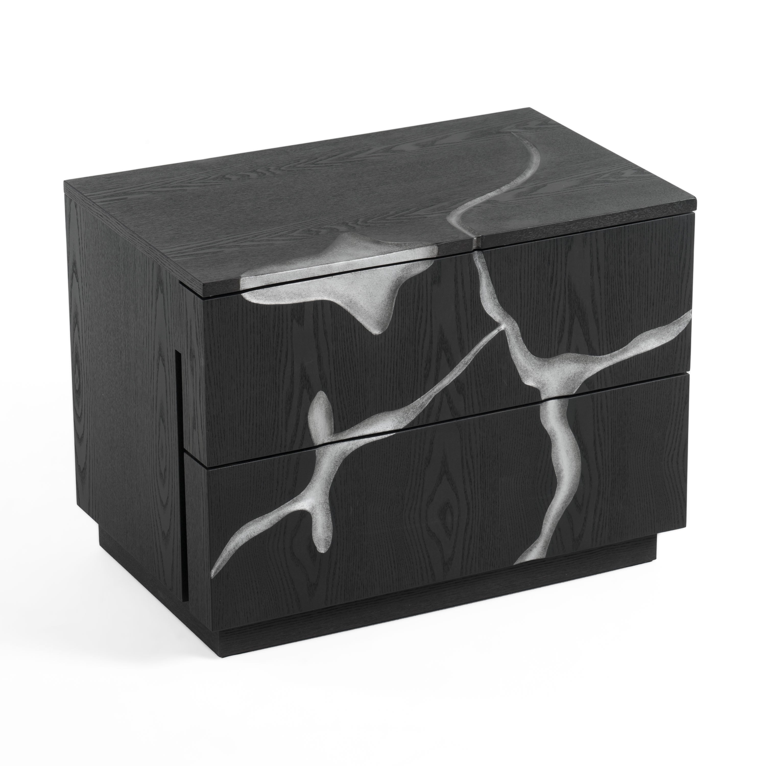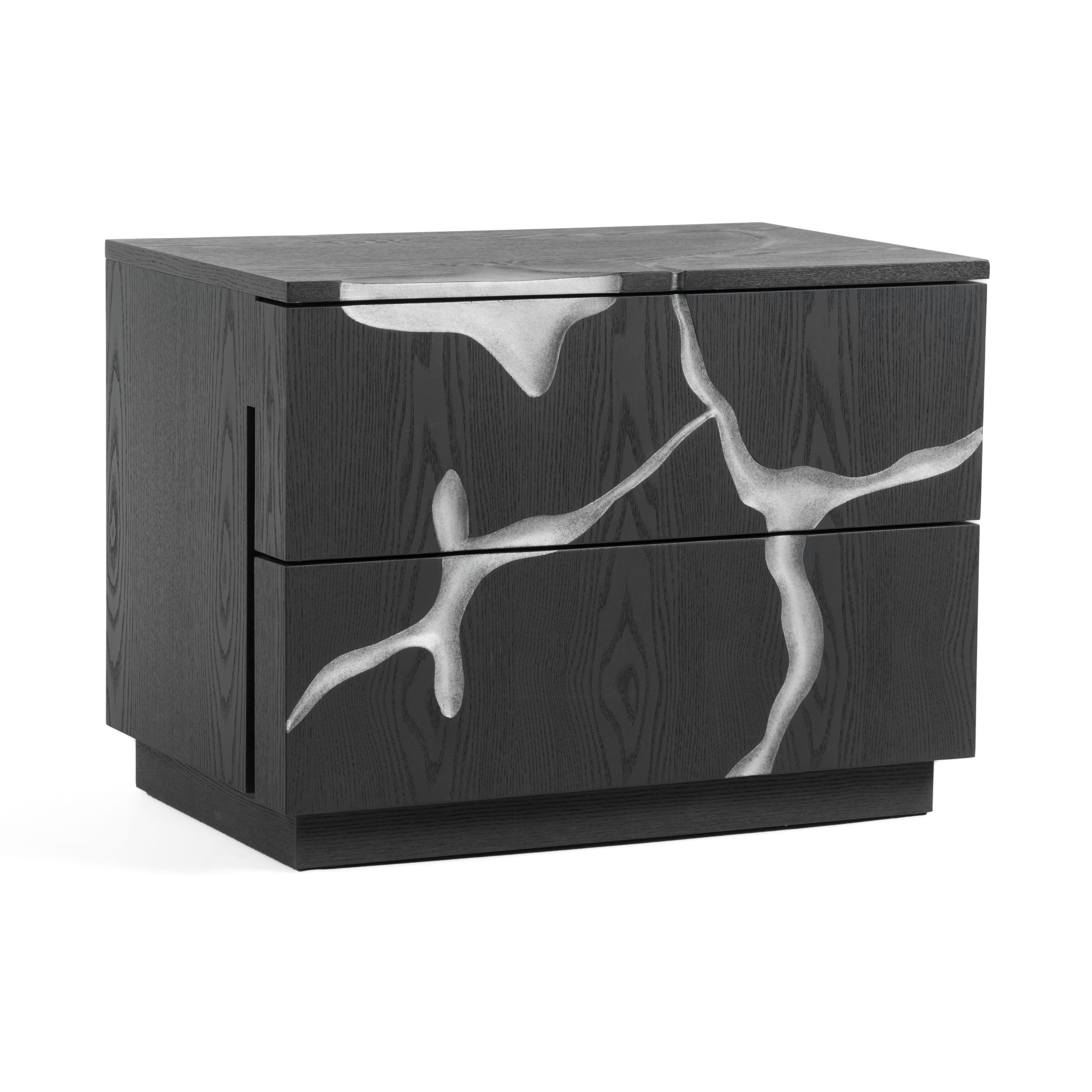Creative craftsmanship emanates from the Modrest Aspen Modern Brown Ash & Silver Nightstand. Featuring a lustrous brown ash finish, it has two spacious soft-closing drawers with pulls located on its side. Artistic silver painted accents that simulate tree branches provide visual appeal along with the hefty brown ash rcolored base. Its top is wide enough to accommodate items within easy reach while in bed. Beyond the storage aspect, this fully assembled modern Aspen Nightstand lends your bedroom a lavish, stunning look!