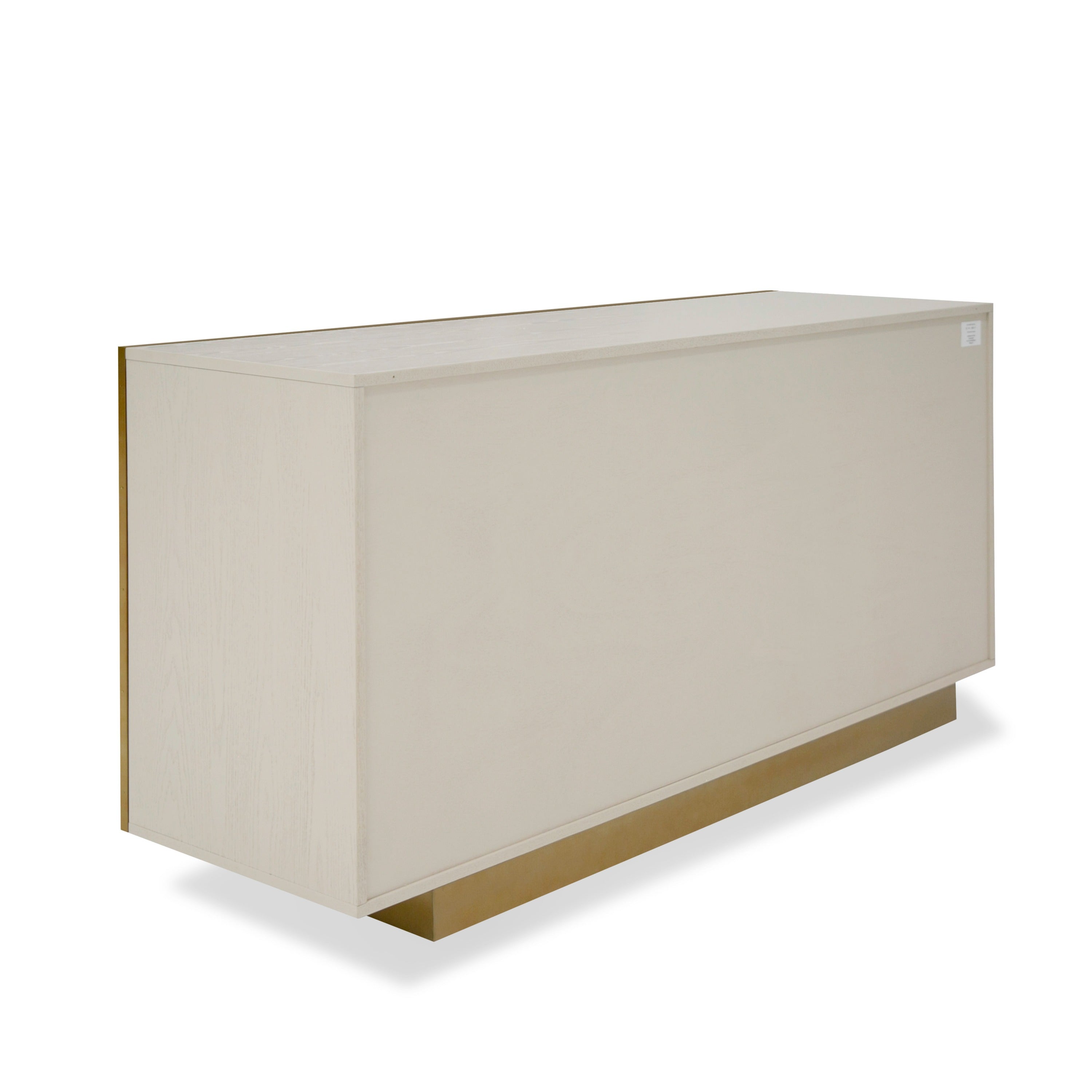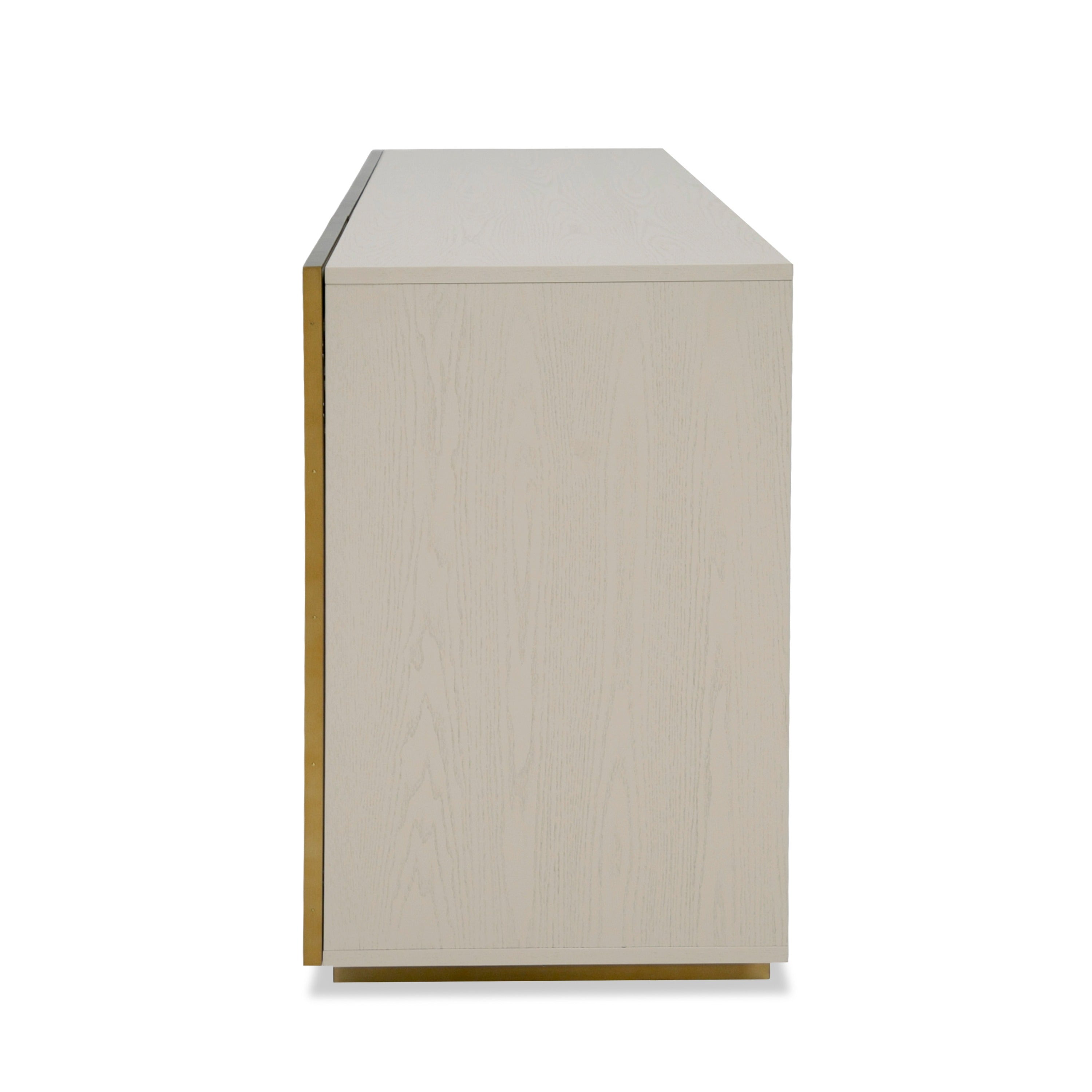 Update your dining room with the Auer Buffet! This modern piece features an abstract contemporary unique design with cream ash wood veneer and brushed gold accents. With three cabinets with shelves, the Auer offers ample space for all of your dining accessories; from platters to glassware, they can be stored safely and neatly inside.