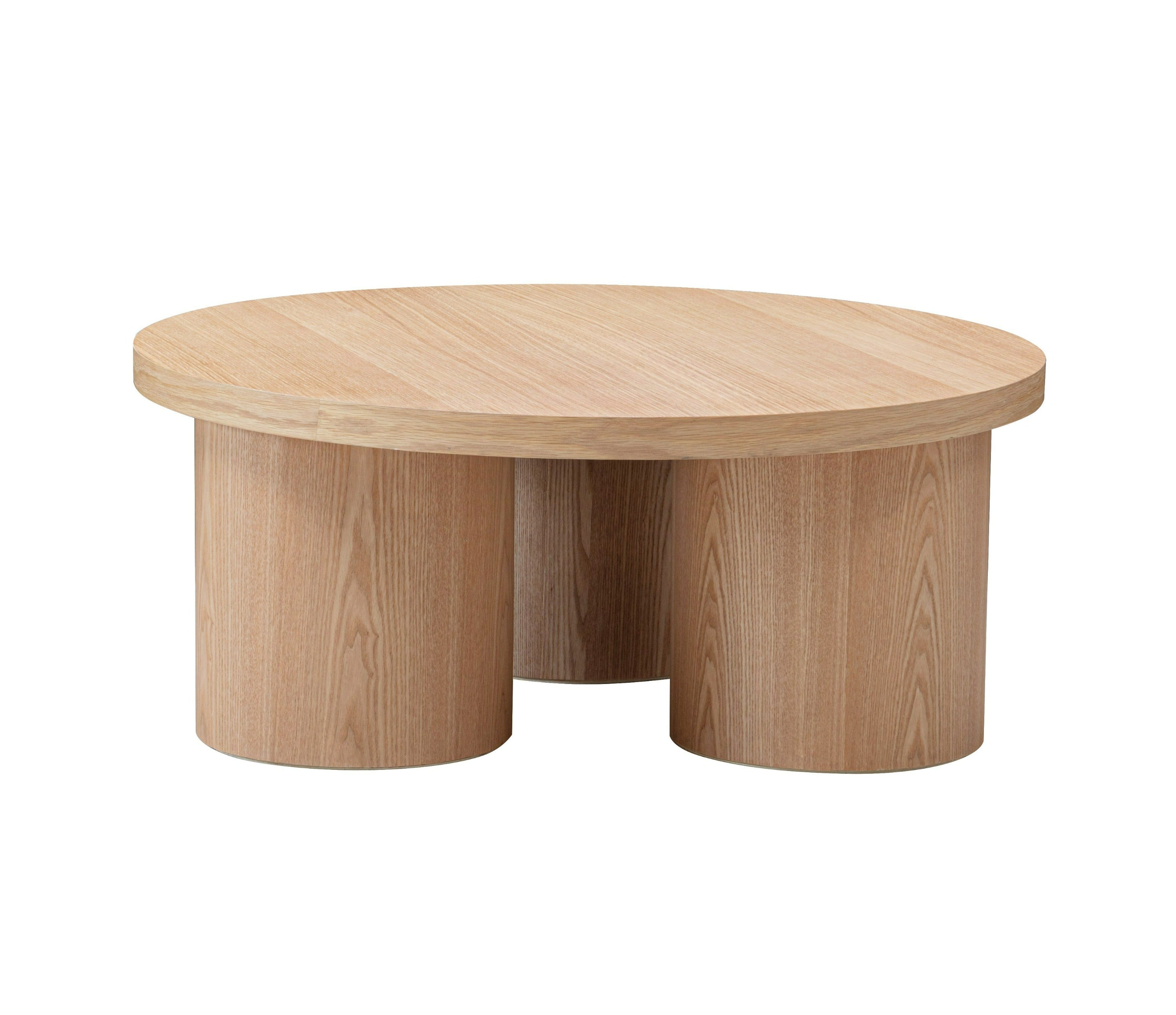 The Modrest Babson is a modern round coffee table with a sleek design. Crafted from solid oak and manufactured wood, it features a sophisticated natural oak veneer finish. Supported by three legs, this coffee table adds an elegant touch to any living space.