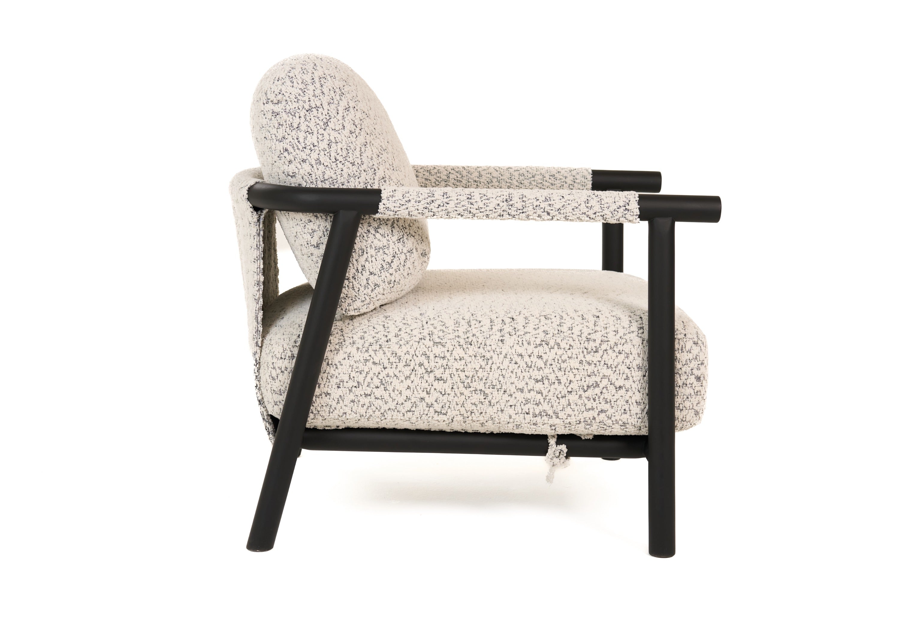 The Modrest Balko accent chair features a modern design with a plush grey fabric upholstery that invites relaxation. Its soft, textured surface contrasts beautifully with the sleek black metal frame and armrests, creating a stylish yet comfortable seating option. The chair s minimalist silhouette is perfect for contemporary interiors, adding both functionality and a chic aesthetic to any space. The overall look is effortlessly inviting, making it an ideal choice for cozy living areas.