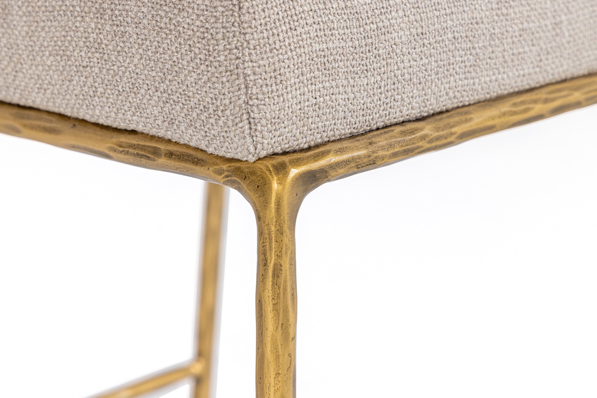 The Modrest Beasley Counter Chair exudes modern elegance with its chic beige linen upholstery and sleek brass frame. Its minimalist design features a gently contoured back and a plush seat, perfect for comfortable seating at a counter or bar. The combination of warm fabric and metallic accents creates a sophisticated look that complements various interior styles, making it an ideal addition to contemporary kitchens and dining areas.