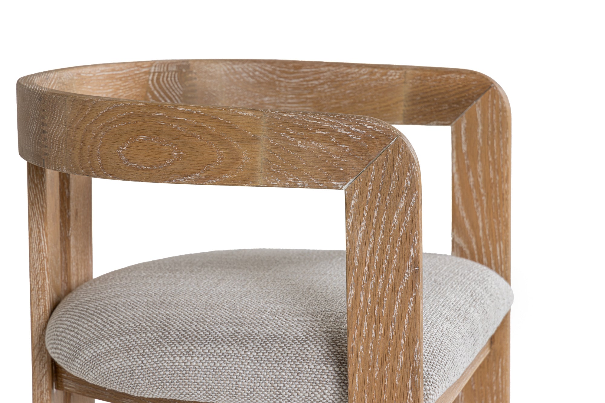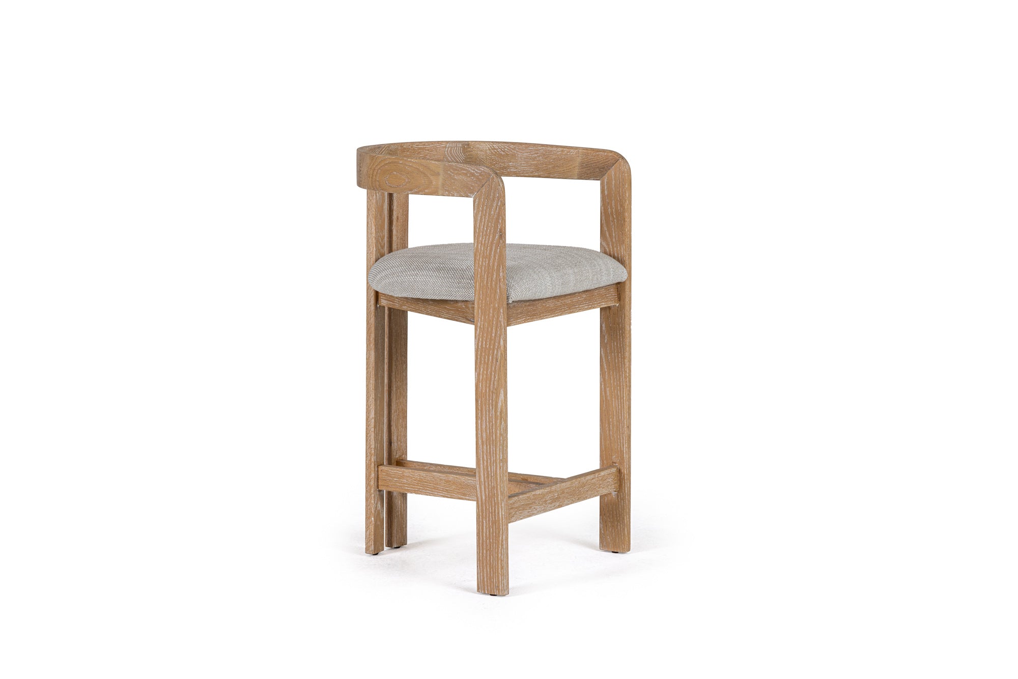 The Modrest Belton is a modern counter chair that exudes a chic simplicity. Featuring a softly curved backrest and a plush off-white fabric seat, it combines comfort with contemporary style. The white wash oak frame adds a warm, neutral touch, enhancing its suitability for various décor themes. This counter stool's elegant design makes it a perfect addition to kitchen islands or home bars, promising both aesthetic appeal and functional seating. Crafted for relaxed gatherings, it beautifully complements any modern interior.