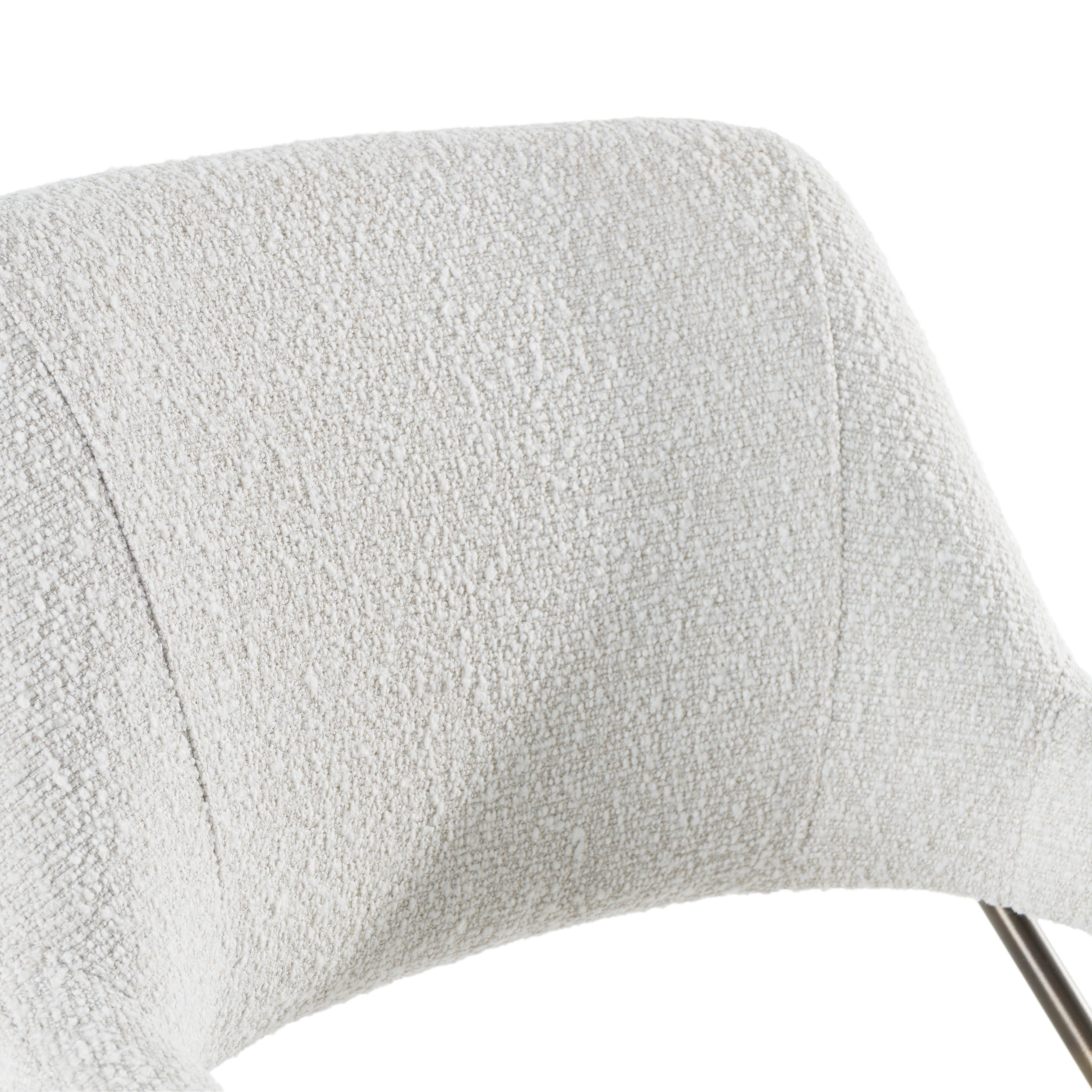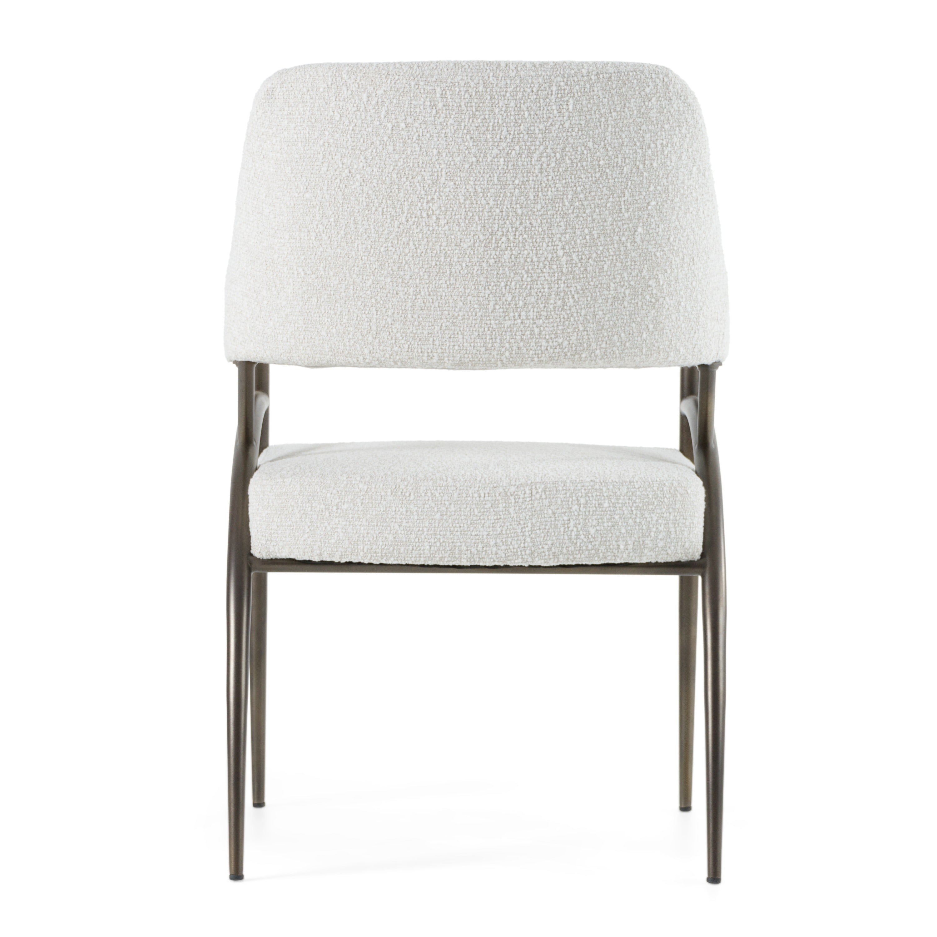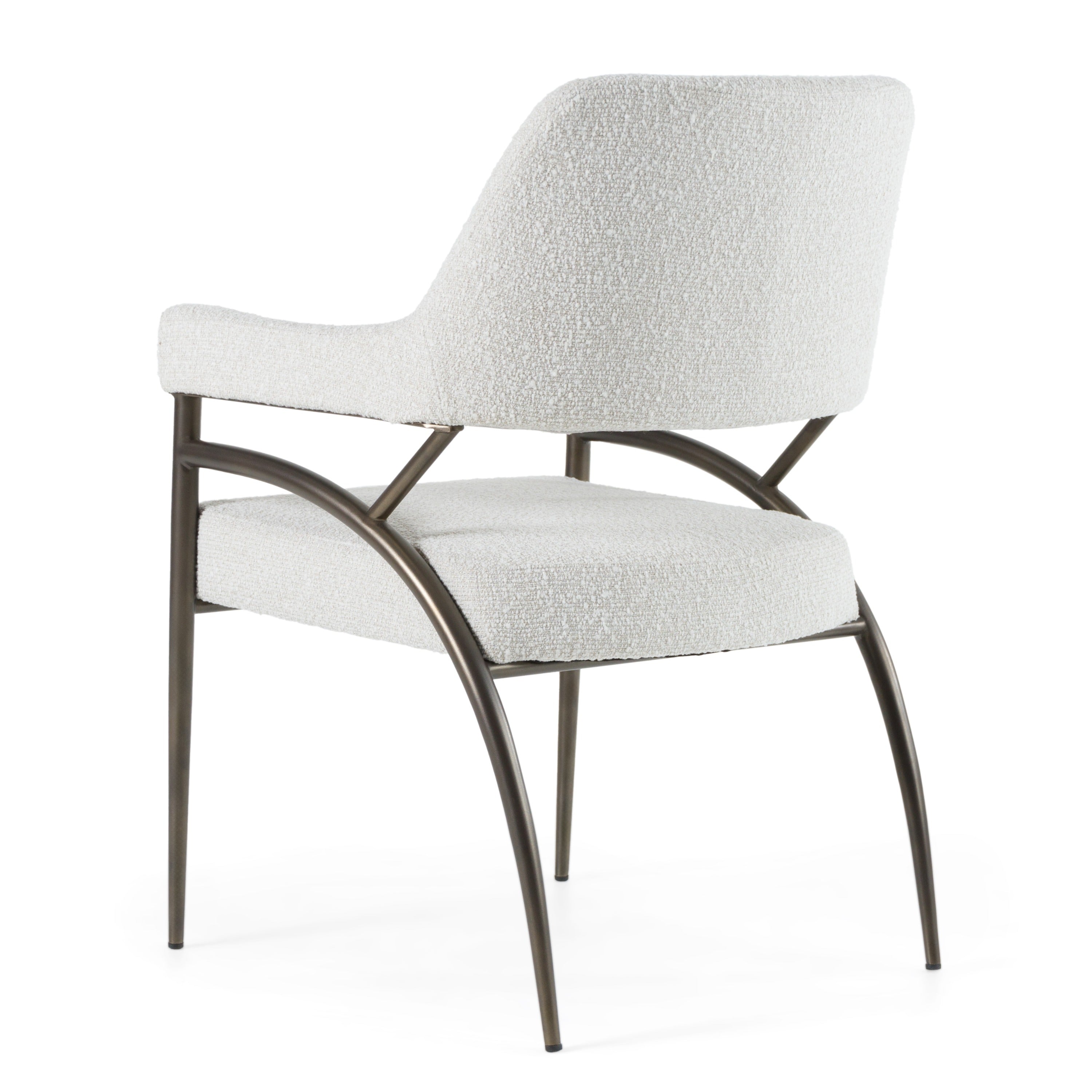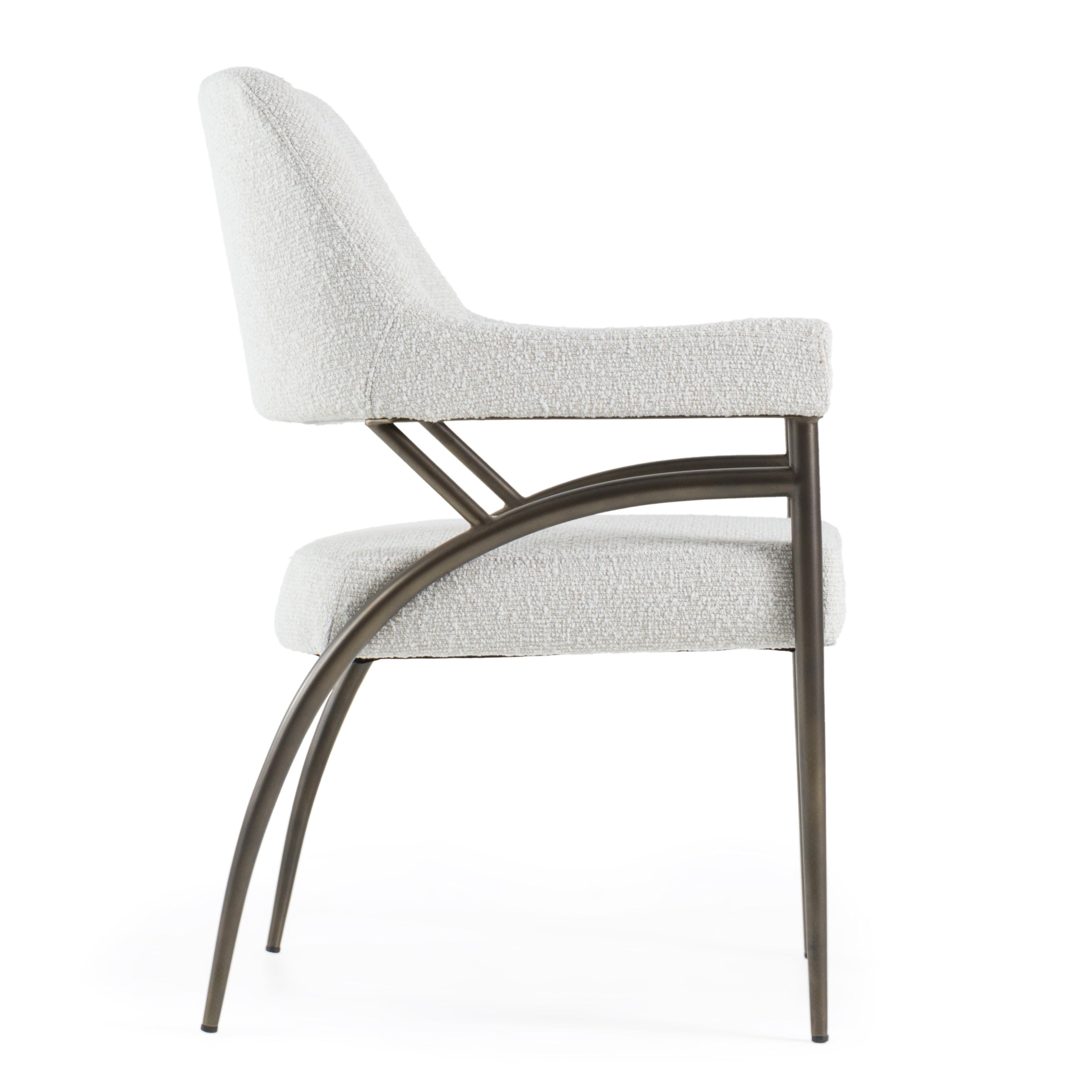 The Modrest Betty - Modern Off-White Fabric & Bronze Dining Arm Chair presents a striking balance between modern sophistication and understated luxury. Upholstered in soft, off-white polyester fabric, this chair envelops you in comfort while its bronze iron frame exudes a timeless elegance. The fluid lines of its cross-back design and elegantly tapered legs offer a refined yet contemporary touch, making it an ideal accent for chic, upscale dining settings. Perfectly crafted for those who appreciate the fusion of artistry and comfort, this piece effortlessly enhances the ambiance of a modern home, inviting guests to dine in unparalleled style.