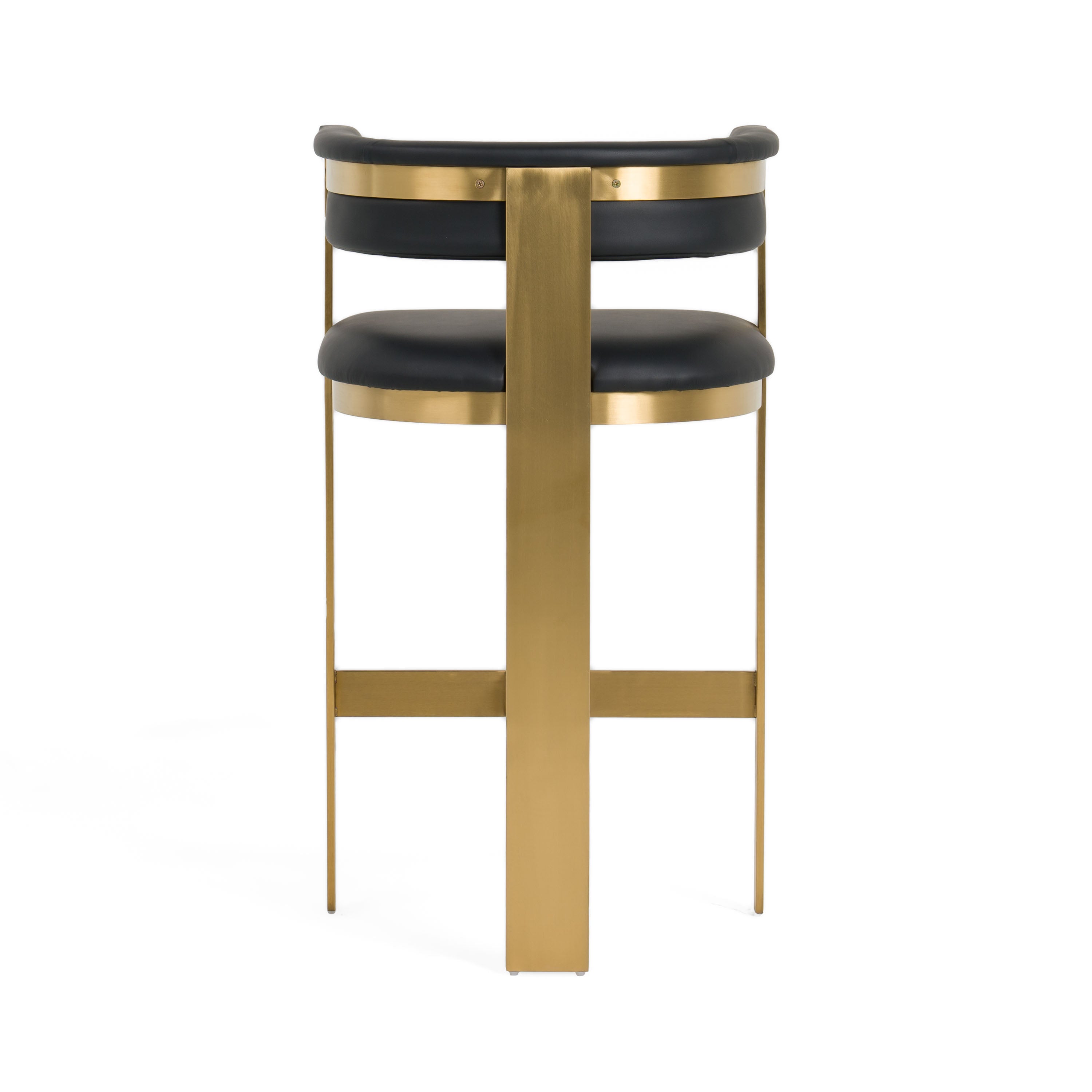 Update your dining room with the Boswell Barstool! This stunning piece features a rounded seat design with a polished gold metal frame and faux leather seat cushions. The silhouette evokes an Art Deco style while the materials hint at a modern piece. The faux leather is available in both white and black.